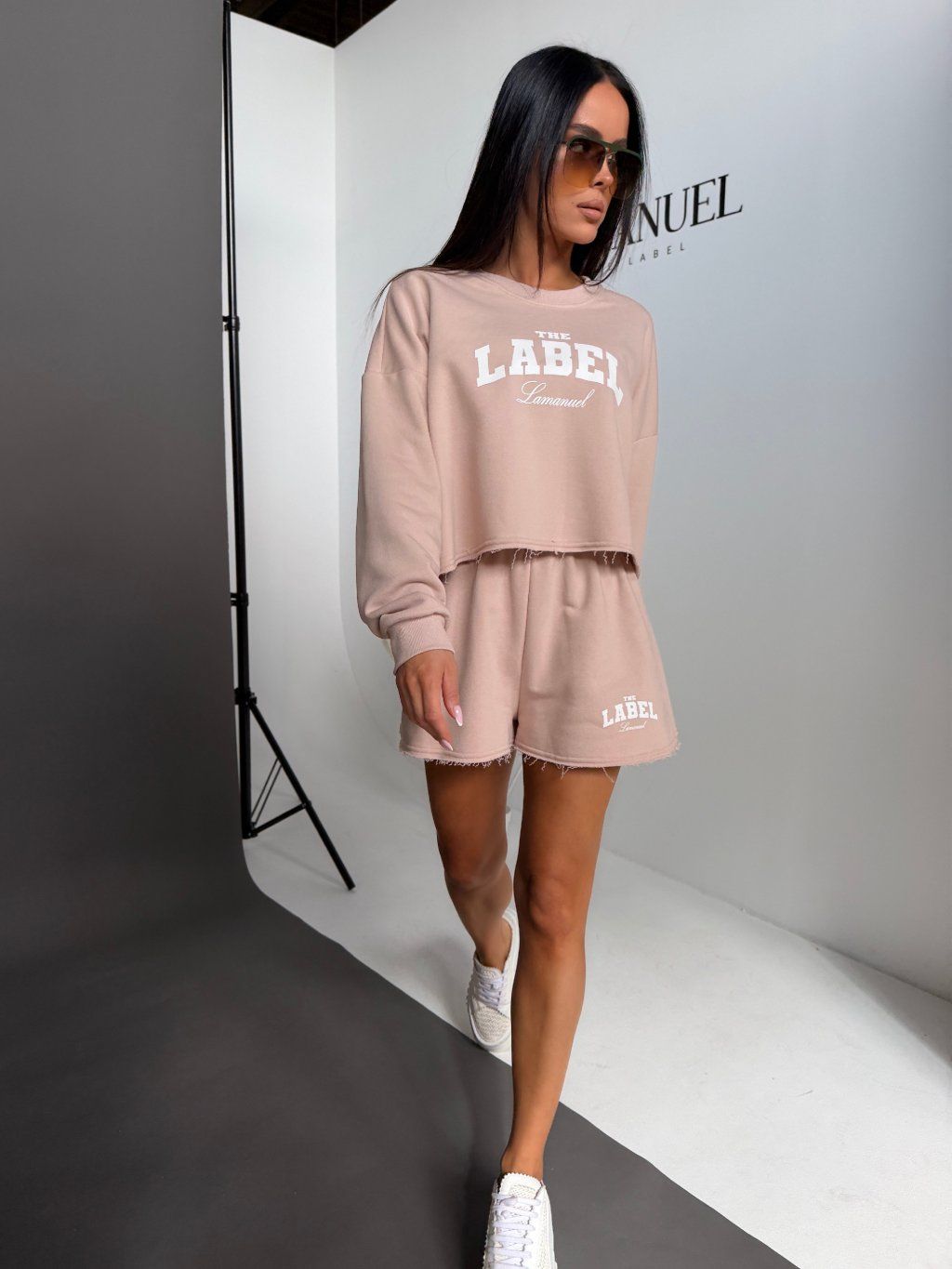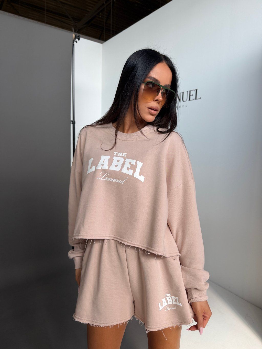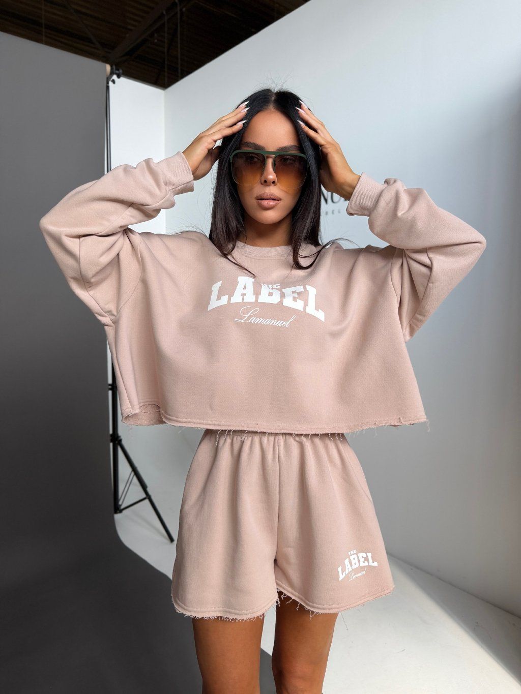 Oversize mikina so zníženou líniou ramien pôsobí uvoľnene a moderne, zatiaľ čo krátke šortky s elastickým pásom krásne sedia na postave a zvýraznia nohy.