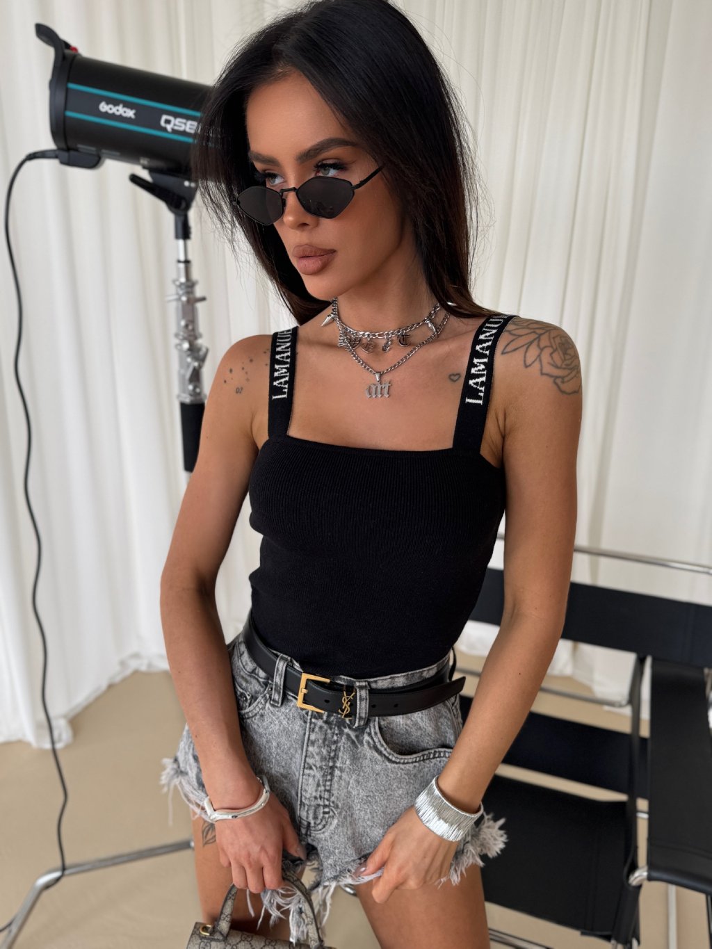 Rebrovaný top z kvalitnej pletacej priadze, prispôsobiteľný postave. Má elastické ramienka s logom, ktoré mu dodávajú športový, ale elegantný charakter. Vďaka minimalistickému dizajnu sa hodí k džínsom aj elegantnejším outfitom.