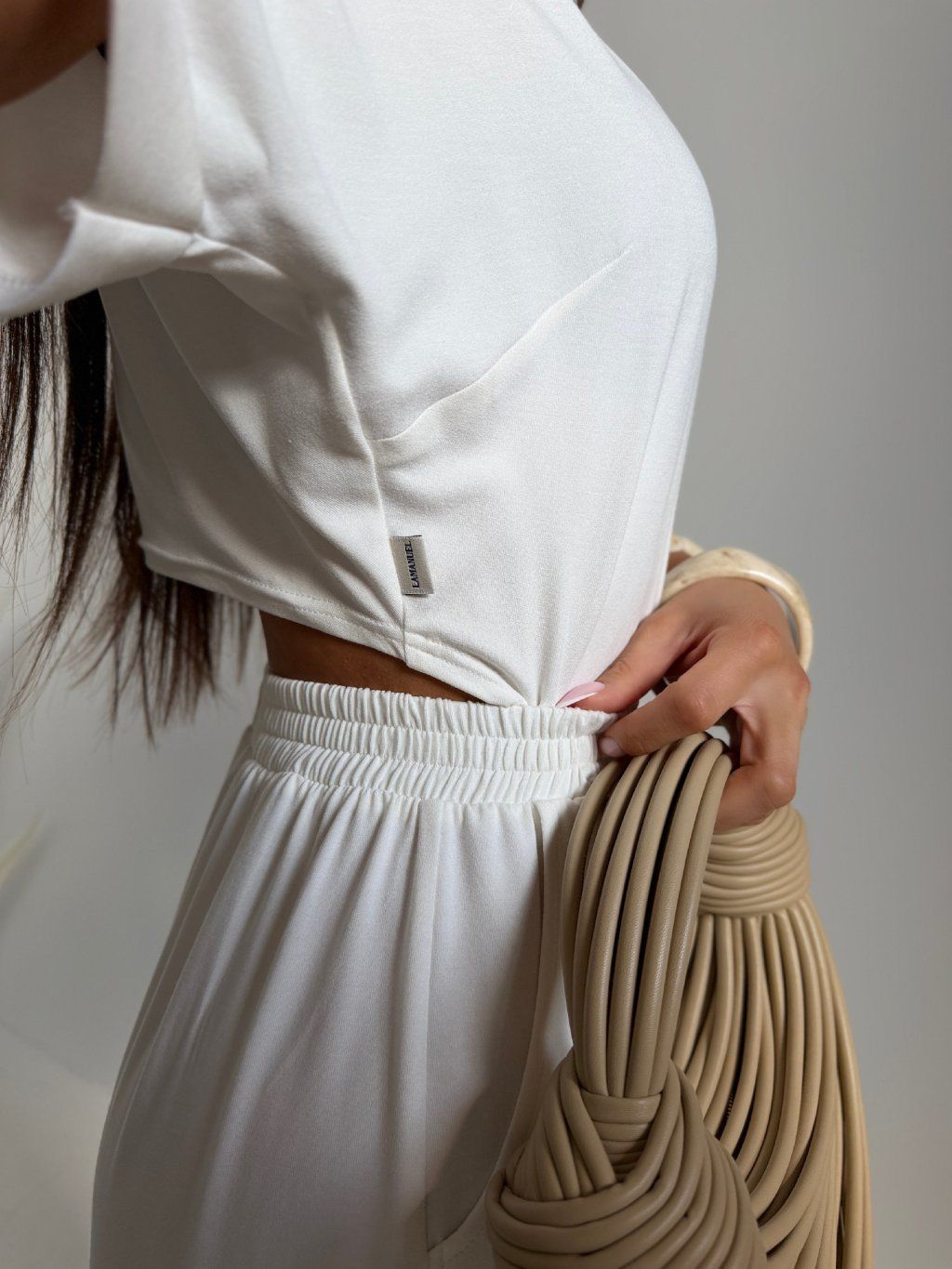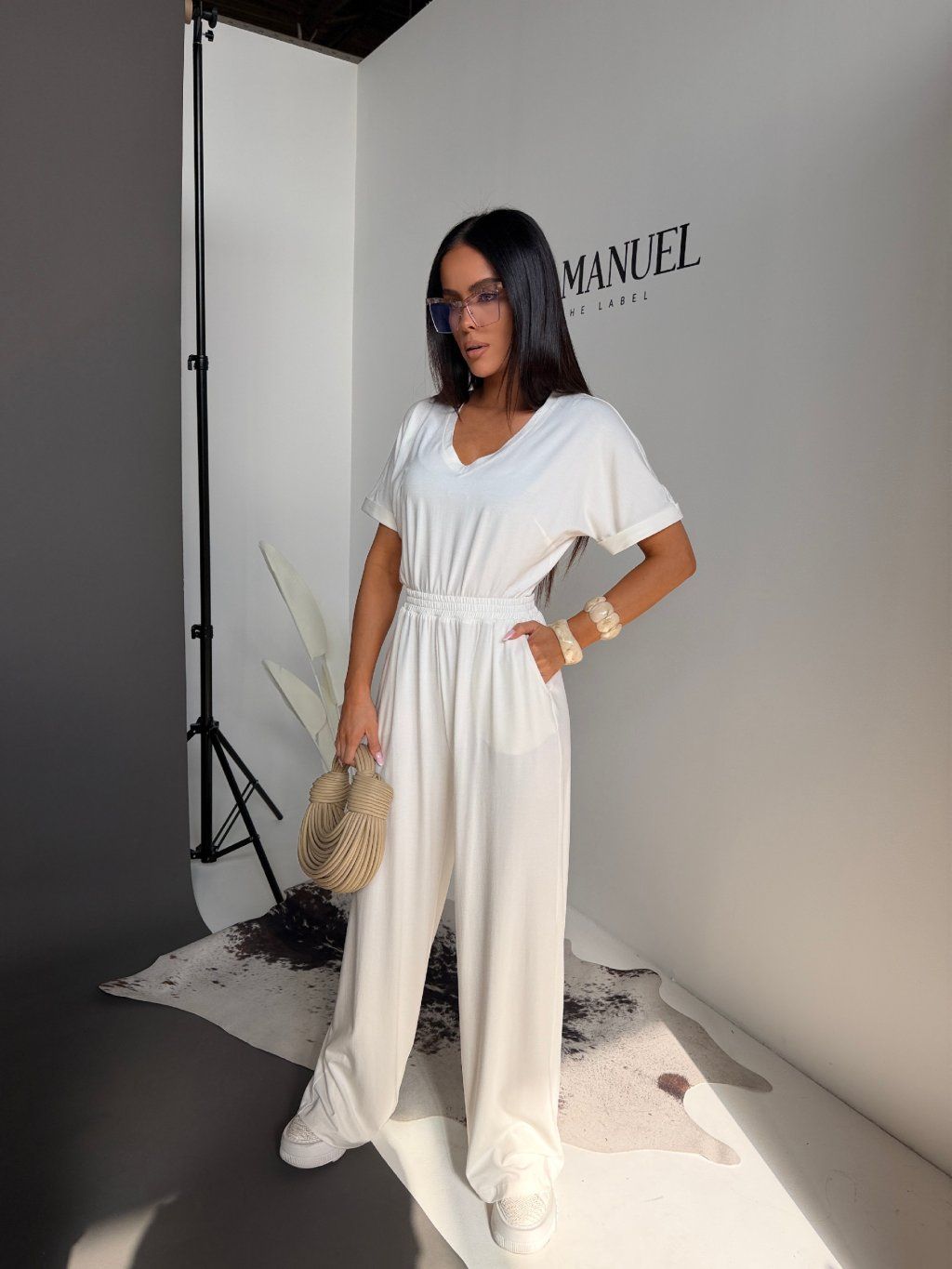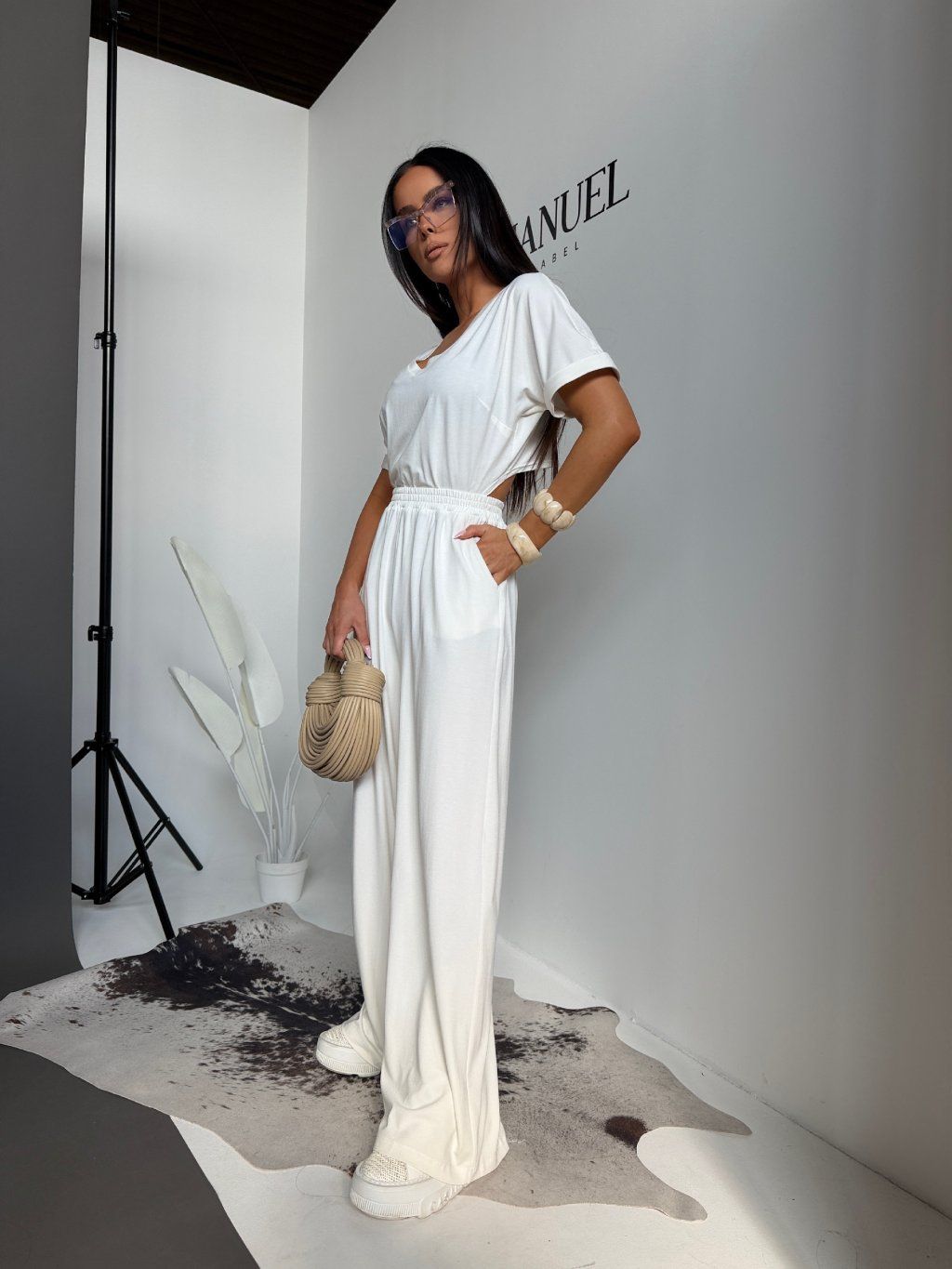 Vrchní část vytváří efekt jemně přišitého trička, které přechází do kalhot. Tento detail dodává modelu vrstvený, stylový vzhled bez nutnosti kombinování.
