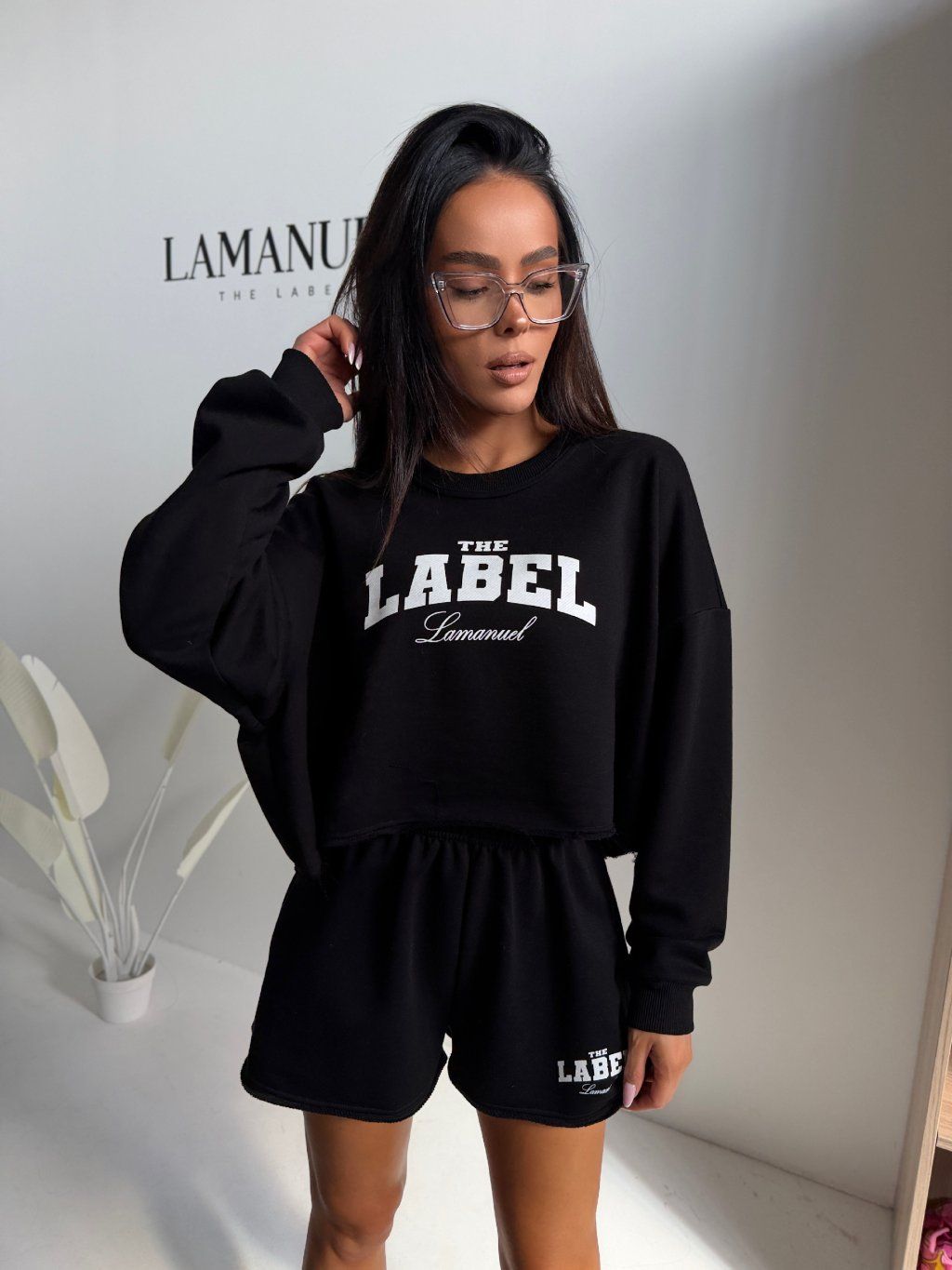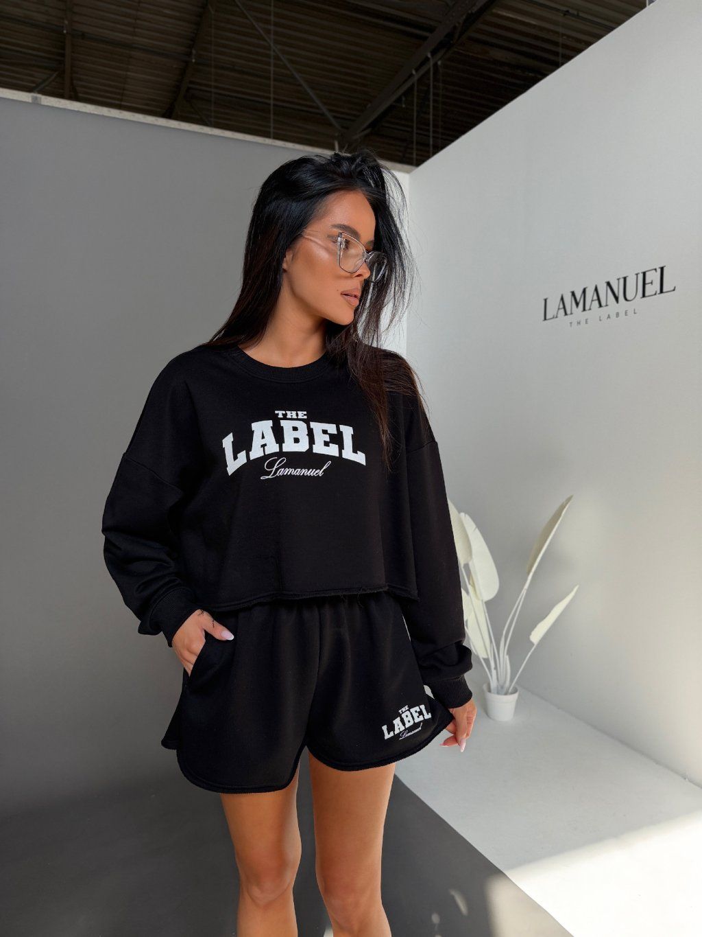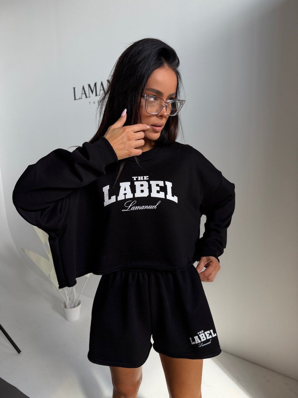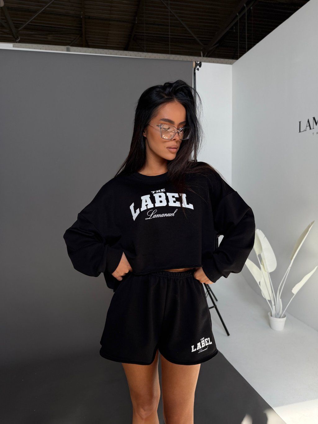 Oversize mikina s nižší linií ramen působí uvolněně a moderně, zatímco krátké šortky s elastickým pasem krásně sedí na postavě a zvýrazní nohy.