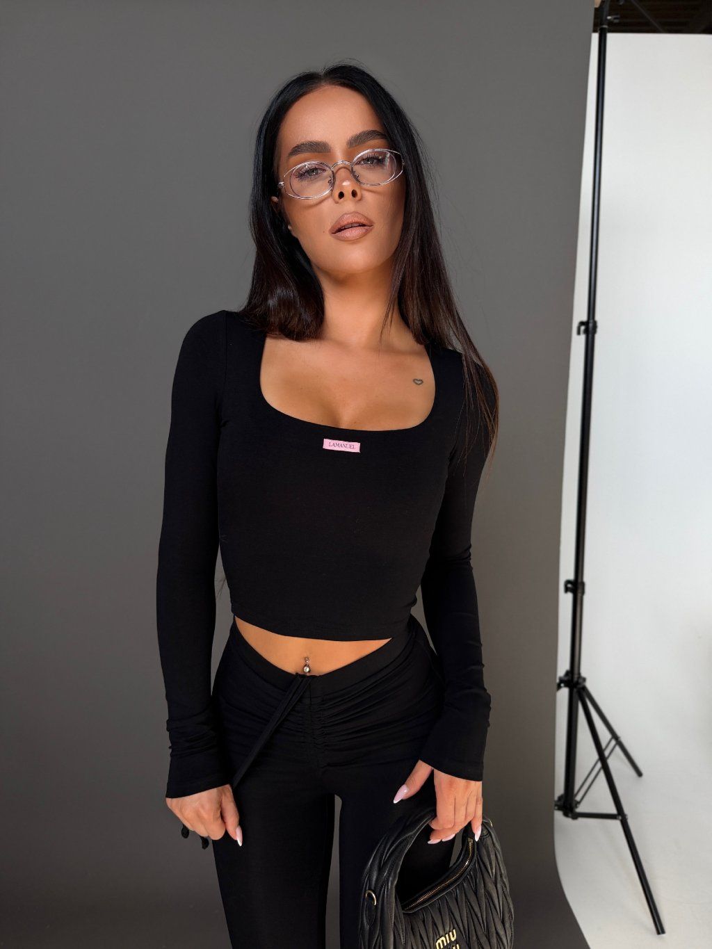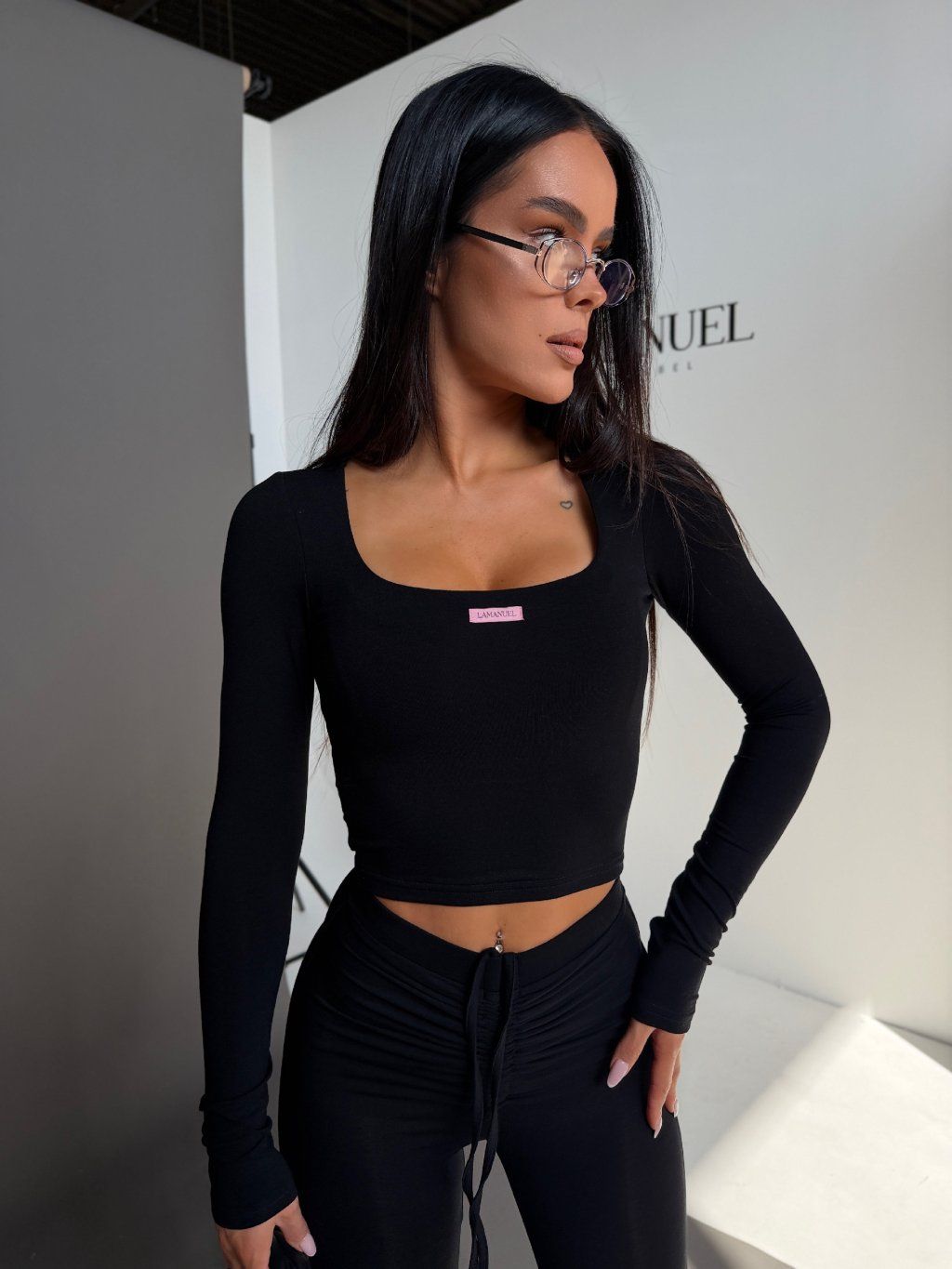 Přiléhavý top s dlouhým rukávem a jemně hranatým výstřihem formuje horní část siluety, zatímco legíny s vysokým pasem a detailem v pase opticky prodlužují nohy a zvýrazňují pas.