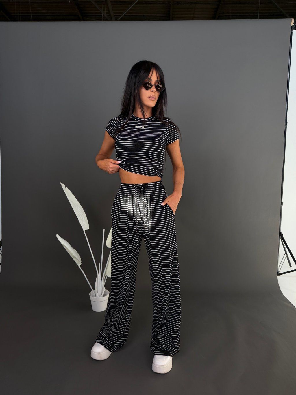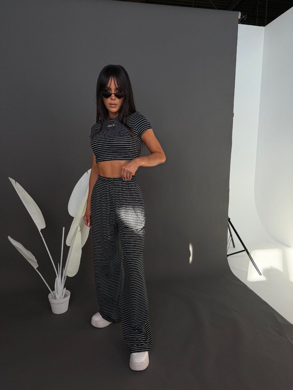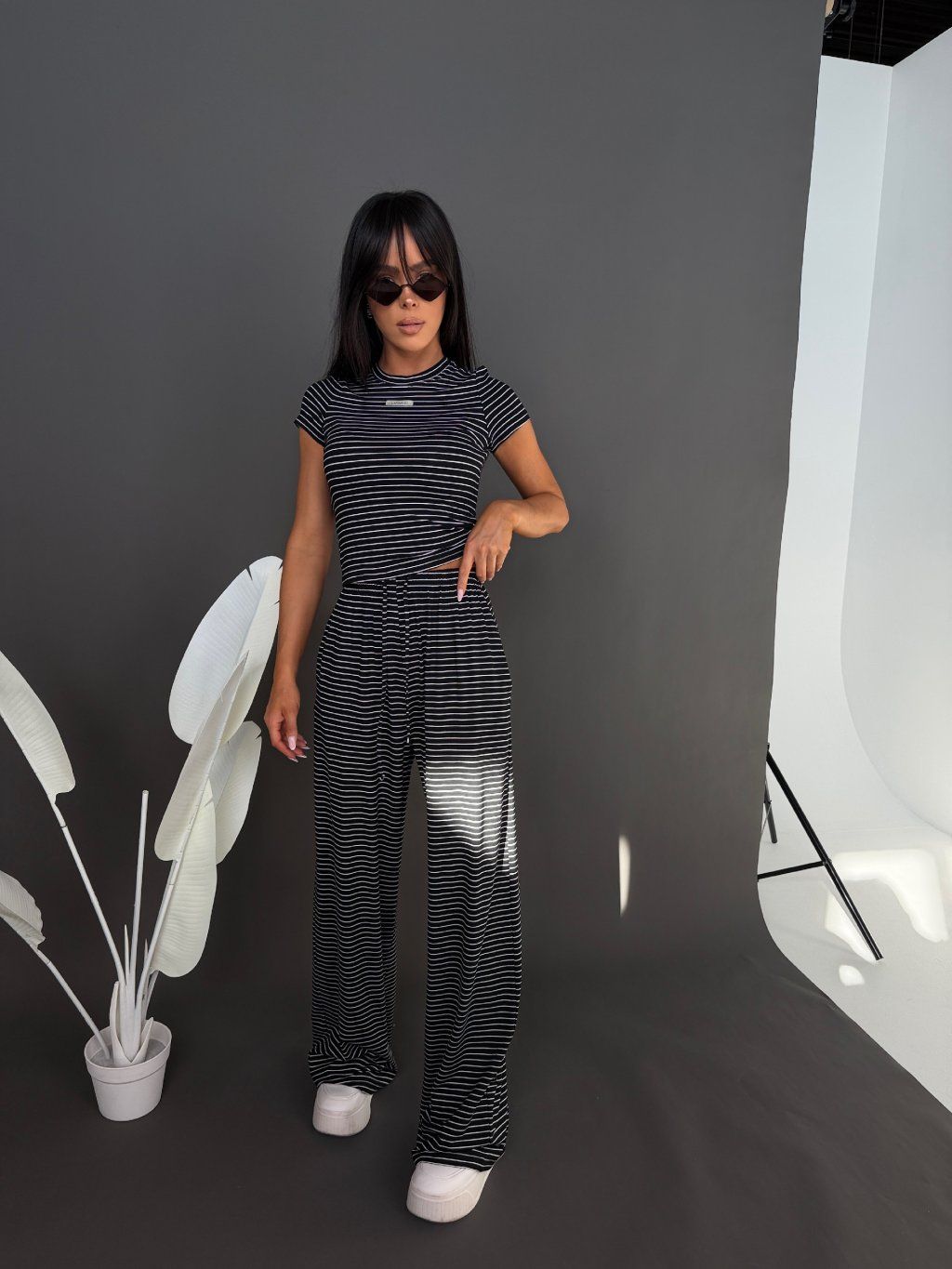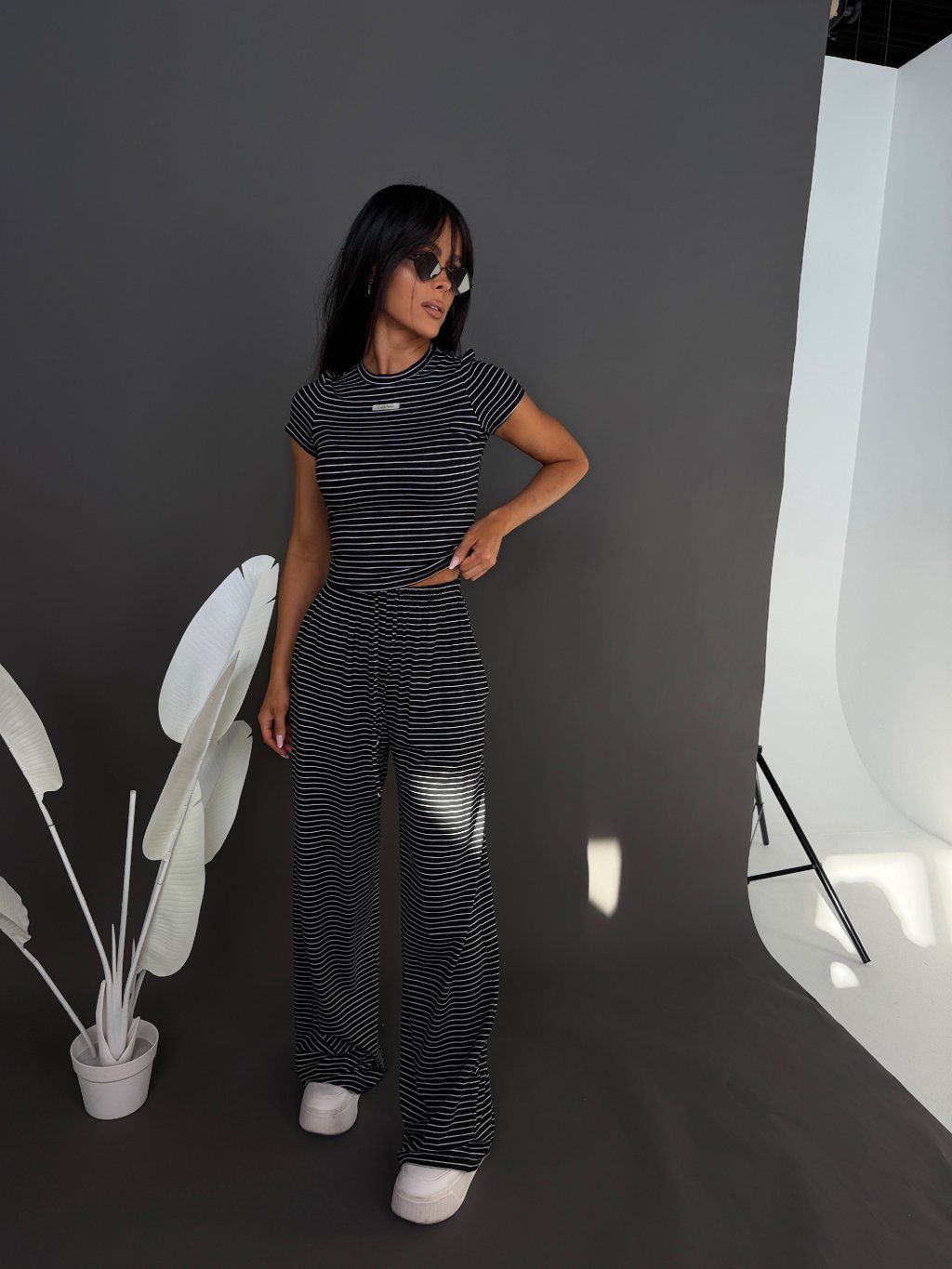 Top s klasickým střihem krásně sedí na postavě a vytváří vyvážený kontrast k volnějším kalhotám. Celý outfit působí minimalisticky, čistě a moderně – bez zbytečné námahy.