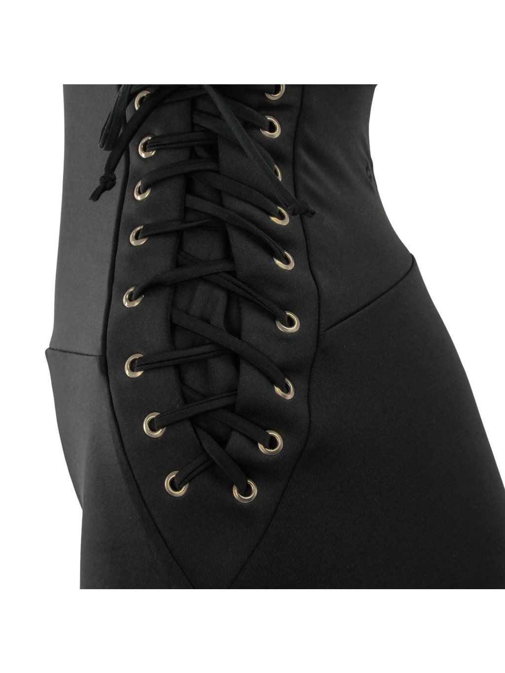 Šněrovací detail vzadu vytváří korzetový efekt, který opticky zužuje pas a formuje postavu. Vysoký pas krásně drží siluetu.