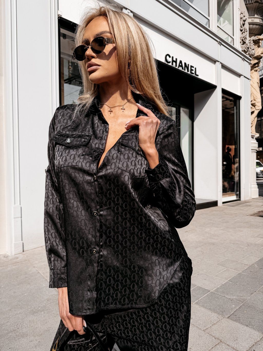 Košile má klasický límec, zapínání na knoflíky a jemný monogram po celé látce. Volný střih doplňují kapsy a detail na zádech.