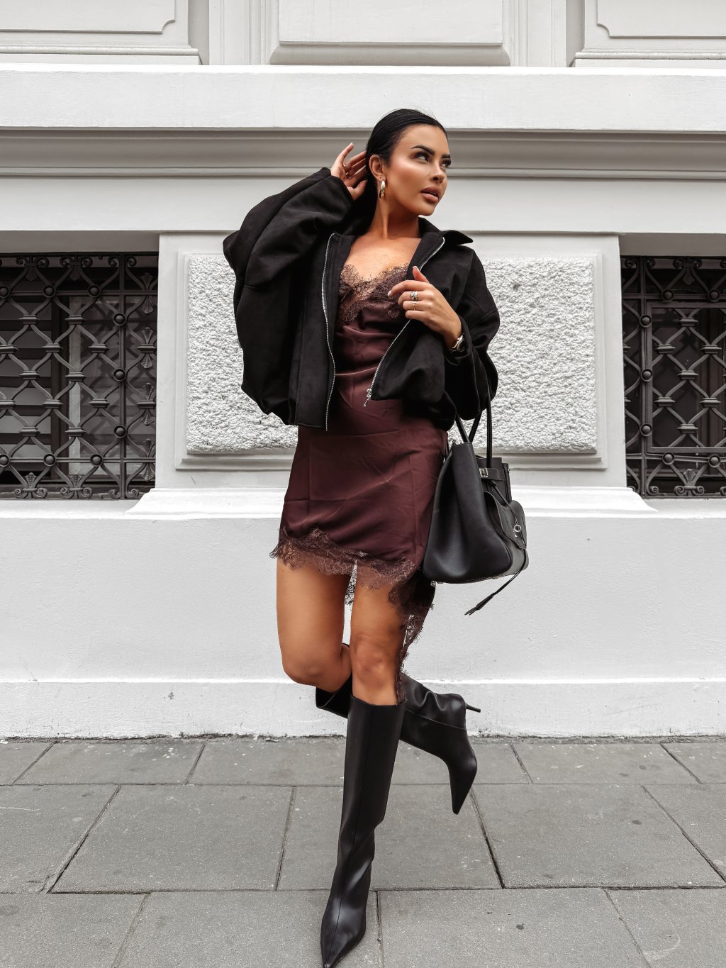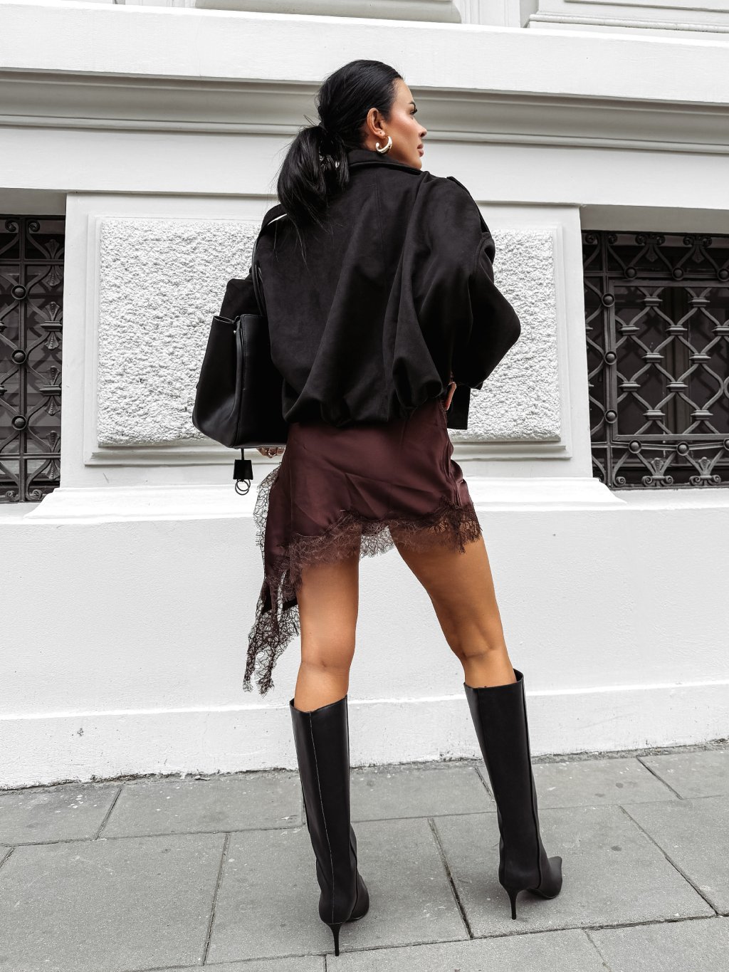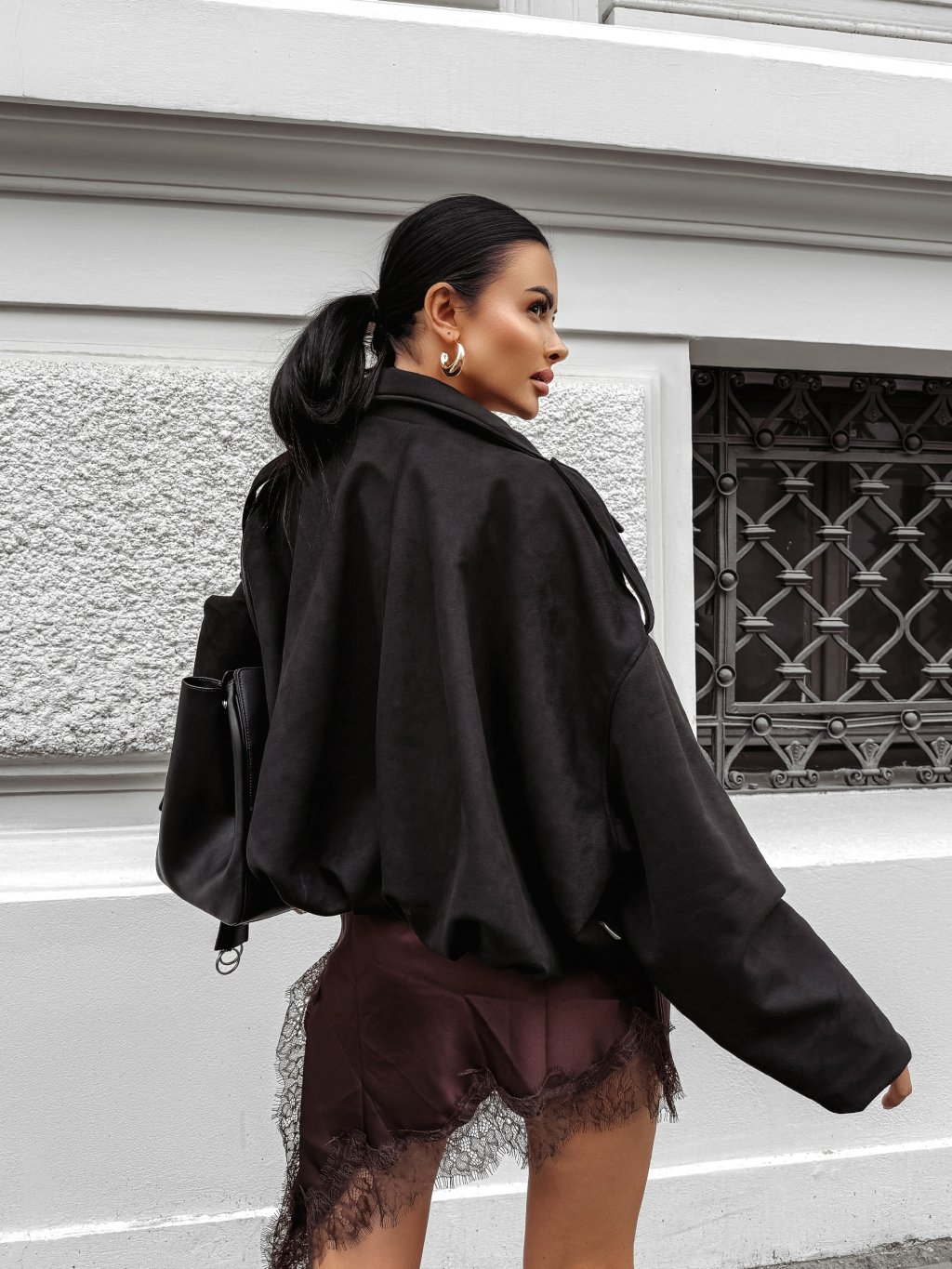 Casualova bunda s mierne oversized strihom. Vyrobená z materiálu príjemného na dotyk, ktorý imituje semiš. Skryté zipsové zapínanie . Klasický golier, na ramene ozdobné klapky. Spodná časť je zakončená jemným sťahovaním.