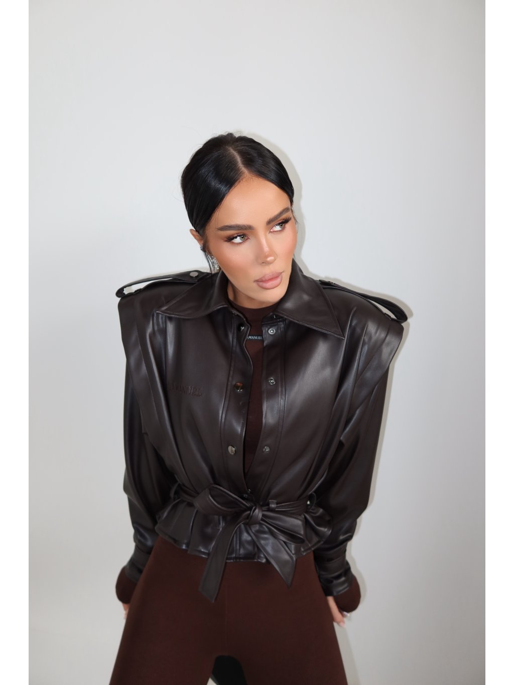 Bunda z imitácie kože s miernym leskom a štruktúrovaným strihom. Model sa zapína na patentky, s klasickým golierom a širokými rukávmi zakončenými manžetou s opaskom. Ramenné vypchávky a prešívanie odkazujú na tvar trenčkotu a opasok v páse umožňuje zdôrazniť siluetu alebo nosiť bundu uvoľneným spôsobom. Vyšívané tónové logo na hrudi. Ideálne pre celkový vzhľad, ale aj ako výrazný akcent v jednoduchom outfite.