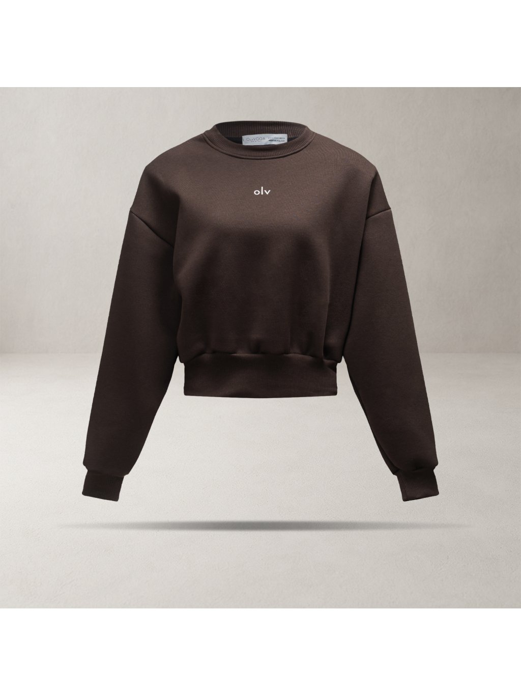 Mikina bez kapucne, s kratším strihom. Vyrobená z vysoko kvalitného bavlneného materiálu. Na ramenách sú vankúšiky. Prednú časť zdobí minimalistický nápis OLV.