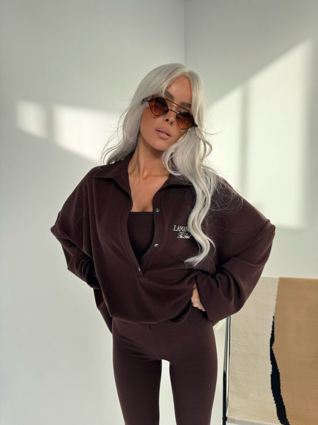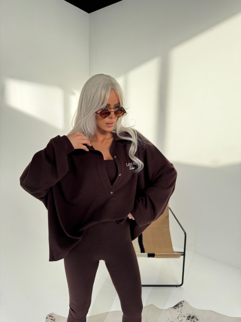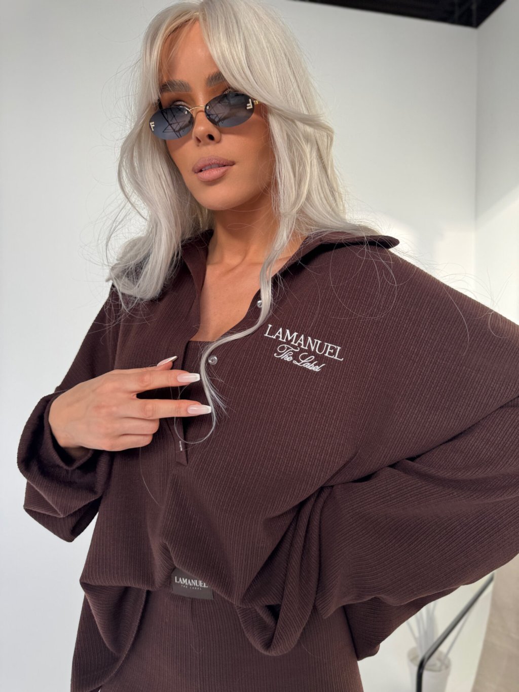 Rebrovaná pletená mikina, ktorá vyzerá ako totálna pohoda, ale má v sebe niečo viac. Rozopnutá pri výstrihu, s objemným golierom a voľným strihom – vytvorená pre vrstvenie, pre voľnosť, aby sa nosila "neformálne", ale s efektom. Výšivka s logom na hrudi tu robí všetku prácu – jemná, no pútavá do očí. Je to typ mikiny, ktorú si oblečiete a už nemusíte nič robiť. Štýl hovorí za seba sám.