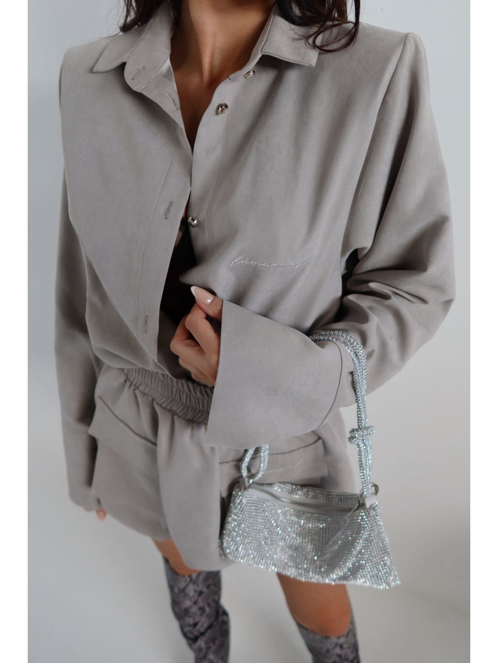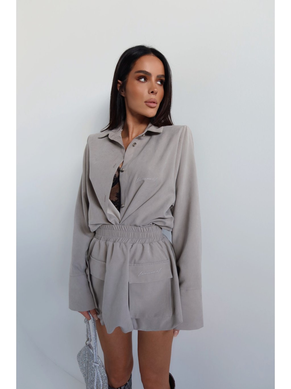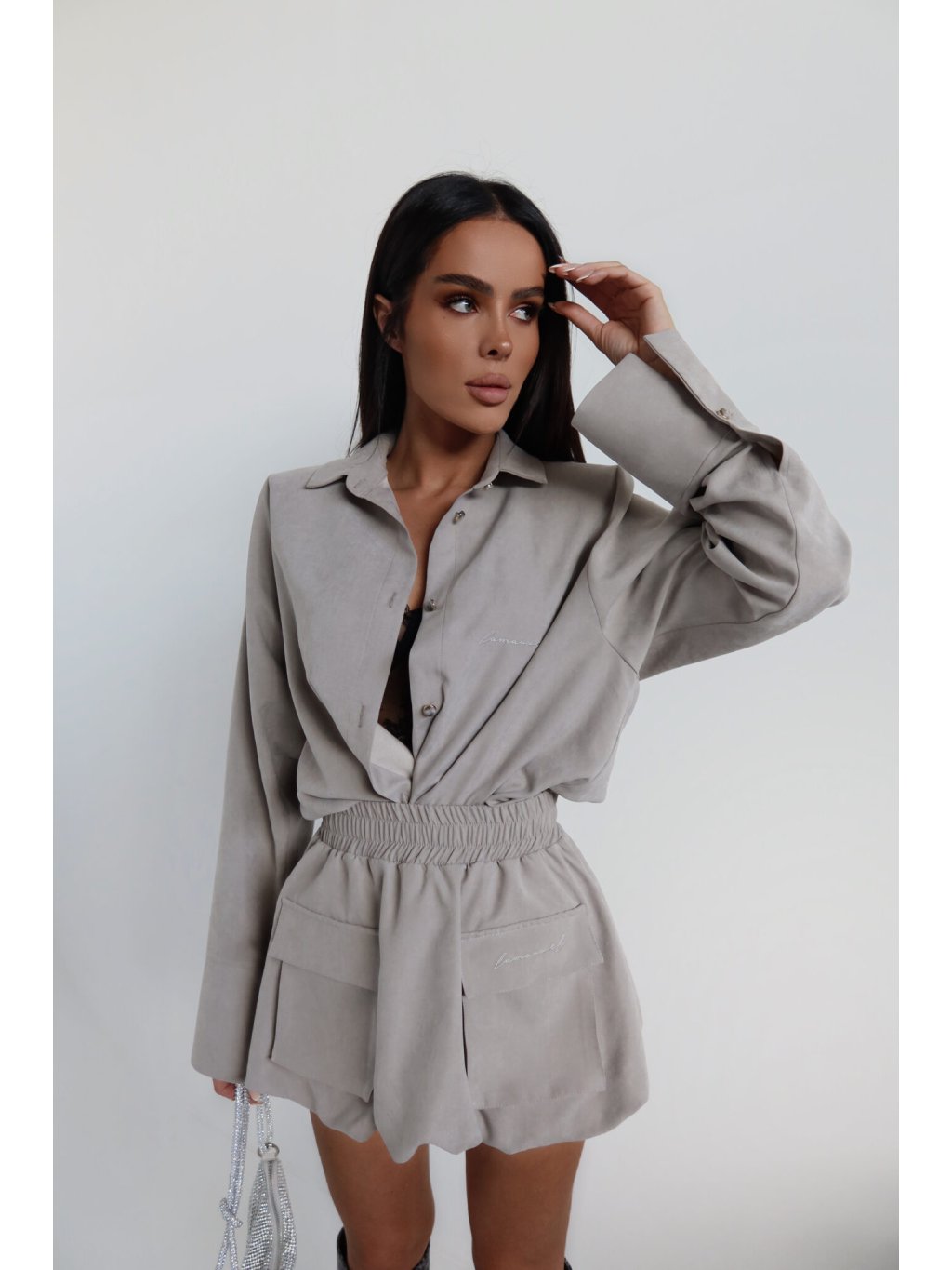 Košeľa voľného strihu s jemne definovanou líniou ramien vďaka všitým vankúšikom. Klasický golier a jednoduchý tvar prerušuje jemný, semišový povrch a dlhšie rukávy so širokou manžetou. Zapínanie na gombíky a vyšívané logo dodávajú celku minimalistický nádych. Bude skvele fungovať ako súprava aj sólo.