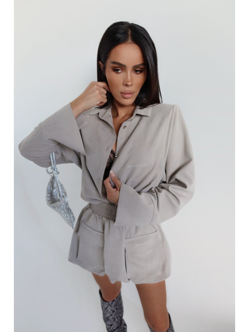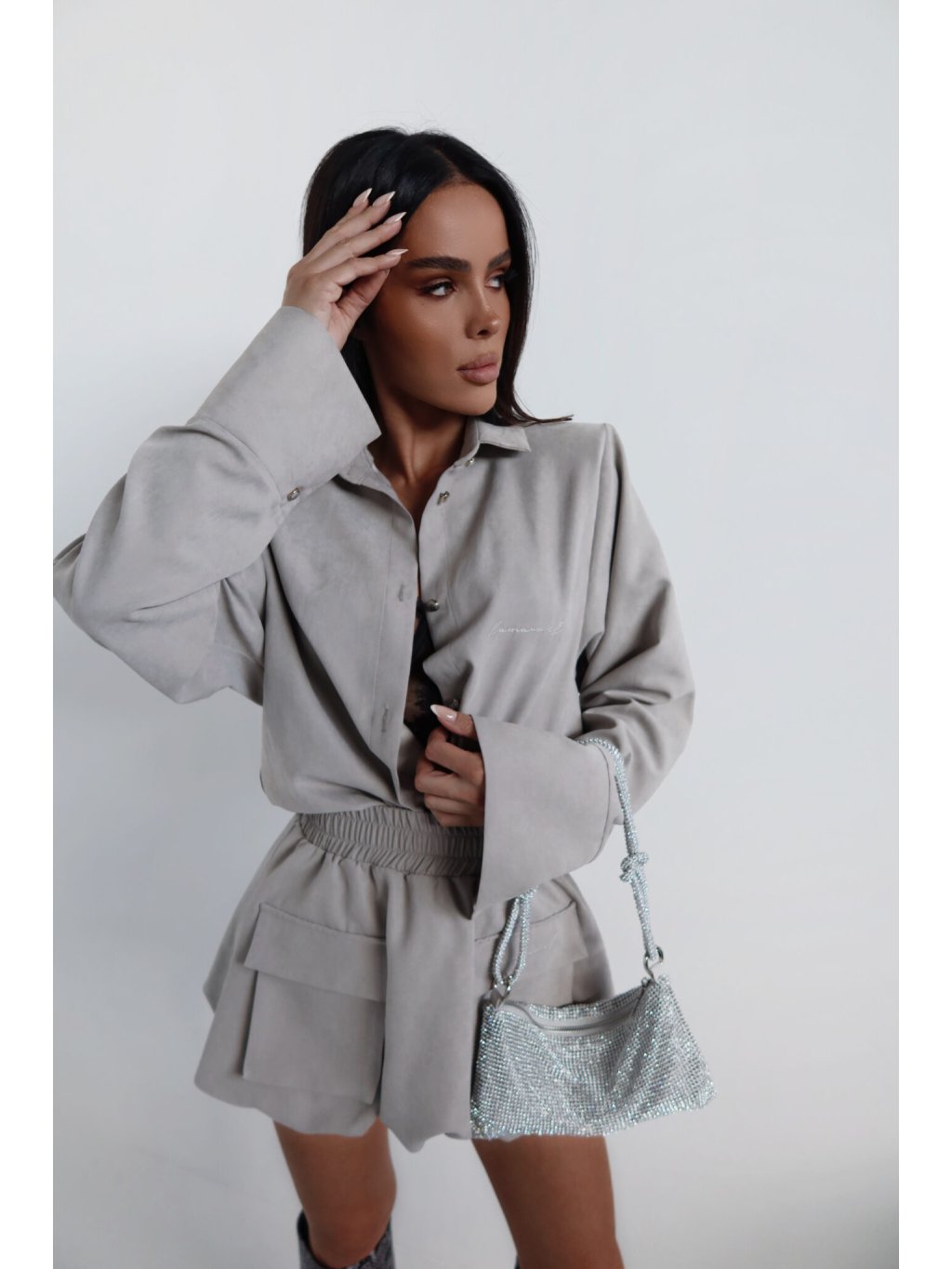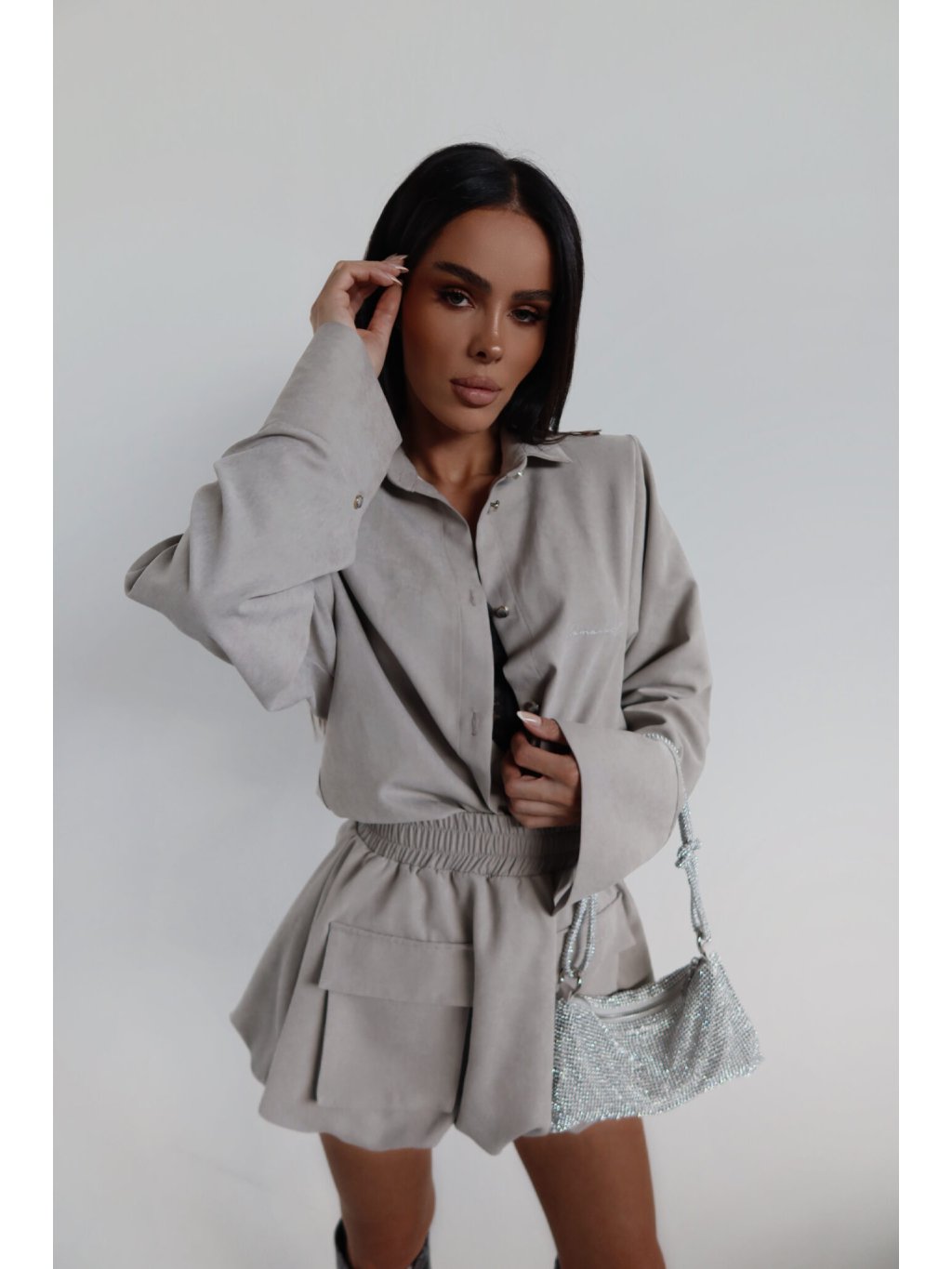 Košeľa voľného strihu s jemne definovanou líniou ramien vďaka všitým vankúšikom. Klasický golier a jednoduchý tvar prerušuje jemný, semišový povrch a dlhšie rukávy so širokou manžetou. Zapínanie na gombíky a vyšívané logo dodávajú celku minimalistický nádych. Bude skvele fungovať ako súprava aj sólo.