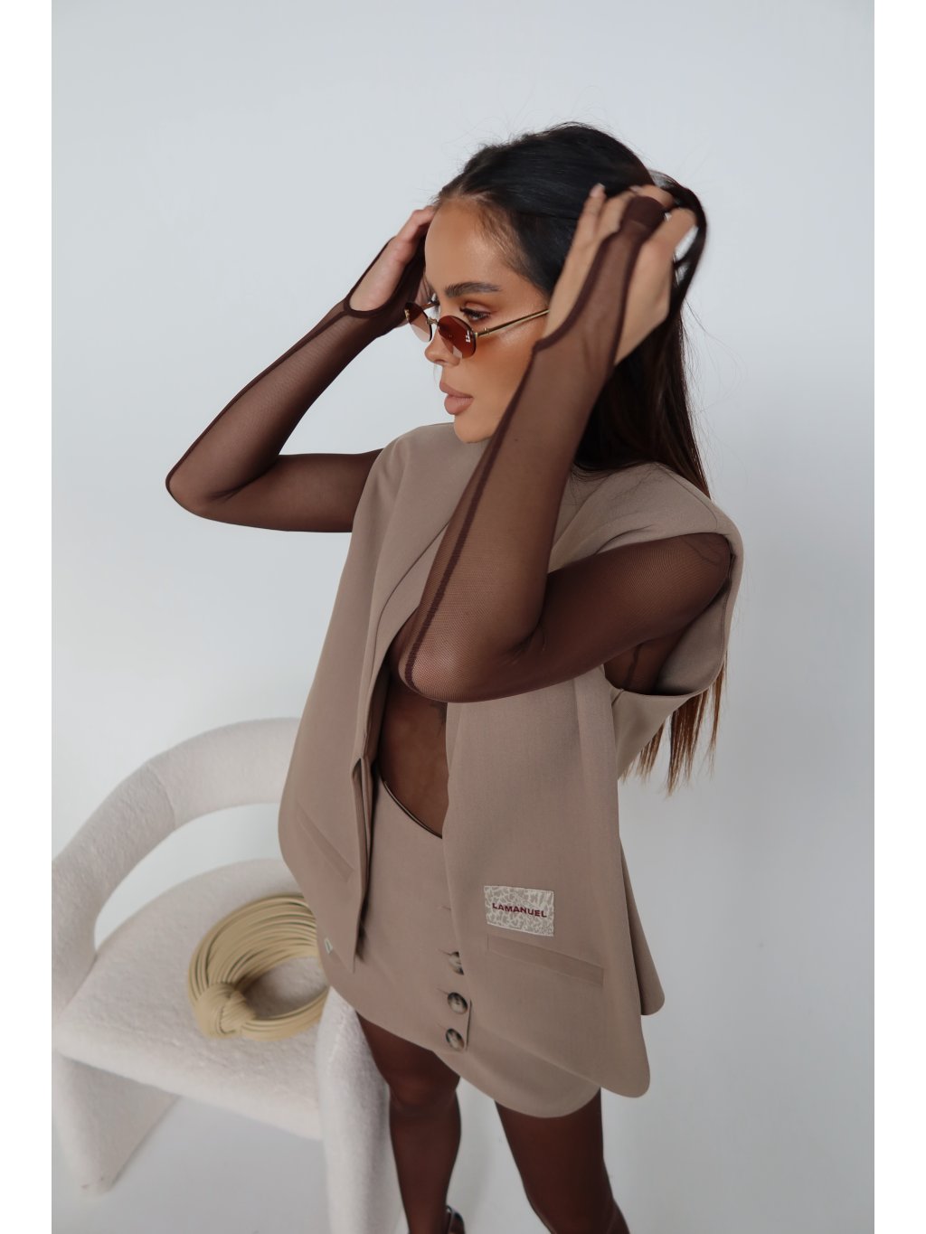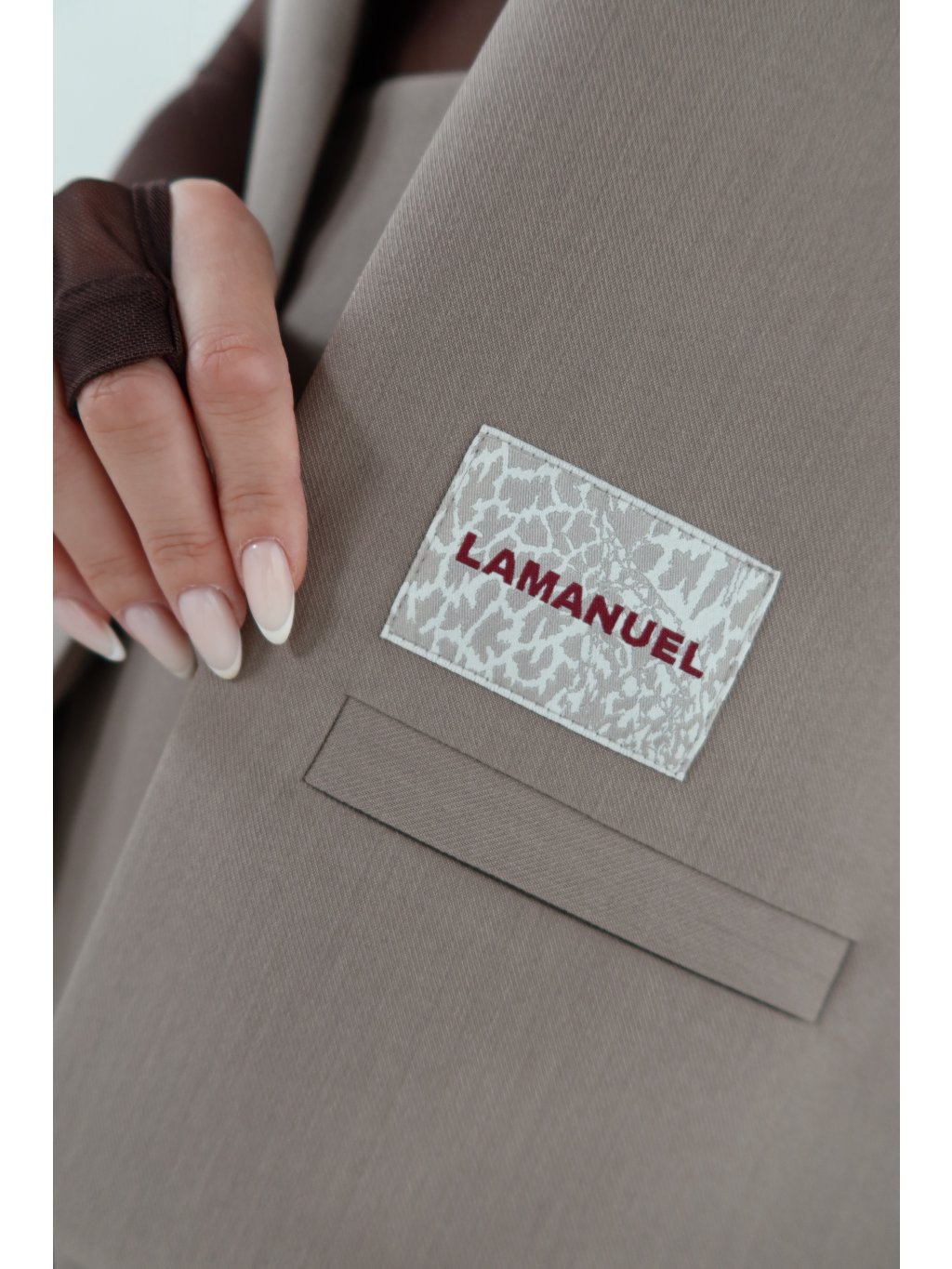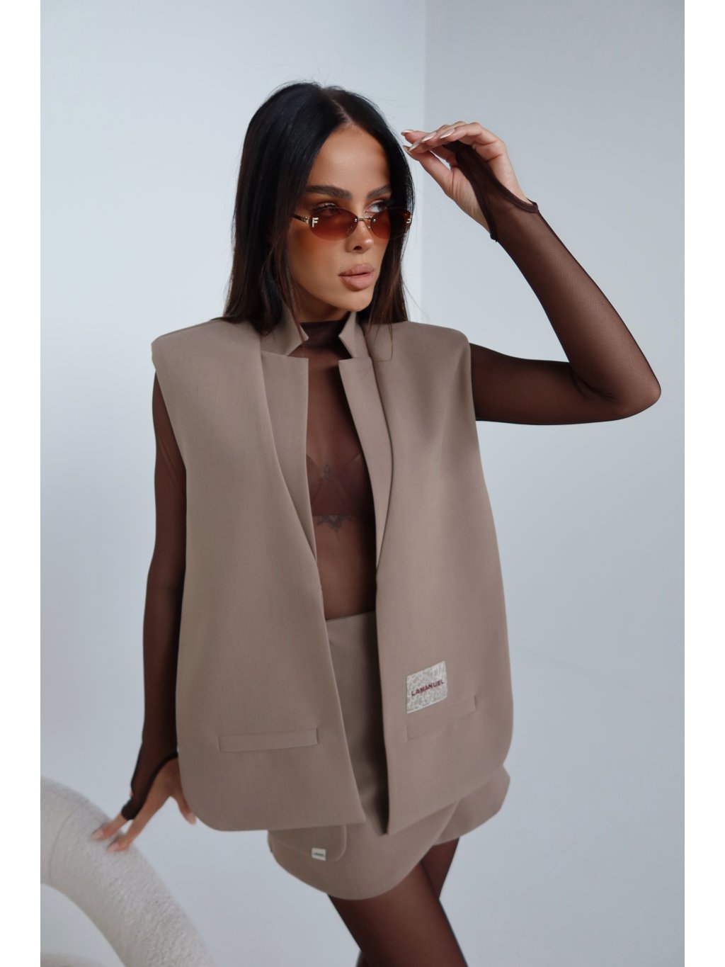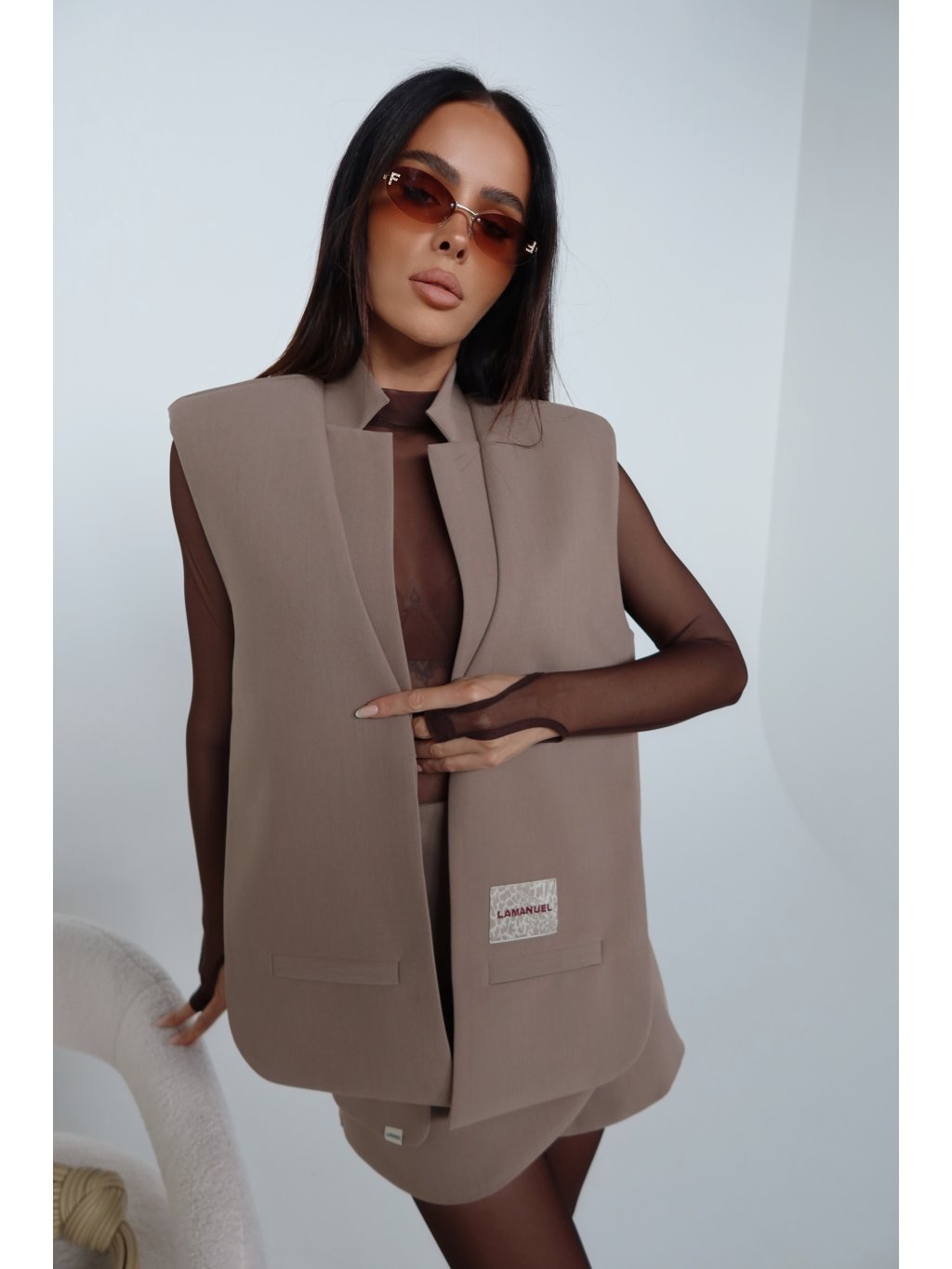 Vesta jednoduchého, hranatého strihu, bez zapínania, s výrazne definovanou líniou ramien. Minimalistickú formu prerušuje kontrastná nášivka s logom LAMANUEL, umiestnená vedľa jedného z vreciek atrapy. Model je vyrobený z mierne štruktúrovanej oblekovej látky – tuhší tvar dobre drží líniu a dodáva siluete výraznosť. Dobre sa hodí ako doplnok k outfitu so sukňou, nohavicami alebo vrstveným – cez košeľu, rolák alebo sieťovaný top.