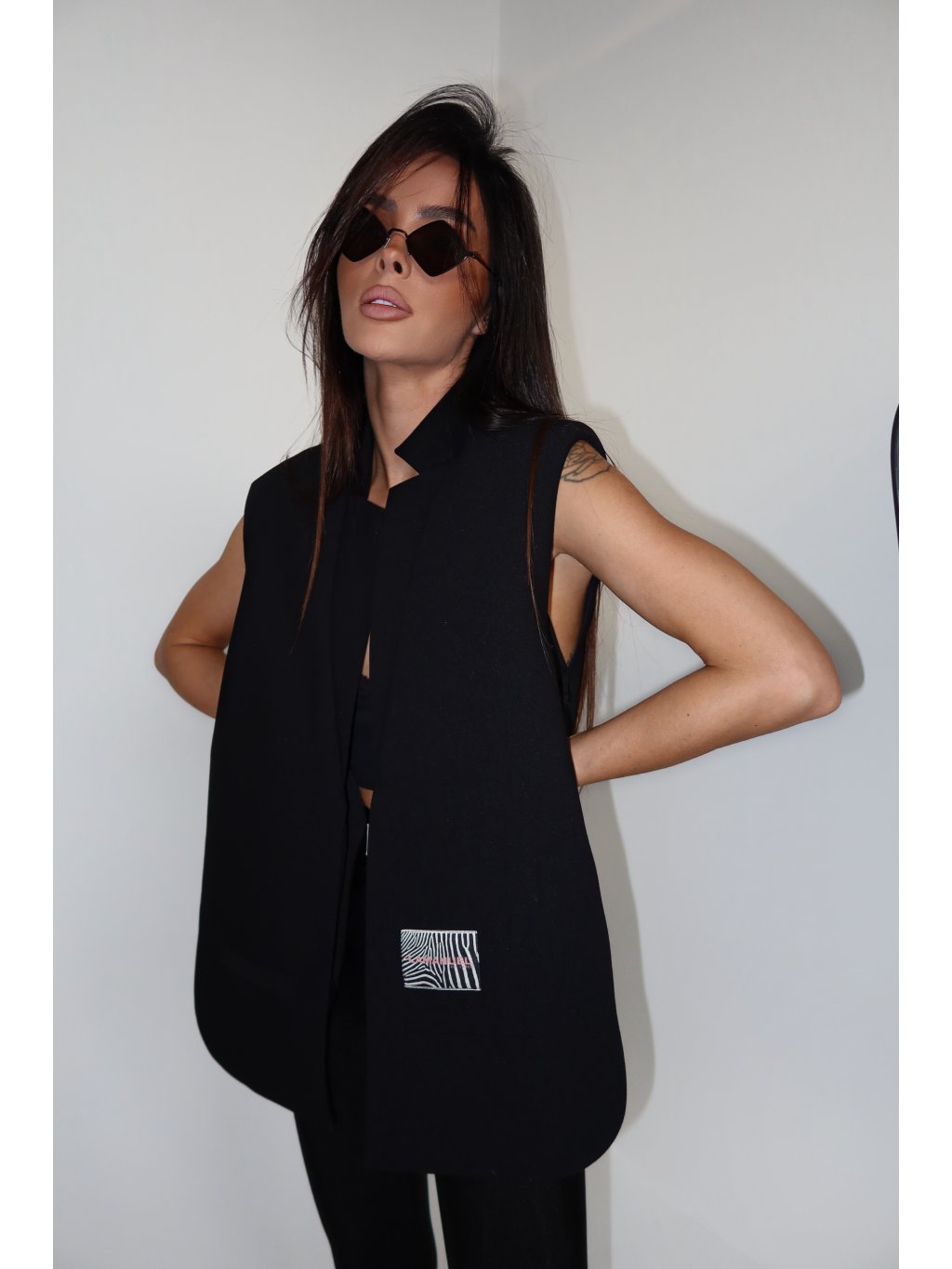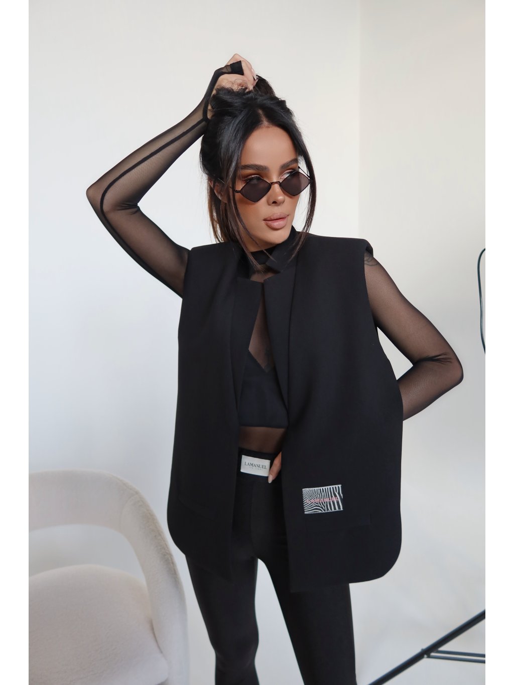 Vesta jednoduchého, hranatého strihu, bez zapínania, s výrazne definovanou líniou ramien. Minimalistickú formu prerušuje kontrastná nášivka s logom LAMANUEL, umiestnená vedľa jedného z vreciek atrapy. Model je vyrobený z mierne štruktúrovanej oblekovej látky – tuhší tvar dobre drží líniu a dodáva siluete výraznosť. Dobre sa hodí ako doplnok k outfitu so sukňou, nohavicami alebo vrstveným – cez košeľu, rolák alebo sieťovaný top.
