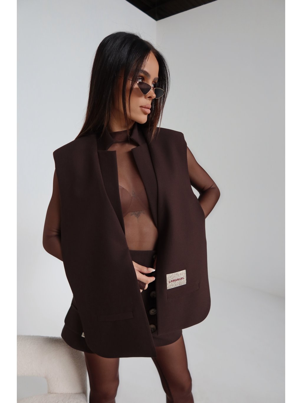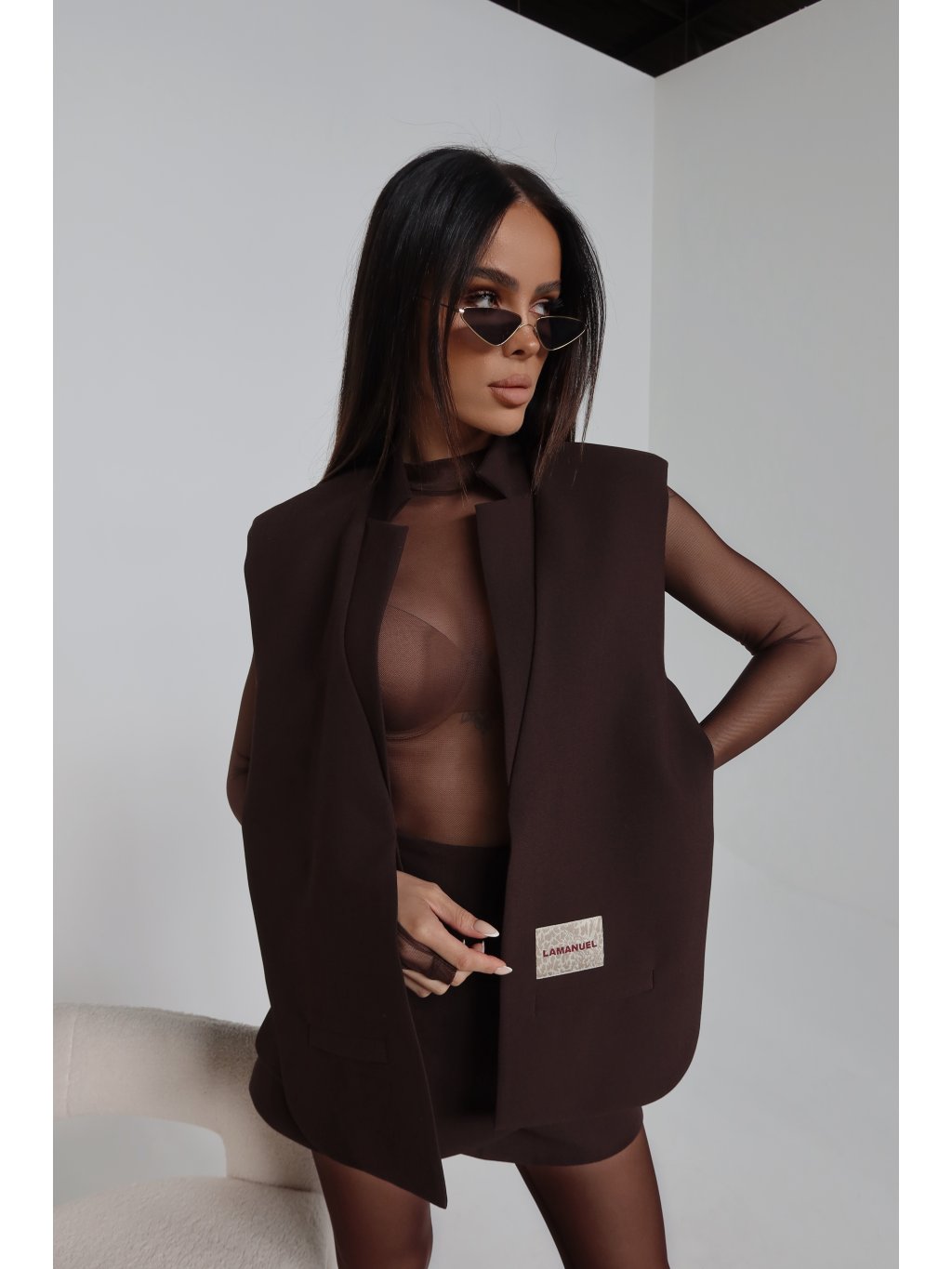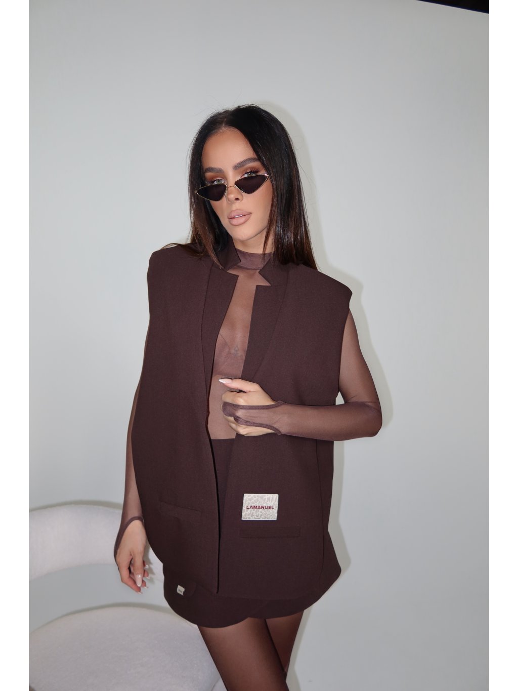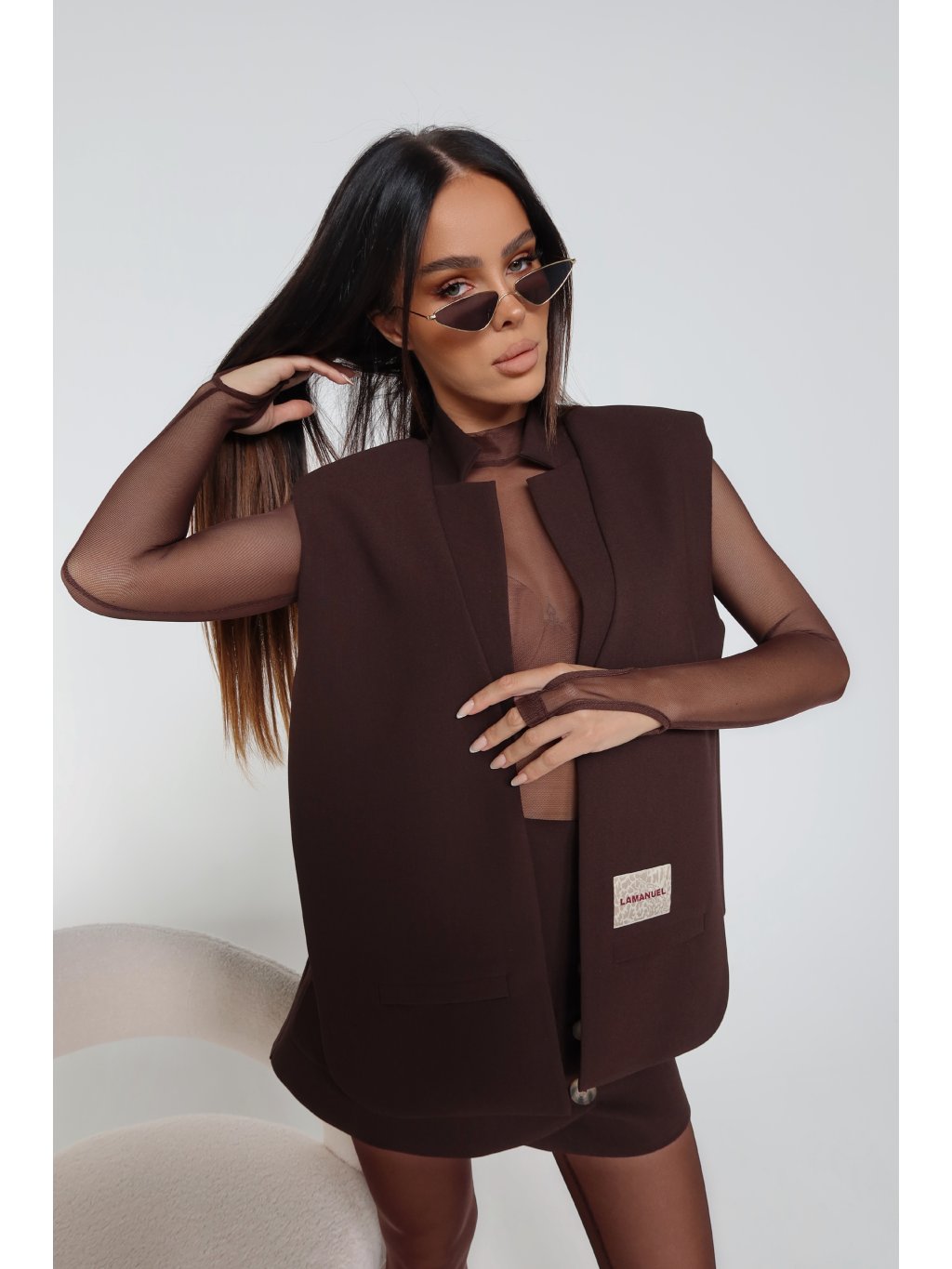 Vesta jednoduchého, hranatého strihu, bez zapínania, s výrazne definovanou líniou ramien. Minimalistickú formu prerušuje kontrastná nášivka s logom LAMANUEL, umiestnená vedľa jedného z vreciek atrapy. Model je vyrobený z mierne štruktúrovanej oblekovej látky – tuhší tvar dobre drží líniu a dodáva siluete výraznosť. Dobre sa hodí ako doplnok k outfitu so sukňou, nohavicami alebo vrstveným – cez košeľu, rolák alebo sieťovaný top.