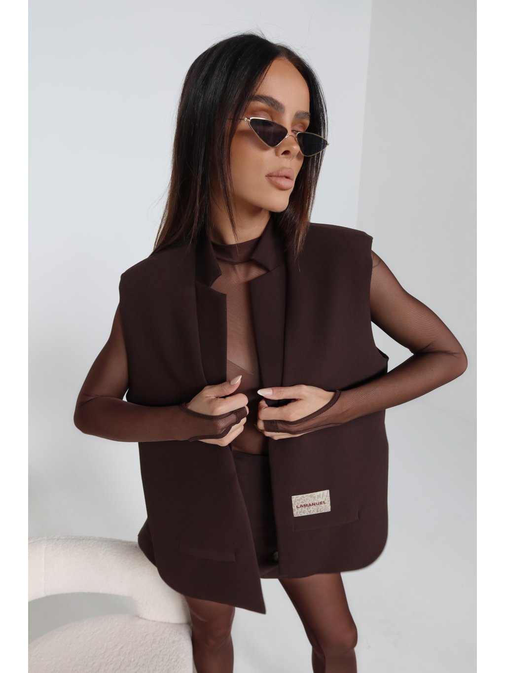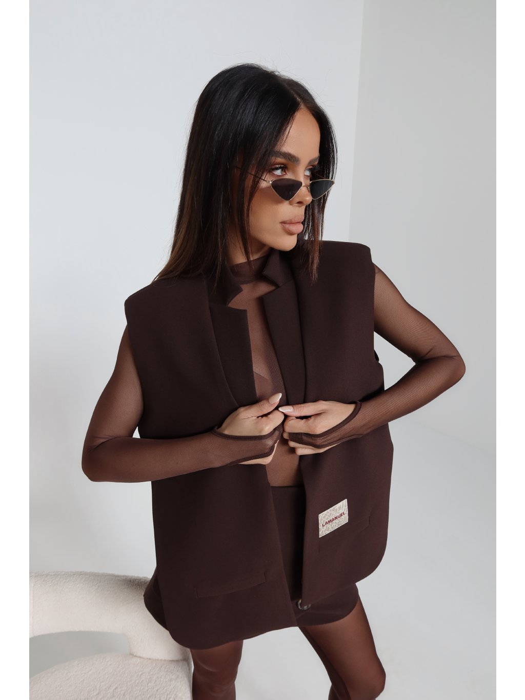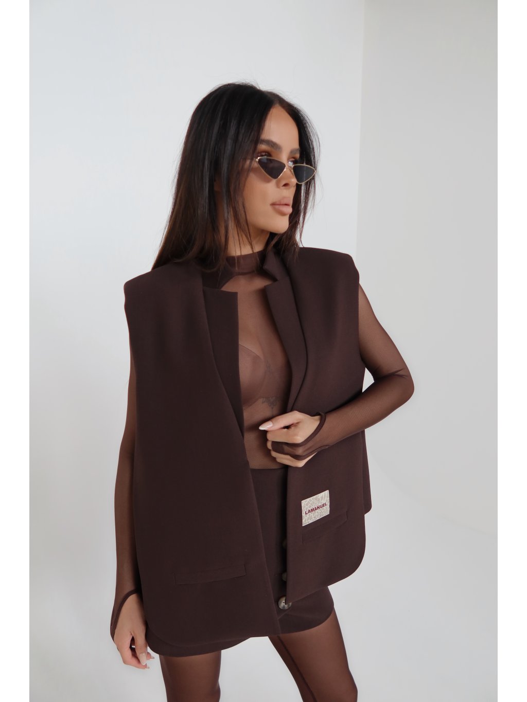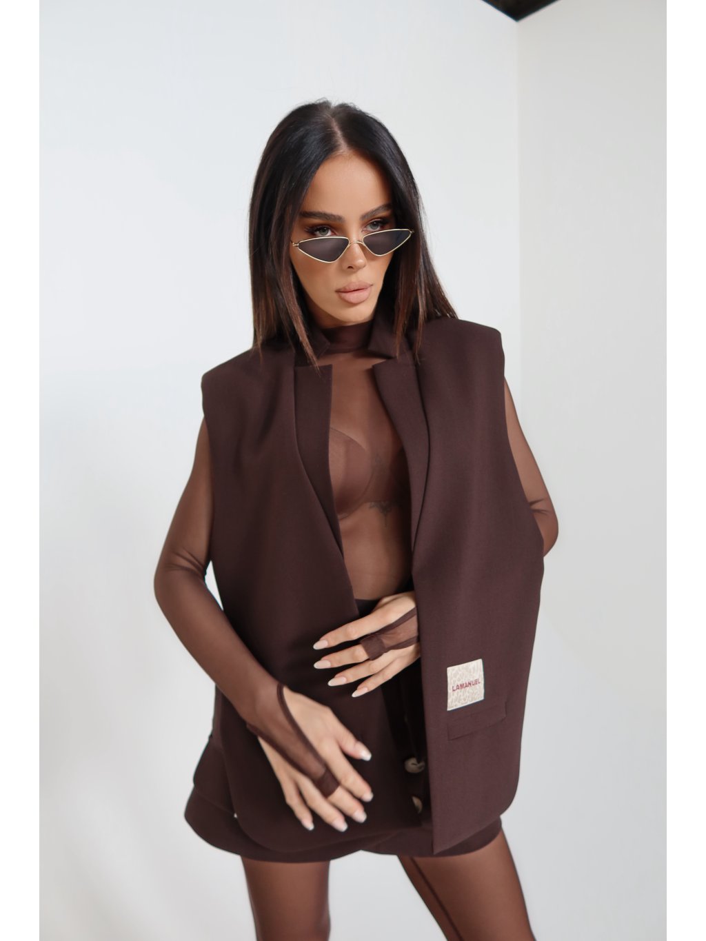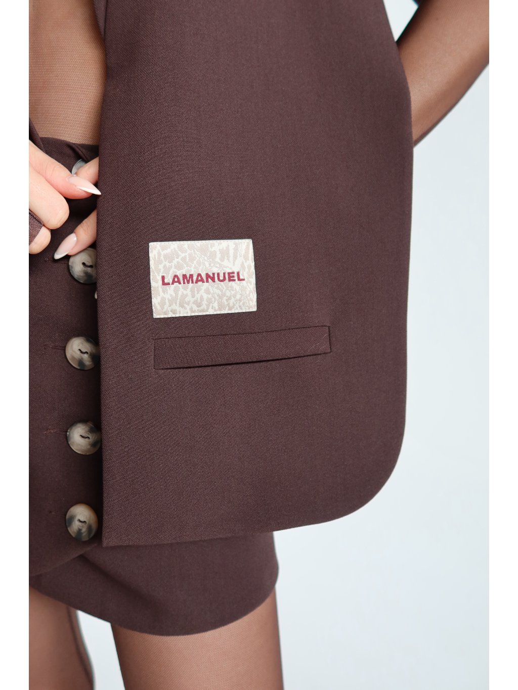 Vesta jednoduchého, hranatého strihu, bez zapínania, s výrazne definovanou líniou ramien. Minimalistickú formu prerušuje kontrastná nášivka s logom LAMANUEL, umiestnená vedľa jedného z vreciek atrapy. Model je vyrobený z mierne štruktúrovanej oblekovej látky – tuhší tvar dobre drží líniu a dodáva siluete výraznosť. Dobre sa hodí ako doplnok k outfitu so sukňou, nohavicami alebo vrstveným – cez košeľu, rolák alebo sieťovaný top.