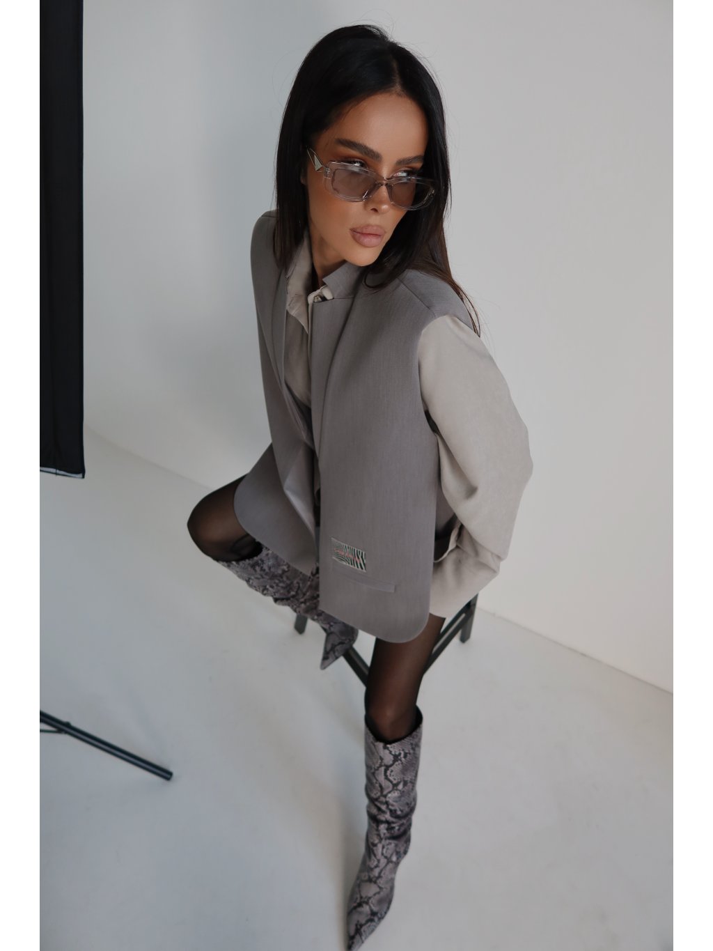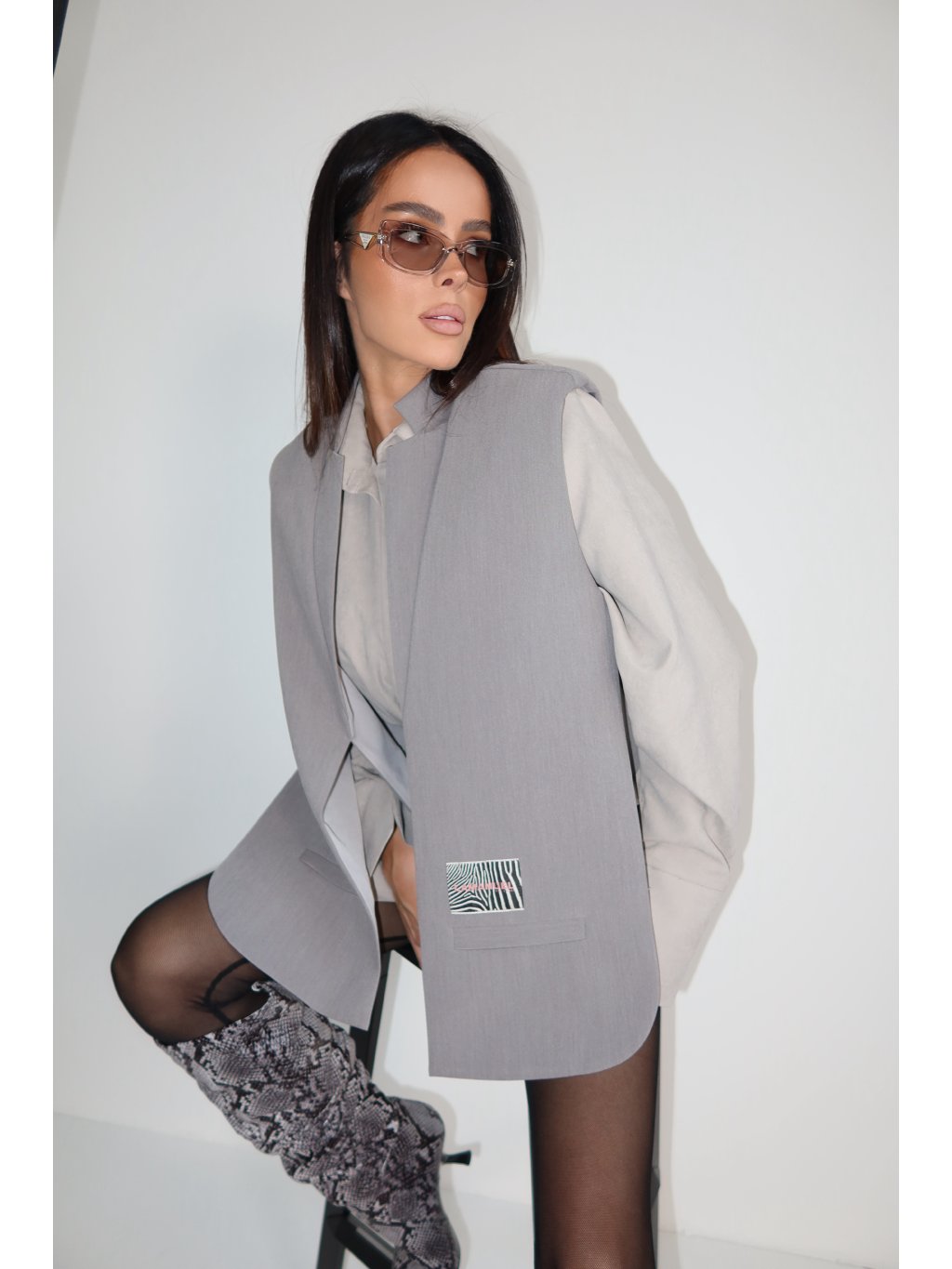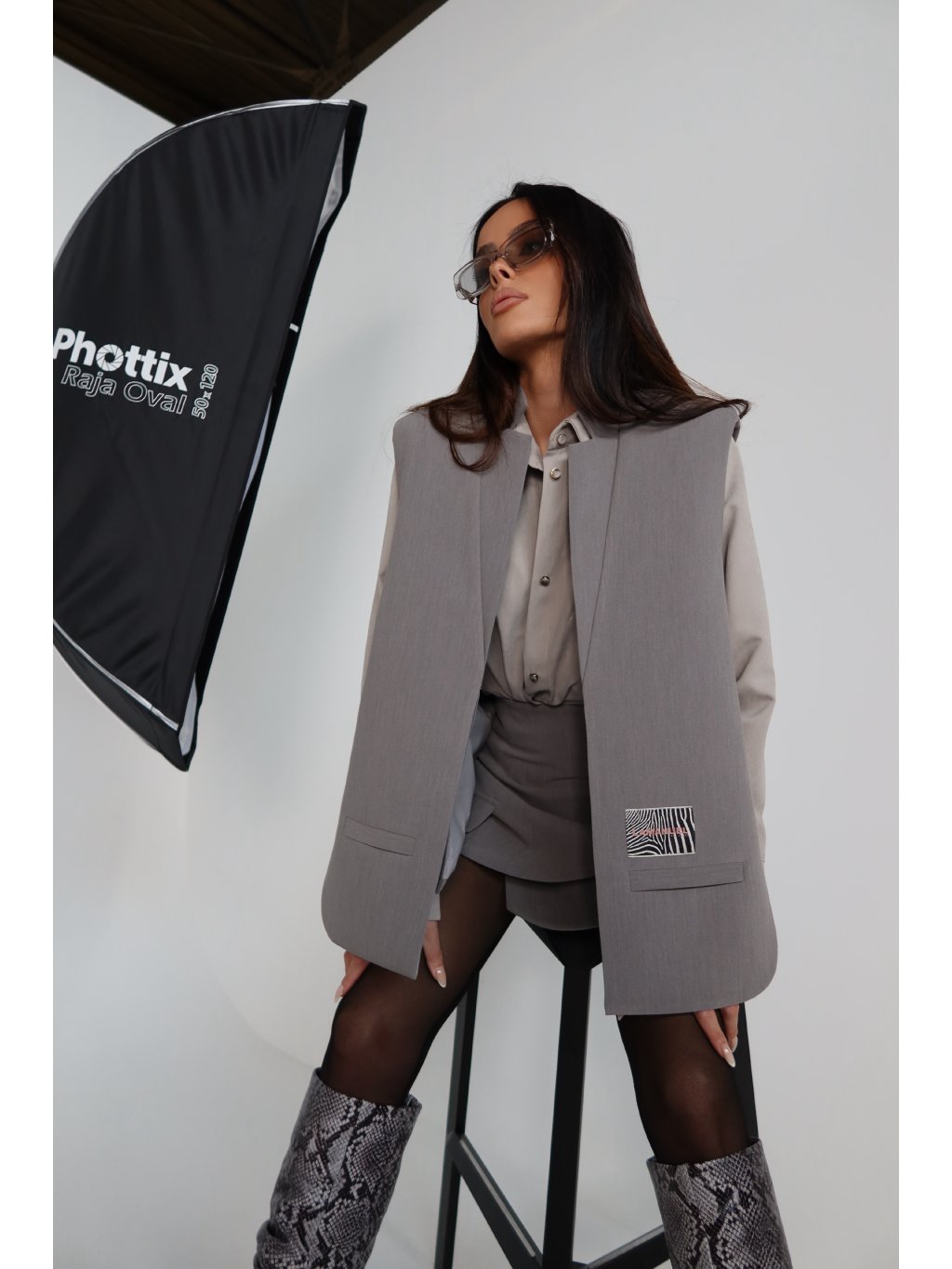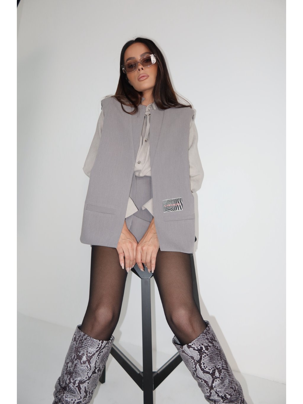Vesta jednoduchého, hranatého strihu, bez zapínania, s výrazne definovanou líniou ramien. Minimalistickú formu prerušuje kontrastná nášivka s logom LAMANUEL, umiestnená vedľa jedného z vreciek atrapy. Model je vyrobený z mierne štruktúrovanej oblekovej látky – tuhší tvar dobre drží líniu a dodáva siluete výraznosť. Dobre sa hodí ako doplnok k outfitu so sukňou, nohavicami alebo vrstveným – cez košeľu, rolák alebo sieťovaný top.