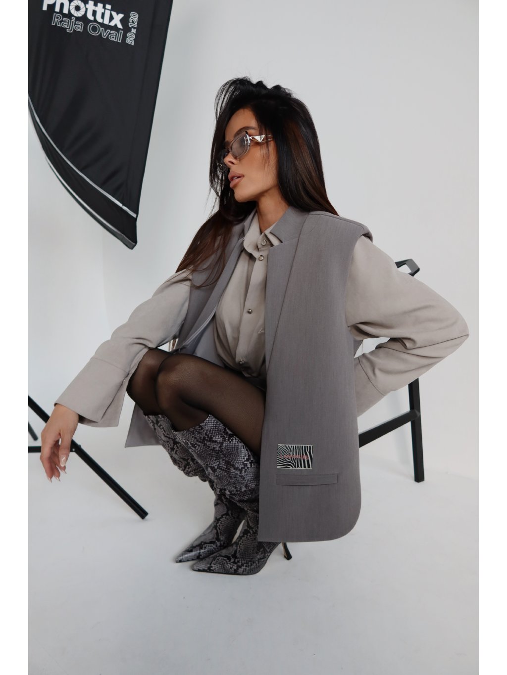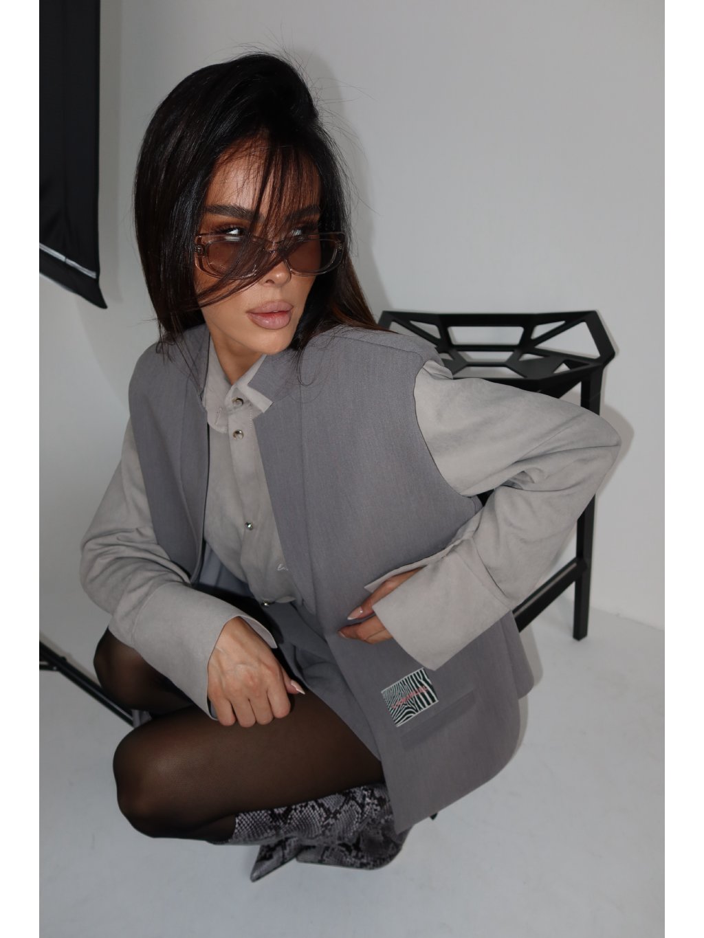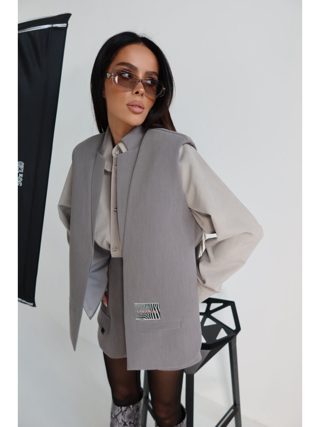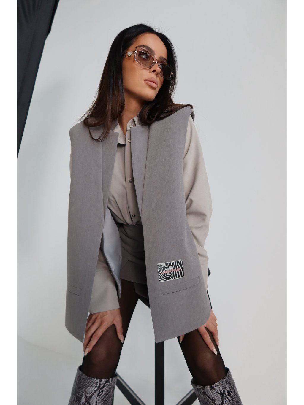 Vesta jednoduchého, hranatého strihu, bez zapínania, s výrazne definovanou líniou ramien. Minimalistickú formu prerušuje kontrastná nášivka s logom LAMANUEL, umiestnená vedľa jedného z vreciek atrapy. Model je vyrobený z mierne štruktúrovanej oblekovej látky – tuhší tvar dobre drží líniu a dodáva siluete výraznosť. Dobre sa hodí ako doplnok k outfitu so sukňou, nohavicami alebo vrstveným – cez košeľu, rolák alebo sieťovaný top.