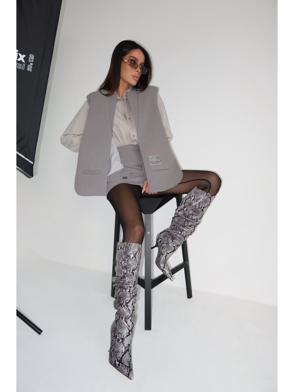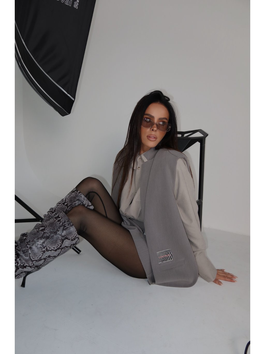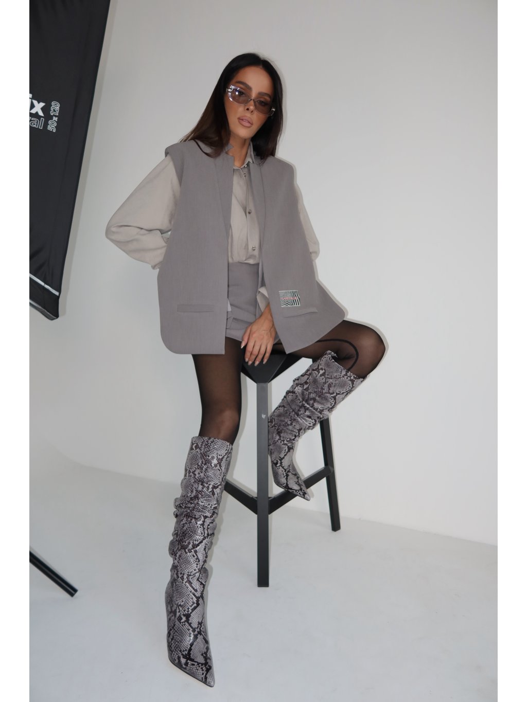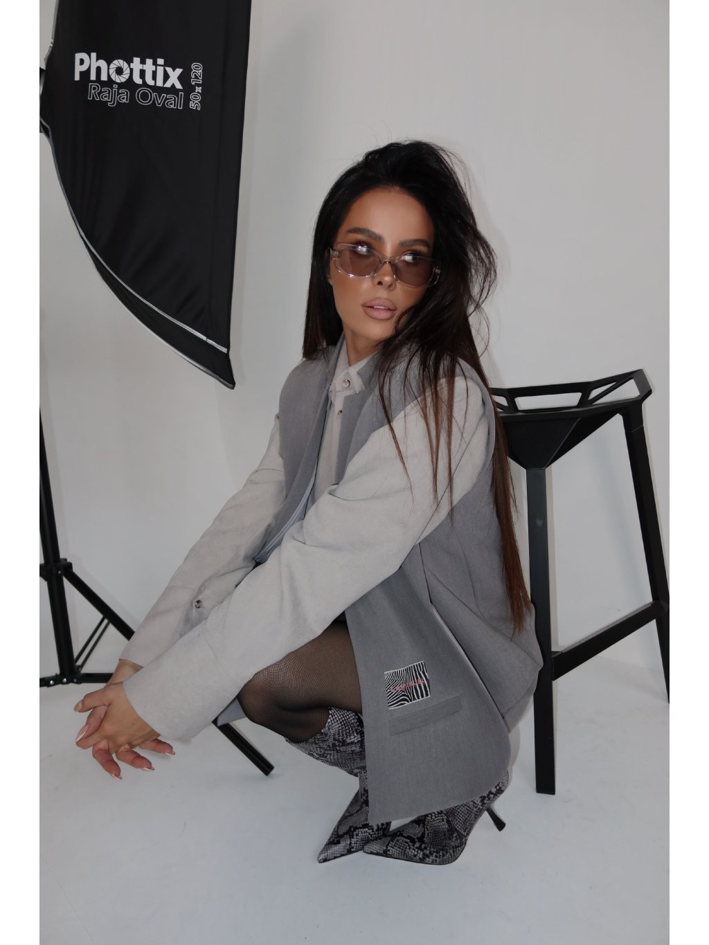 Vesta jednoduchého, hranatého strihu, bez zapínania, s výrazne definovanou líniou ramien. Minimalistickú formu prerušuje kontrastná nášivka s logom LAMANUEL, umiestnená vedľa jedného z vreciek atrapy. Model je vyrobený z mierne štruktúrovanej oblekovej látky – tuhší tvar dobre drží líniu a dodáva siluete výraznosť. Dobre sa hodí ako doplnok k outfitu so sukňou, nohavicami alebo vrstveným – cez košeľu, rolák alebo sieťovaný top.
