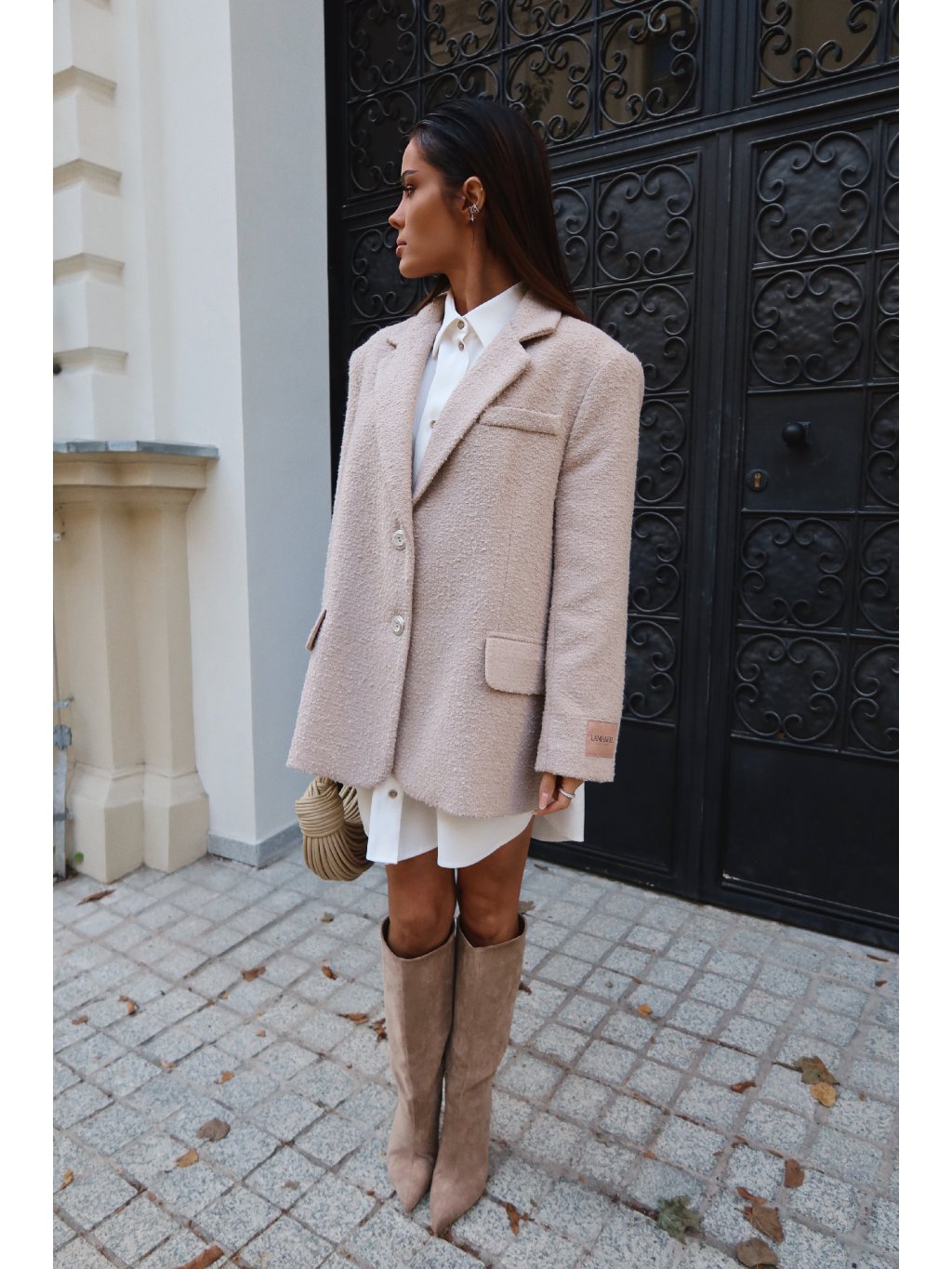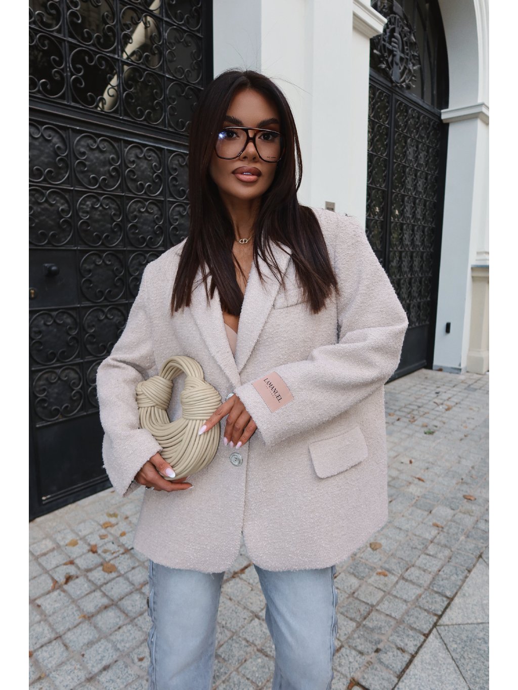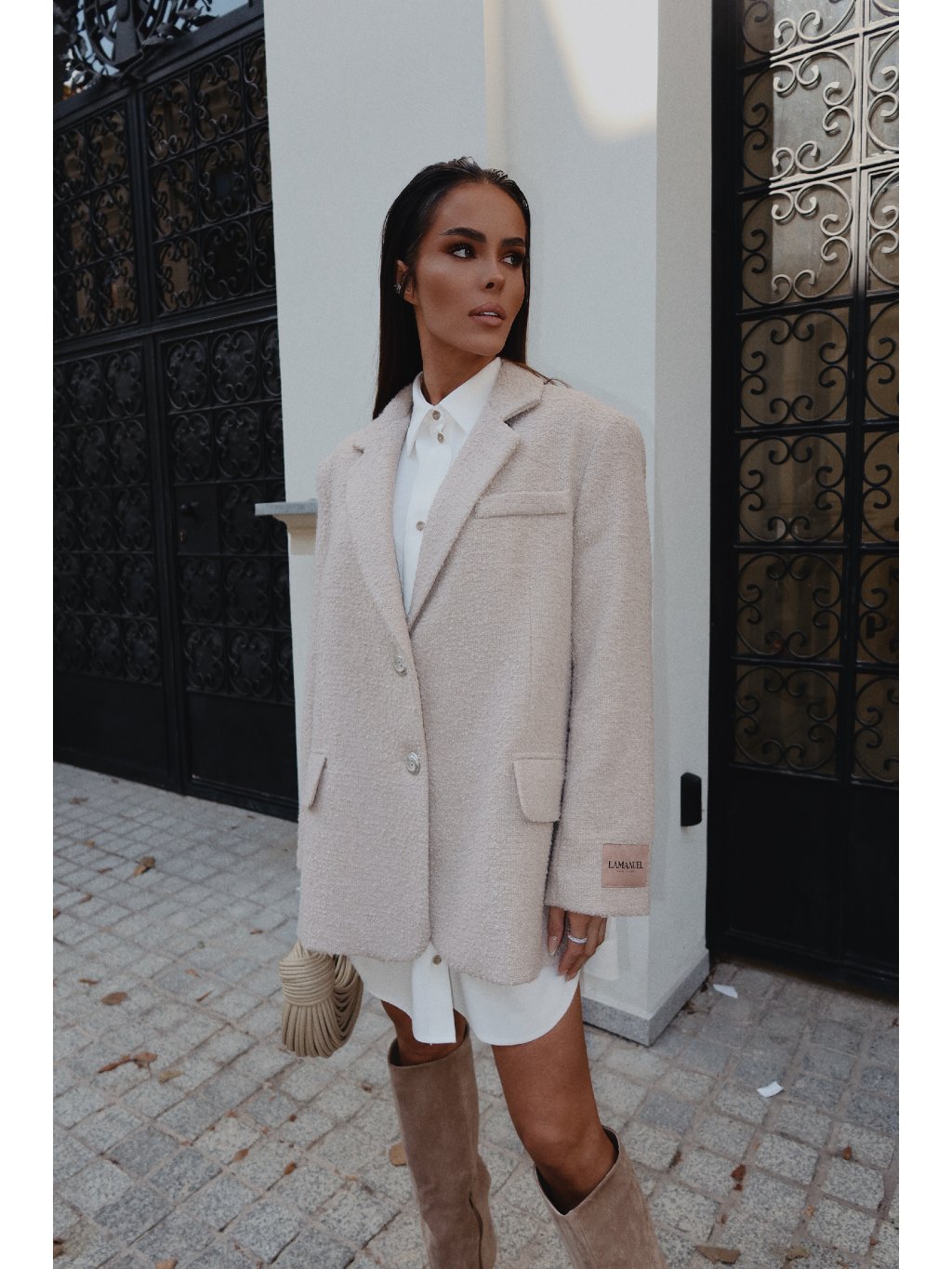 Sako s textúrou boucle s výraznou štruktúrou a rafinovaným strihom, ktorý vám umožní nosiť ho ako ľahký kabát. Mäkký, ale tvarovo pridržiavaný, so širokými klopami a ozdobnými gombíkmi sa bude dobre hodiť do elegantných aj každodenných outfitov. Ideálne pre vrstvené outfity – nosí sa cez košeľu, sveter alebo dokonca tenkú bundu. Štýlová alternatíva ku klasickému vrchnému oblečeniu.