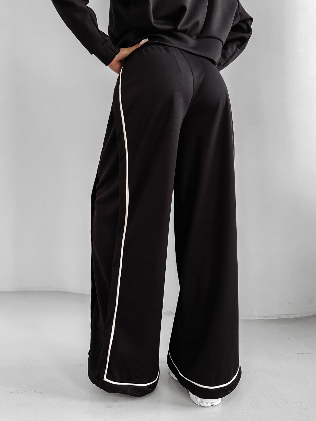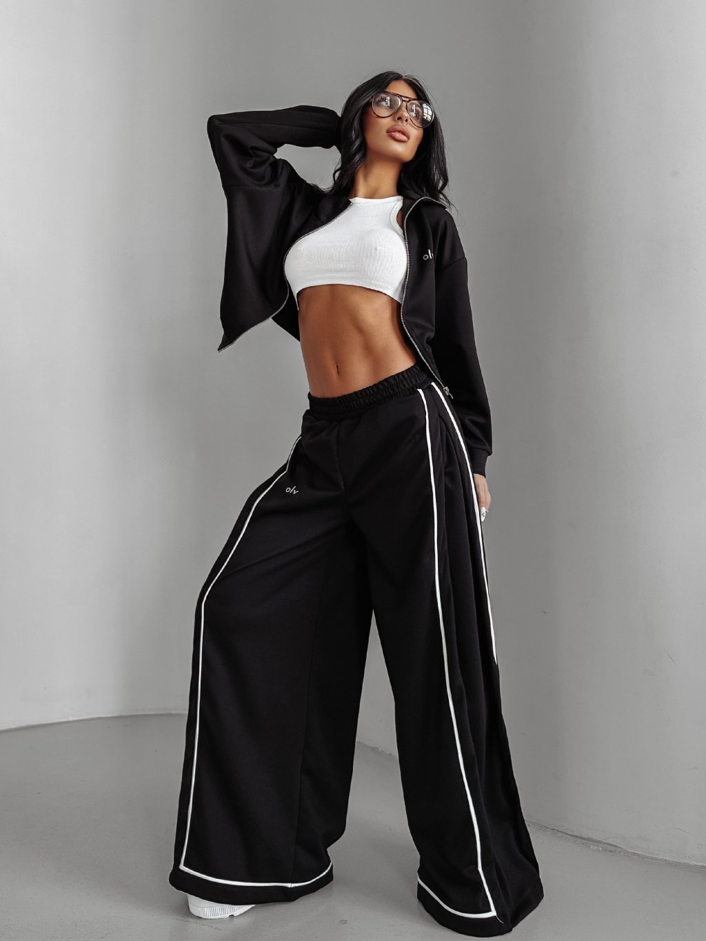 Klasické nohavice s vysokým pásom. Vyrobené z kvalitnej elastickej bavlny. Nohavice sa rozširujú smerom nadol. Produkt zdobí kontrastné prúžky. Pás je elastický. Po bokoch sú vrecká a zaujímavý výrez. Na prednej strane je nápis OLV. Tvorí ideálny komplet s bundou SILENT STORM.