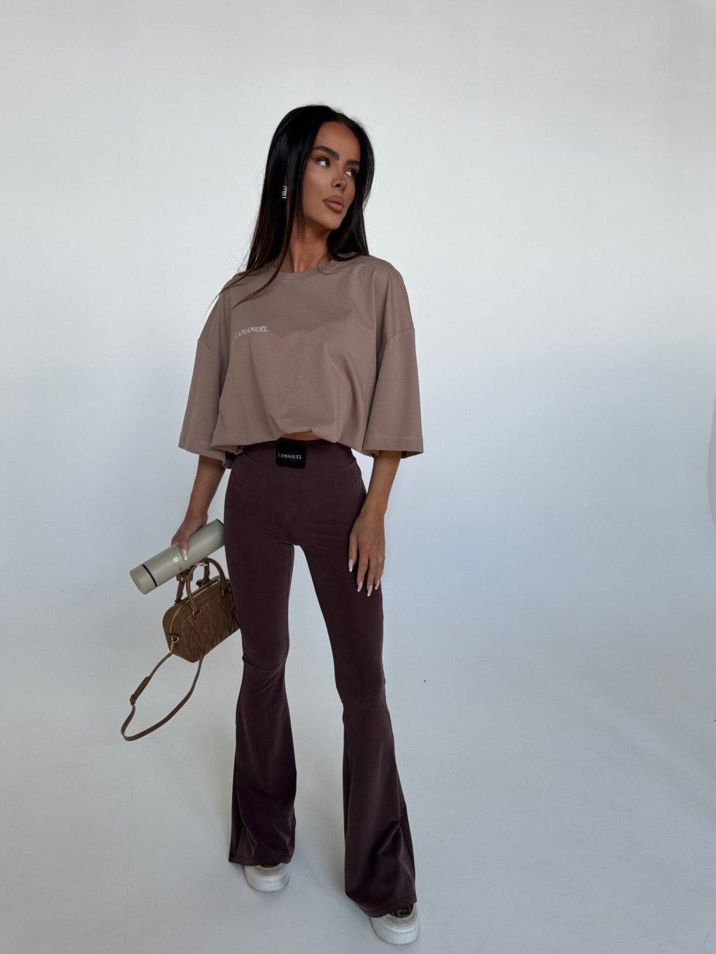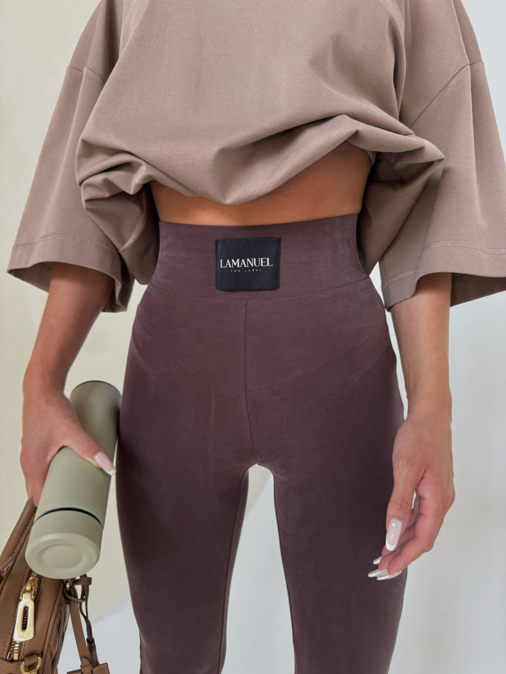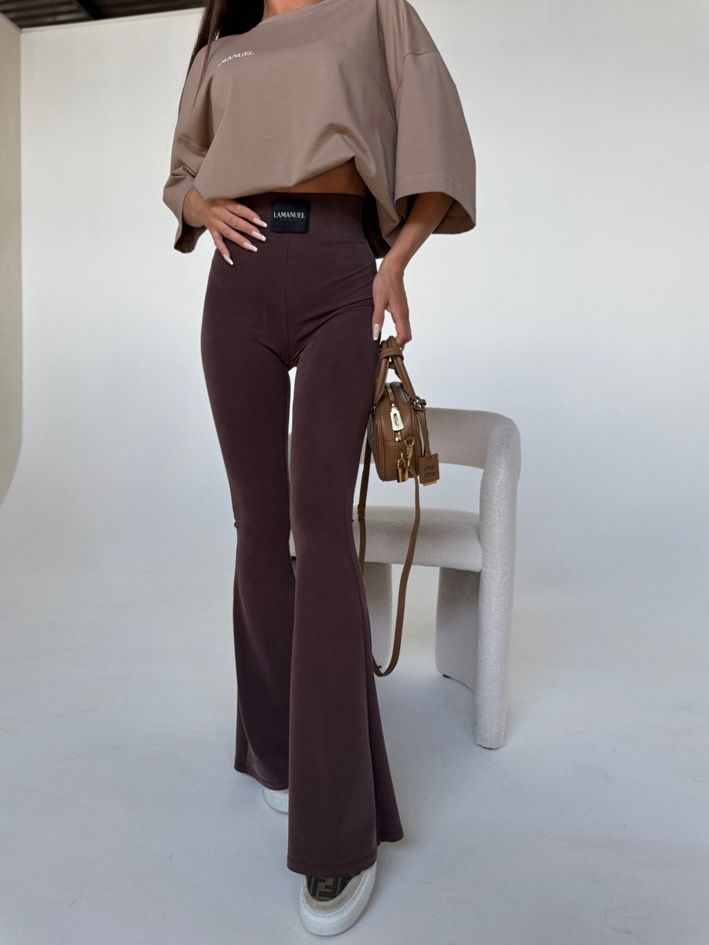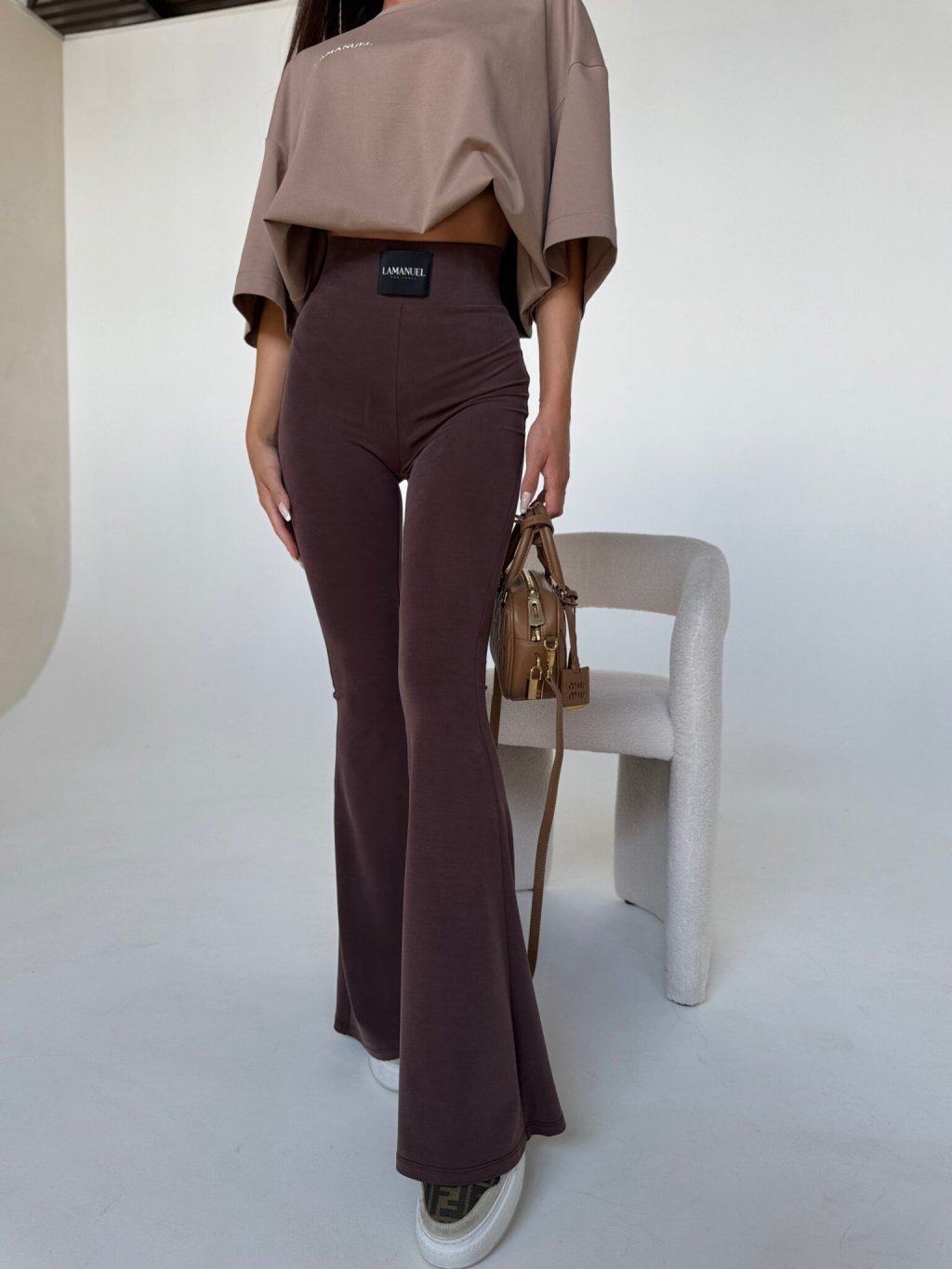 Priliehavé nohavice s rozšírenými nohavicami, vyrobené z mäkkého a elastického úpletu. Vysoký pás zvýrazňuje pás a zaisťuje pohodlie pri nosení, zatiaľ čo nohavice rozširujúce sa smerom nadol opticky predlžujú siluetu. Široký elastický pás s logom LaManuel dodáva výrazný charakter a nohavice dokonale priliehajú k telu. Model je ideálny ako pre každodenné outfity, tak aj pre športovejšiu verziu.