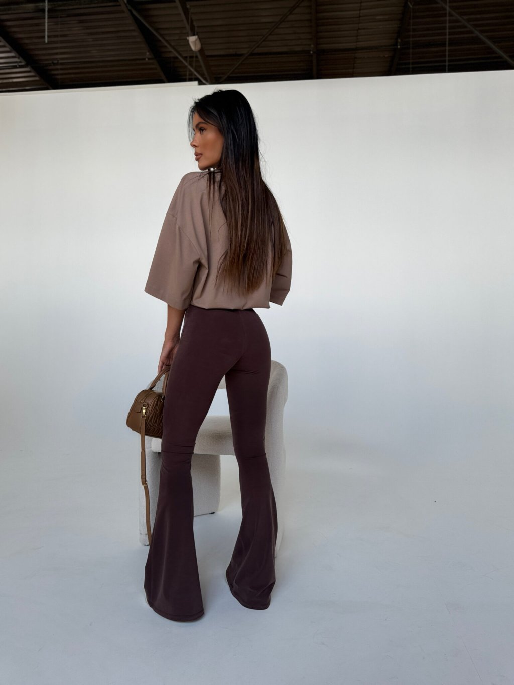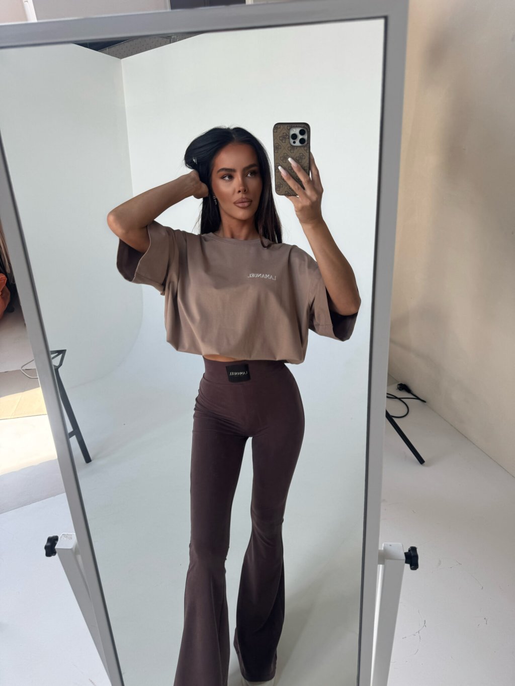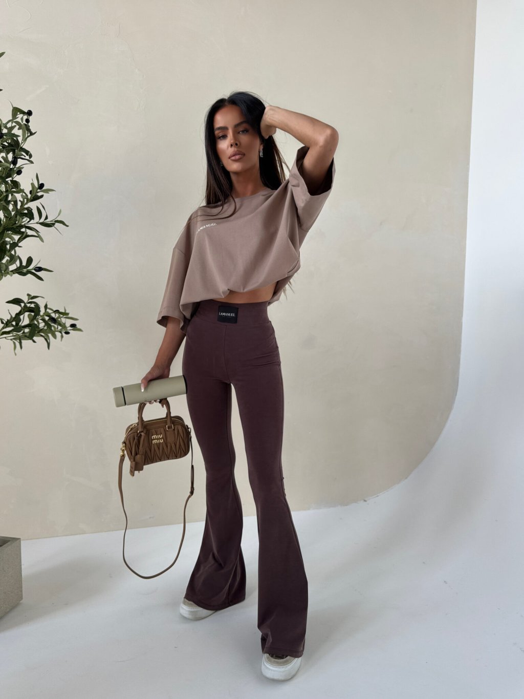 Priliehavé nohavice s rozšírenými nohavicami, vyrobené z mäkkého a elastického úpletu. Vysoký pás zvýrazňuje pás a zaisťuje pohodlie pri nosení, zatiaľ čo nohavice rozširujúce sa smerom nadol opticky predlžujú siluetu. Široký elastický pás s logom LaManuel dodáva výrazný charakter a nohavice dokonale priliehajú k telu. Model je ideálny ako pre každodenné outfity, tak aj pre športovejšiu verziu.