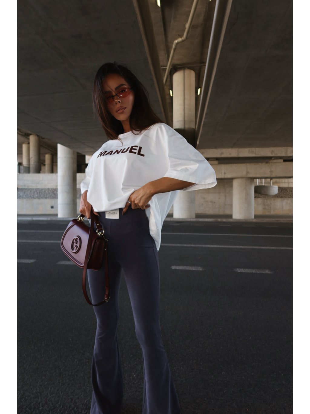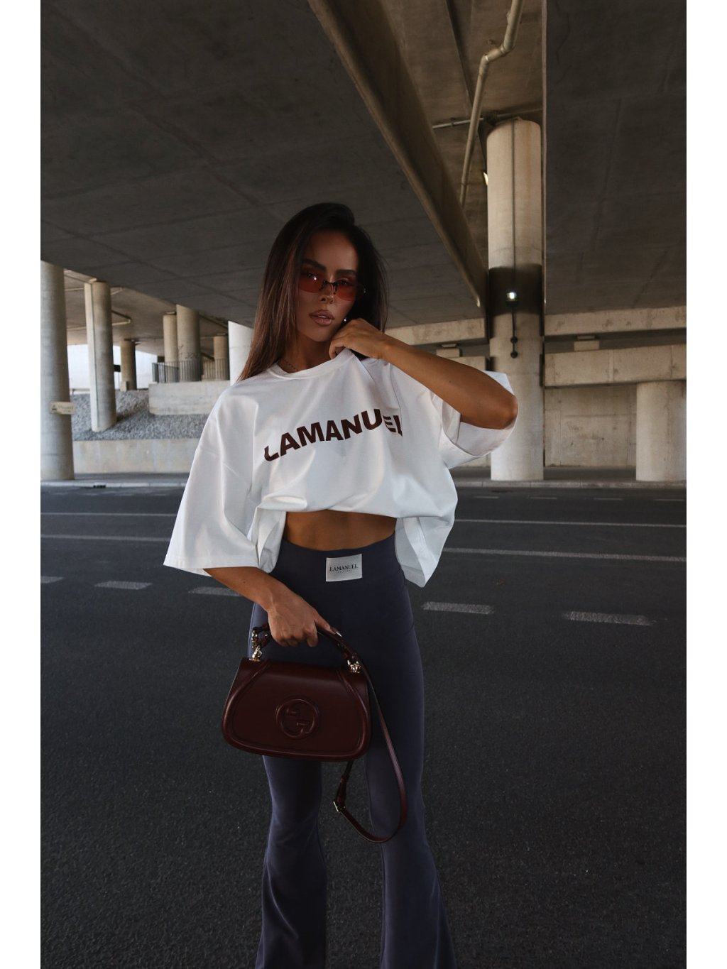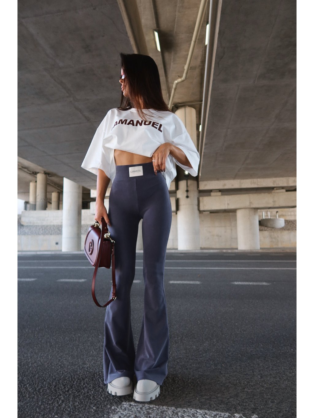Priliehavé nohavice s rozšírenými nohavicami, vyrobené z mäkkého a elastického úpletu. Vysoký pás zvýrazňuje pás a zaisťuje pohodlie pri nosení, zatiaľ čo nohavice rozširujúce sa smerom nadol opticky predlžujú siluetu. Široký elastický pás s logom LaManuel dodáva výrazný charakter a nohavice dokonale priliehajú k telu. Model je ideálny ako pre každodenné outfity, tak aj pre športovejšiu verziu.