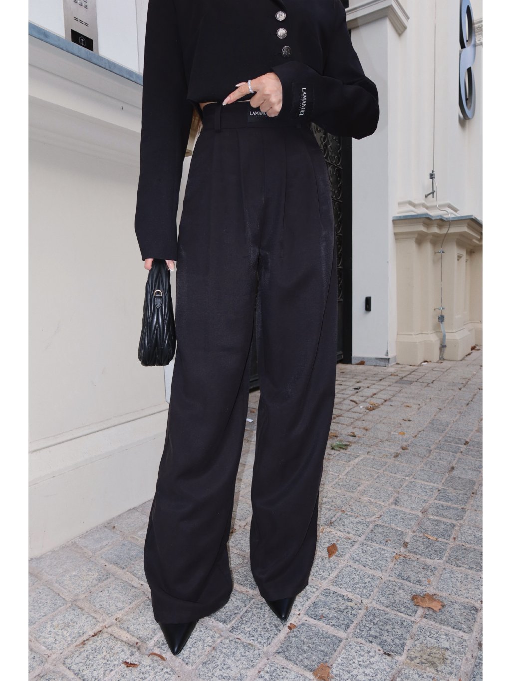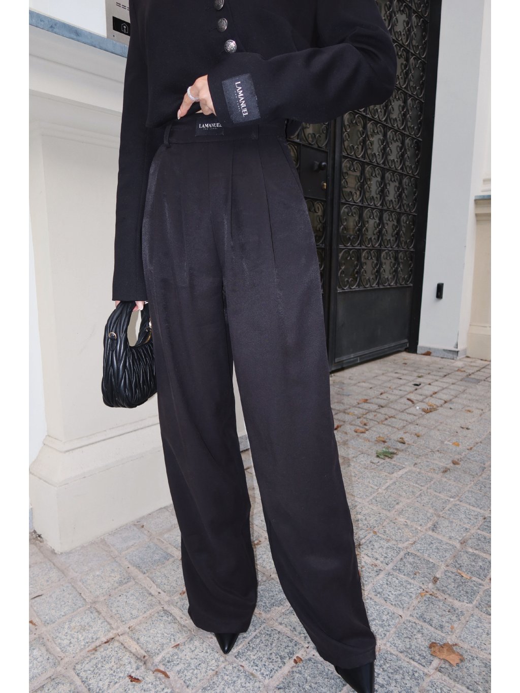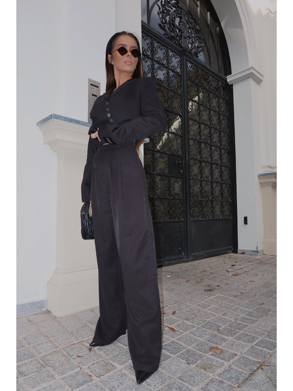 Elegantný strih s charakterom – široké nohavice, ľahký lesk a zips na boku, ktorý zdôrazňuje čistú líniu pása. Záhyby na prednej strane im dodávajú sofistikovanosť a vďaka rafinovanému tvaru dokonale zapadajú do pohybu. Ide o nohavice, ktoré zvládnu svoju prácu v celkovom vzhľade, ale dobre sa budú hodiť aj k základnému topu alebo hrubému svetru. Kancelársky, večerný alebo ležérny štýl v prémiovej verzii – vy sa rozhodnete.