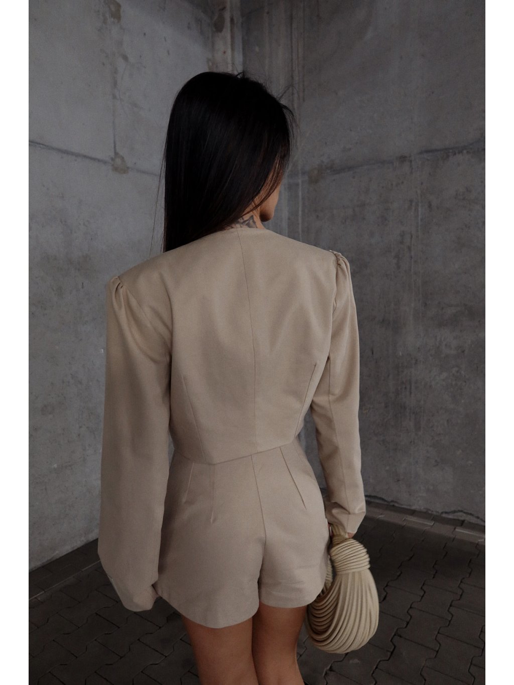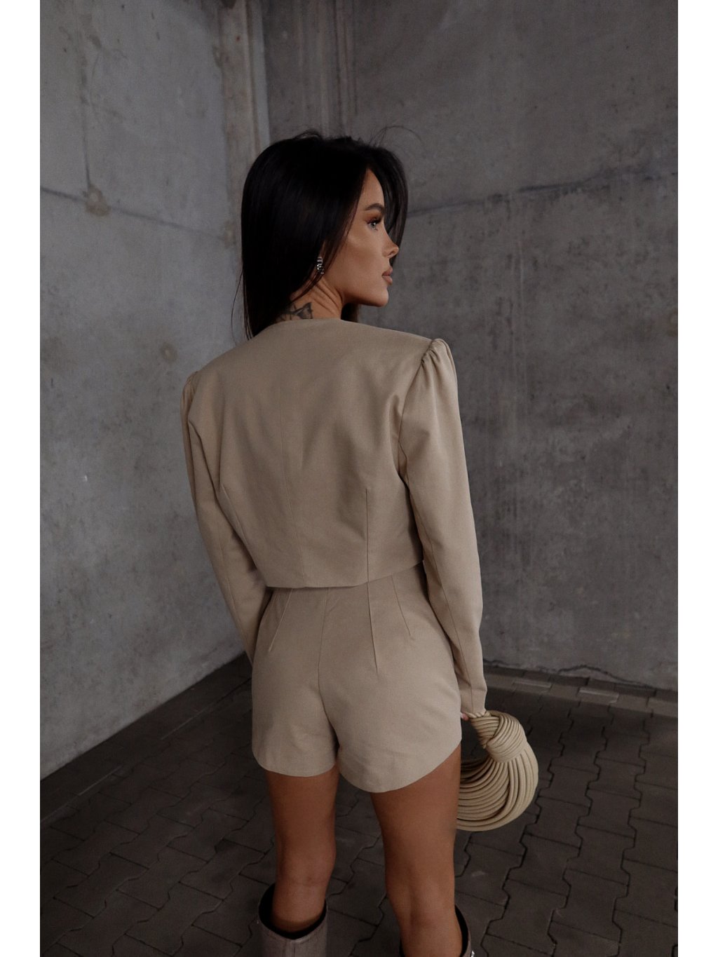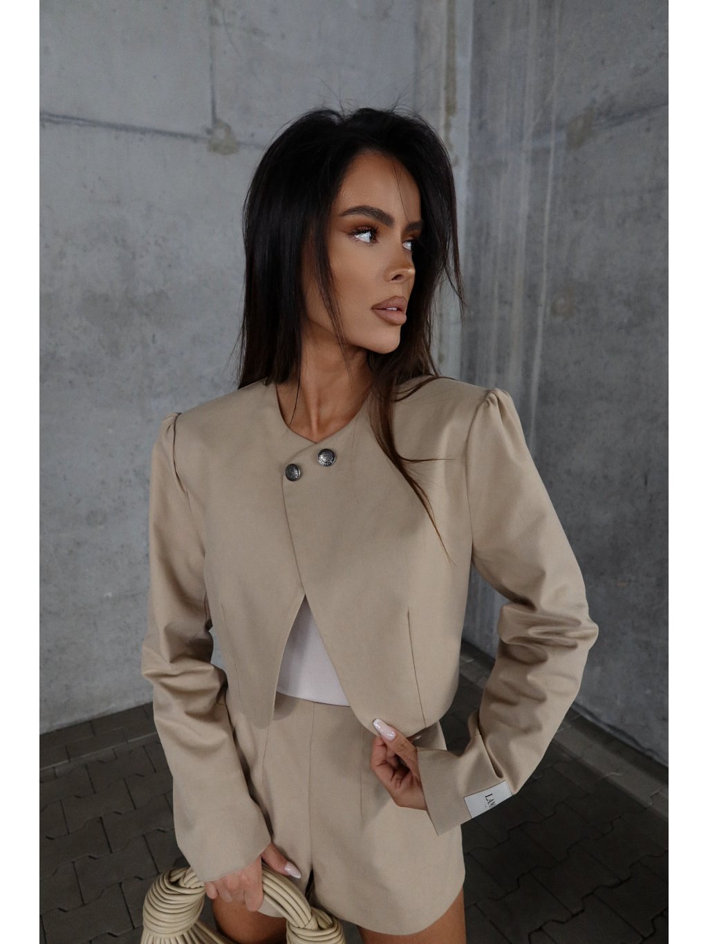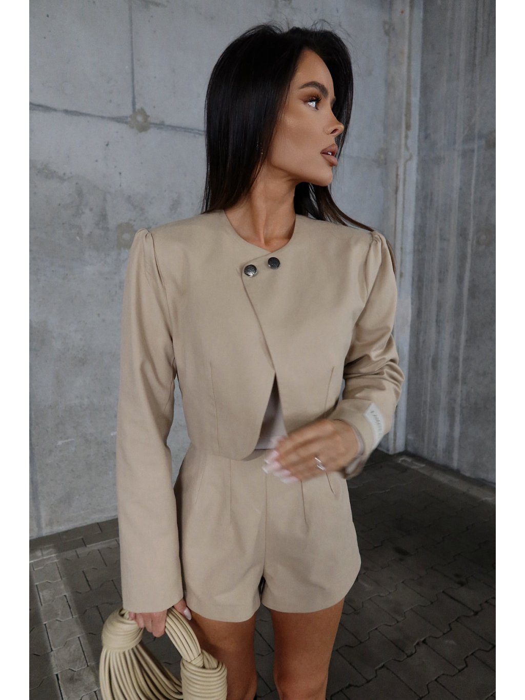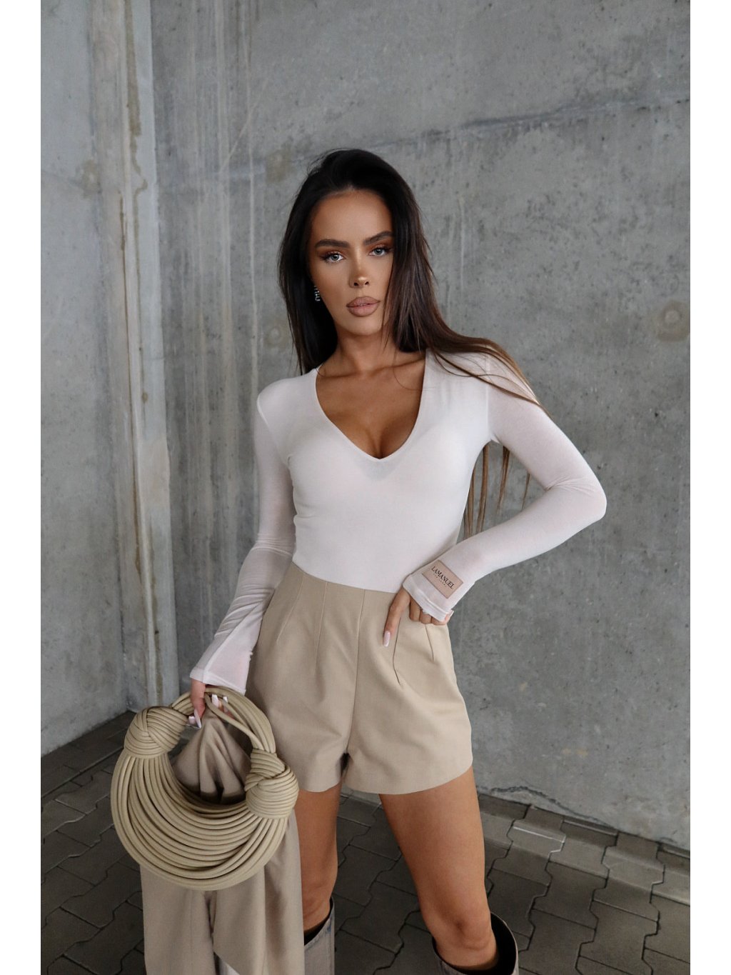 Elegantné šortky s mierne vysokým pásom a minimalistickým strihom. Predná strana má jemné záhyby, ktoré jemne tvarujú siluetu. Elegantná zadná strana bez vreciek poskytuje čistý a uhladený vzhľad. Model sa zapína na skrytý zips na boku, ktorý zdôrazňuje estetiku povrchovej úpravy. Perfektne sa hodí k saku aj samostatne – v ležérnom alebo elegantnejšom štýle.
