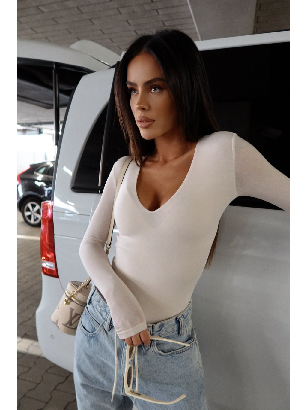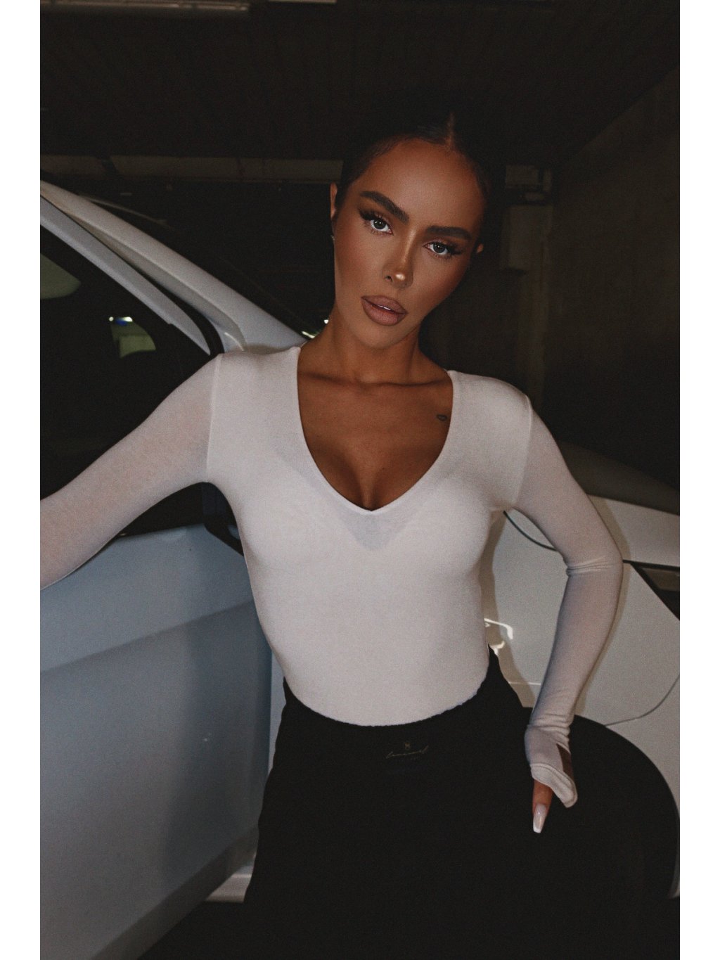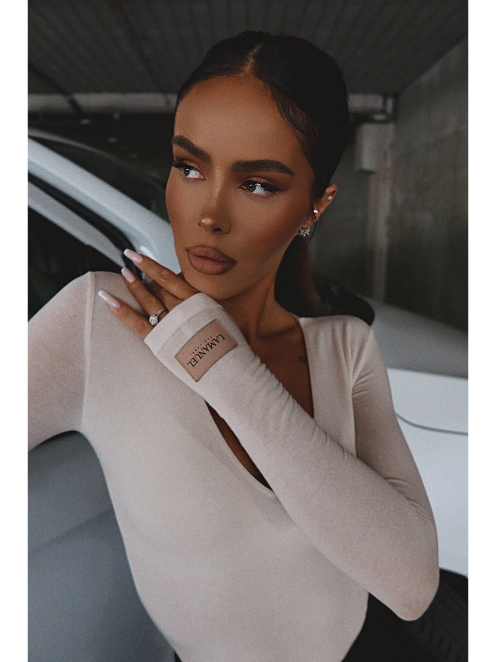 Body je vyrobené z extrémne mäkkej svetrovej pleteniny, ktorá poskytuje pohodlie a je príjemná na dotyk. Predná strana je podšitá ďalšou vrstvou látky pre väčšie pohodlie a lepšie krytie. Vypasovaný strih krásne sedí na postave a elastický materiál sa prispôsobí telu bez pocitu napnutia. Má hlboký výstrih do V a predĺžené rukávy s nášivkou s logom na manžete. Zapínanie na háčiky a očká v rozkroku, so šnúrkou - perfektné pod vypasované nohavice alebo sukne. Univerzálny základ pre každodenný aj večerný styling.