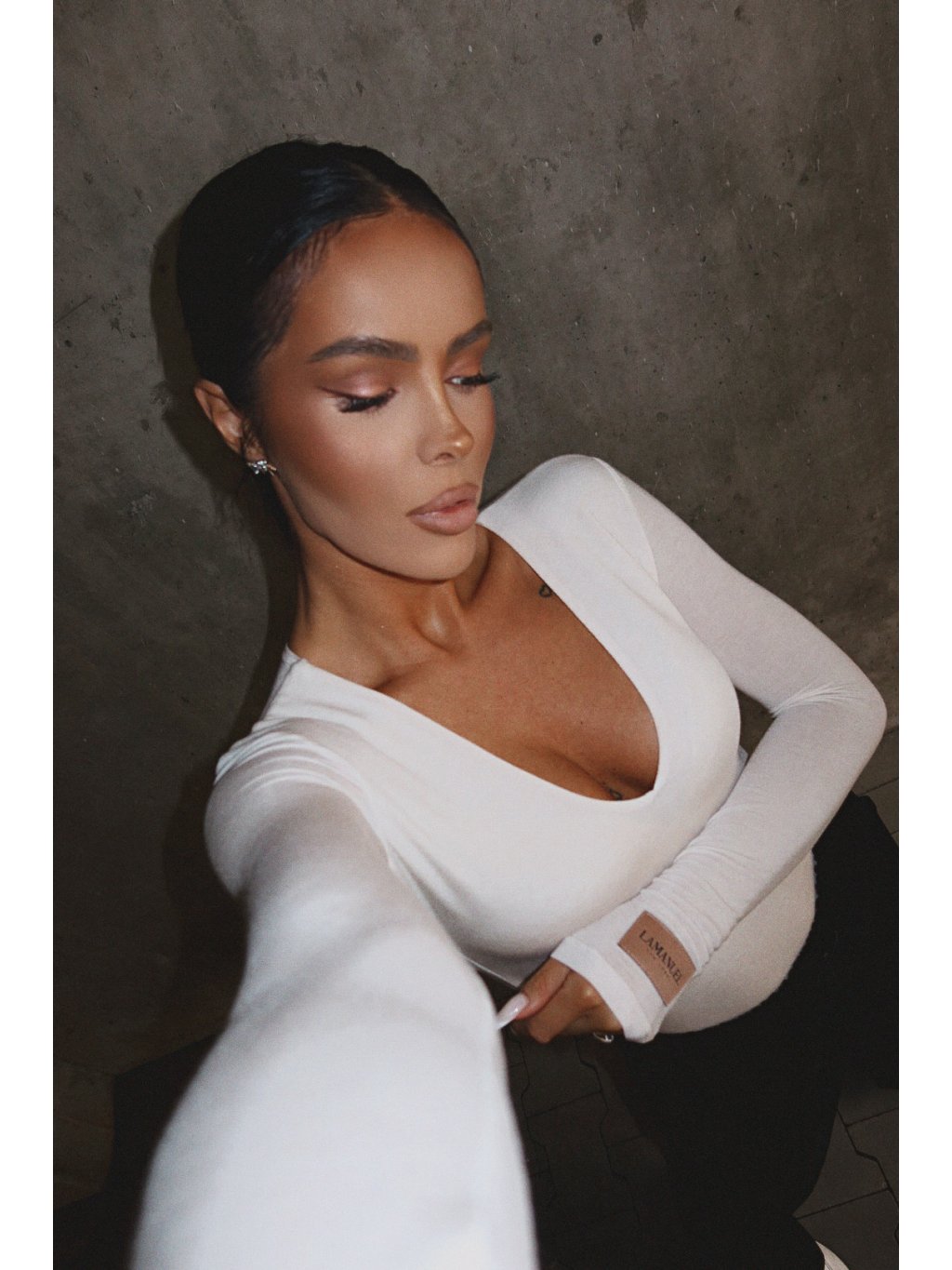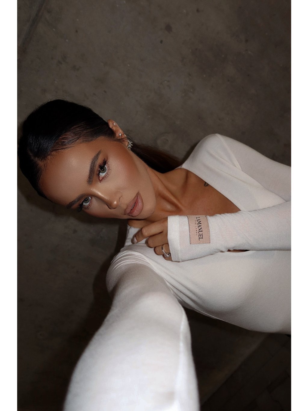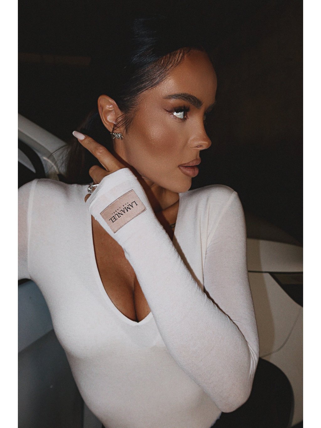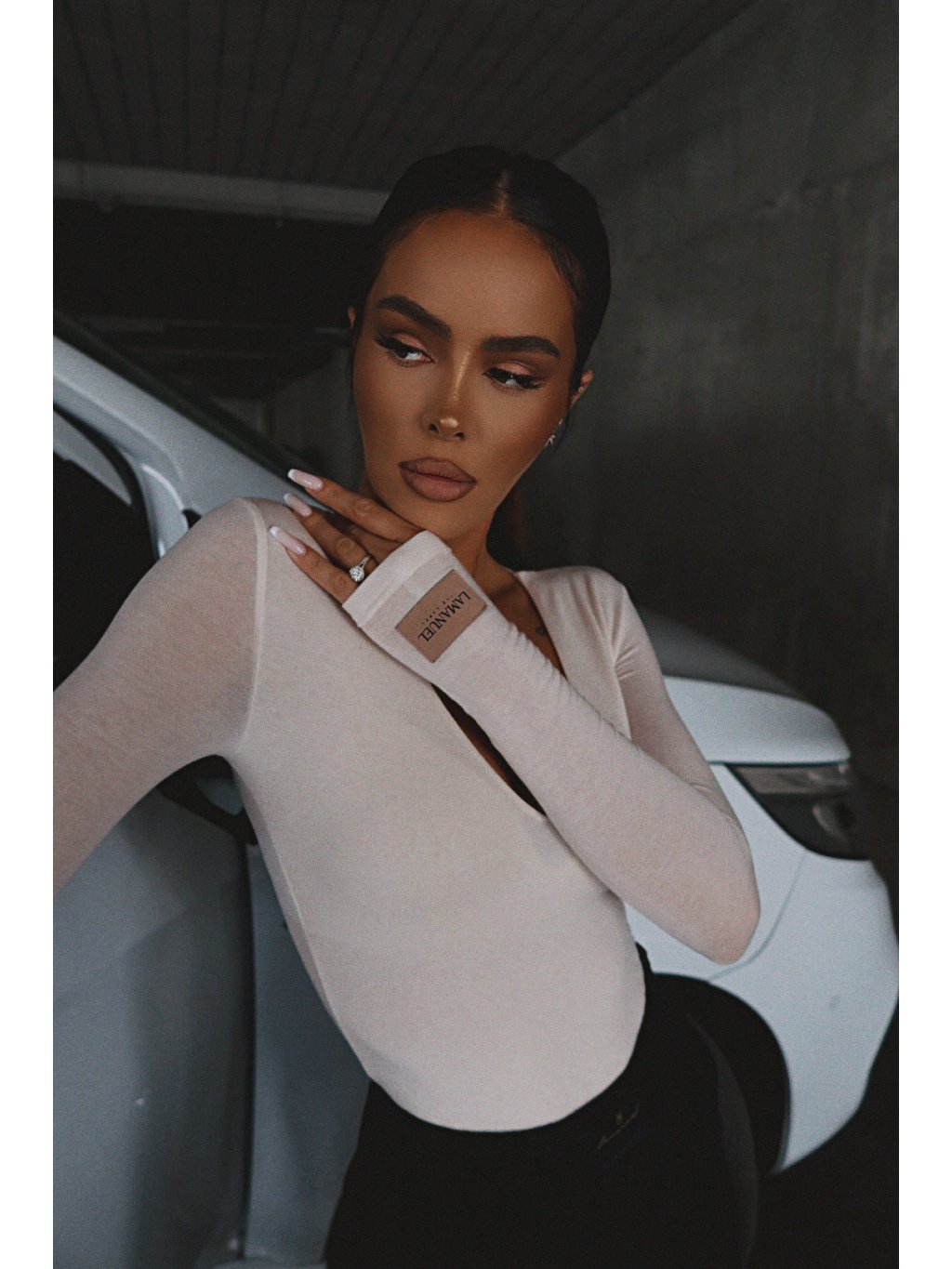 Body je vyrobené z extrémne mäkkej svetrovej pleteniny, ktorá poskytuje pohodlie a je príjemná na dotyk. Predná strana je podšitá ďalšou vrstvou látky pre väčšie pohodlie a lepšie krytie. Vypasovaný strih krásne sedí na postave a elastický materiál sa prispôsobí telu bez pocitu napnutia. Má hlboký výstrih do V a predĺžené rukávy s nášivkou s logom na manžete. Zapínanie na háčiky a očká v rozkroku, so šnúrkou - perfektné pod vypasované nohavice alebo sukne. Univerzálny základ pre každodenný aj večerný styling.