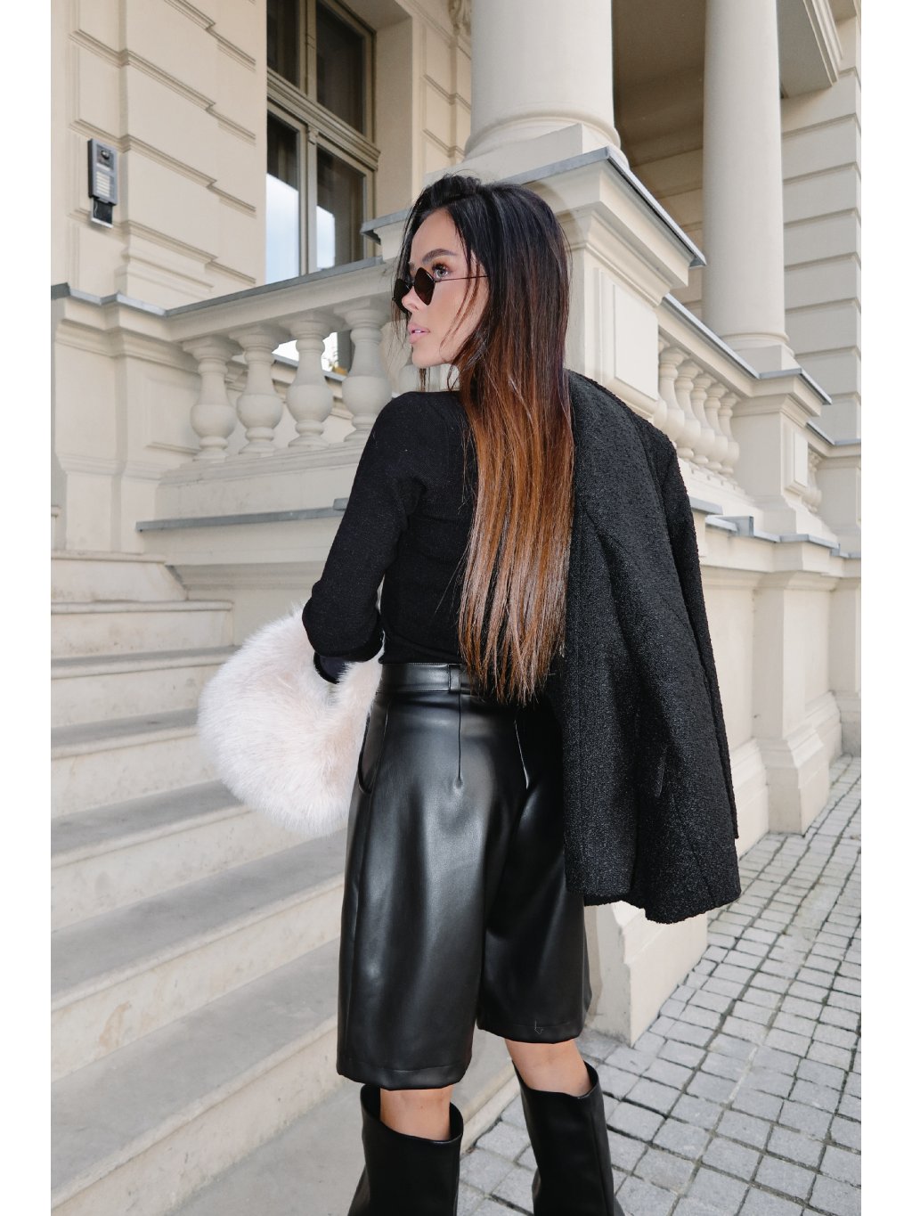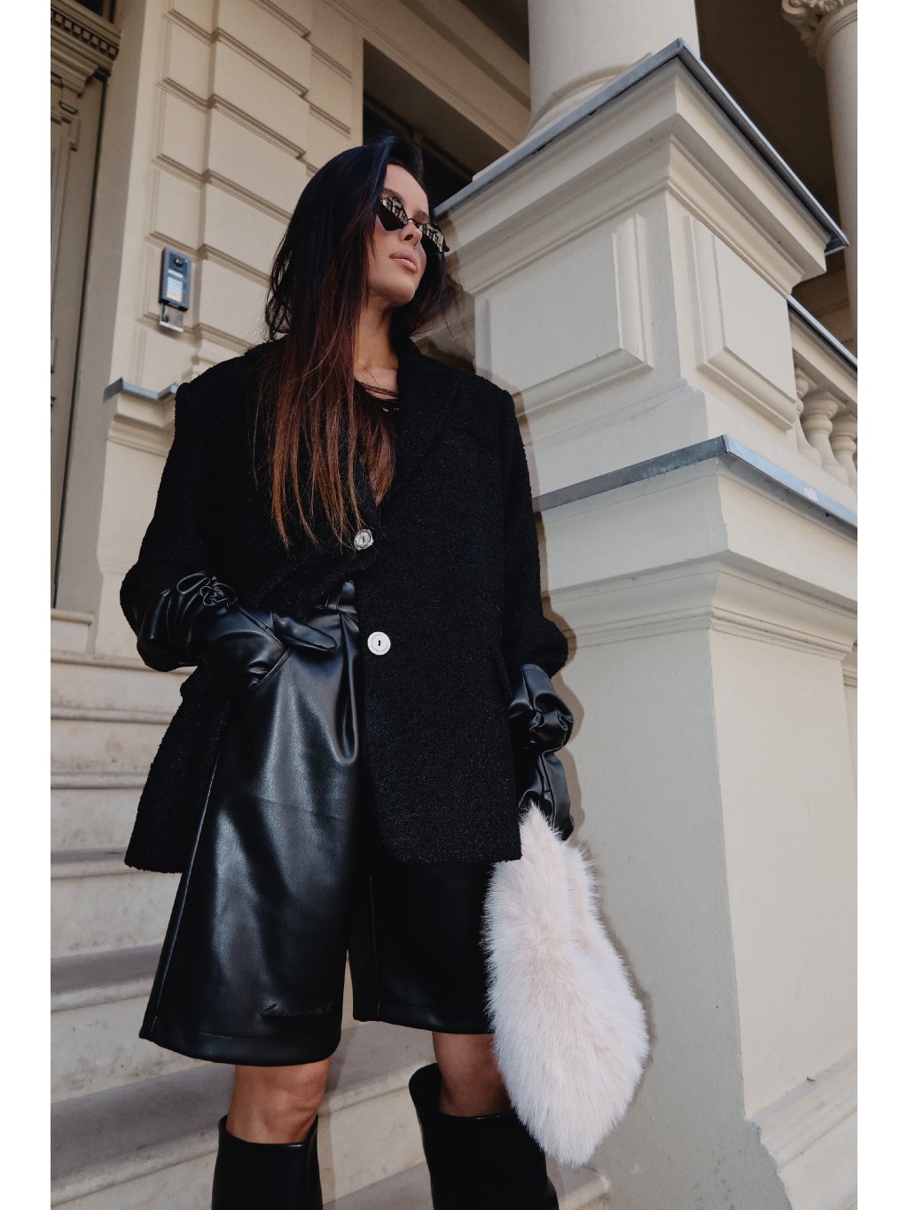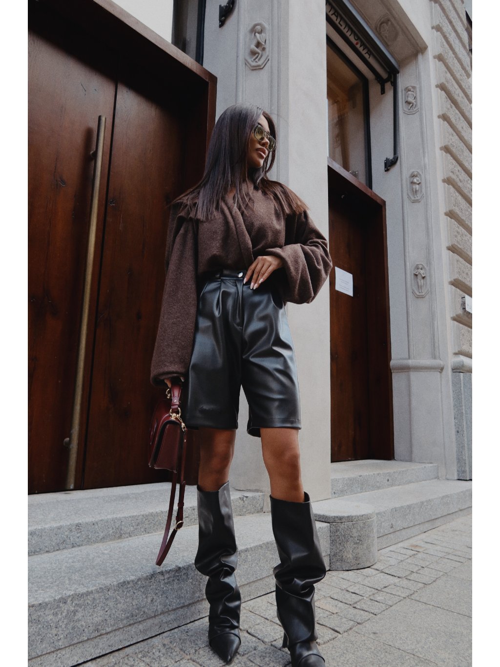Šortky z ekokože rafinovaného strihu a mierne predĺžených nohavíc. Elegantné prehyby na prednej strane a mierne voľný tvar im dodávajú nonšalantný šik a vyšívané logo na nohe zdôrazňuje charakter celku. Zapínajú sa na zips a patentku, perfektne sedia v páse a hodia sa k svetrom, košeliam alebo bundám. Štýlový šmrnc vo vašom každodennom šatníku.
