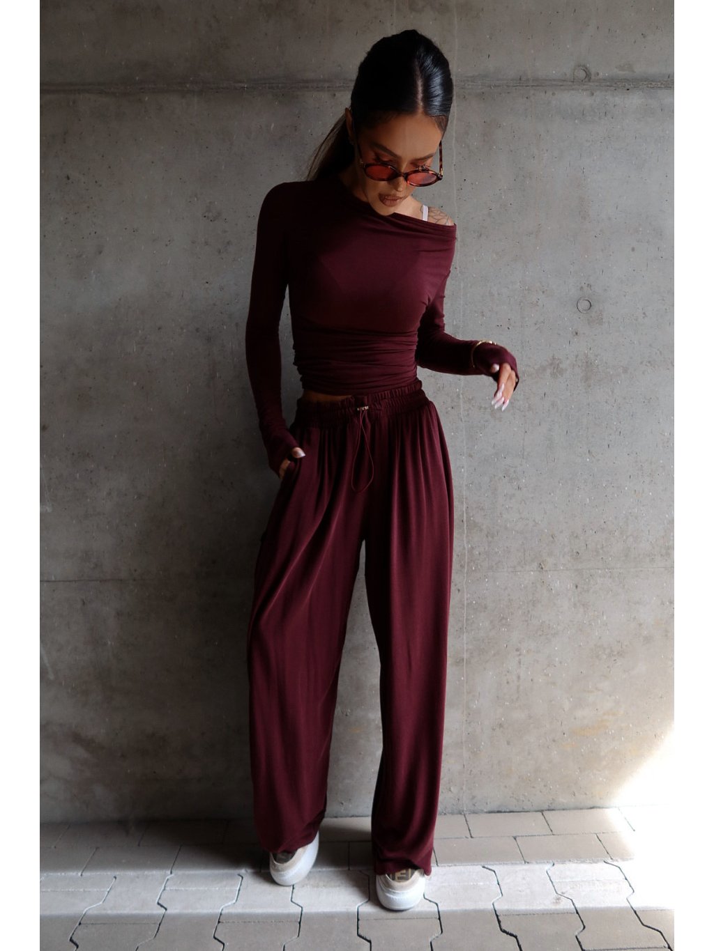 Široké nohavice vyrobené z extrémne mäkkého a splývavého svetra pleteniny, ktorá príjemne obopína telo. Model s veľmi voľným strihom – vďaka elastickému pásu a širokým nohaviciam bude dobre sedieť aj na XL postave. Vybavený bočnými vreckami a sťahovacou šnúrkou na nastavenie v páse. Pohodlné, štýlové a všestranné – ideálne na každodenné nosenie alebo cestovanie.