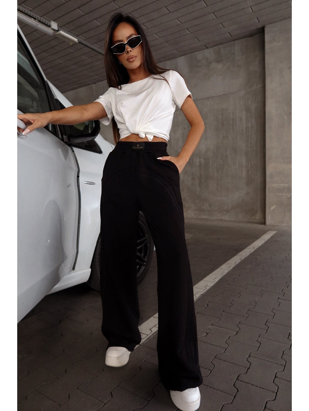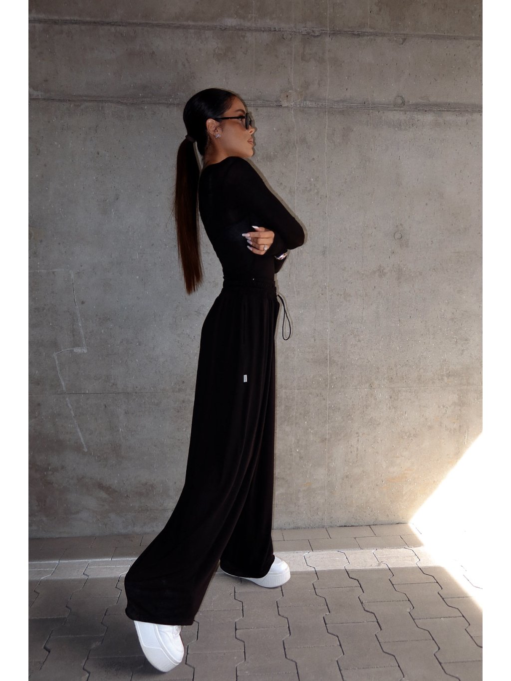 Široké nohavice vyrobené z extrémne mäkkého a splývavého svetra pleteniny, ktorá príjemne obopína telo. Model s veľmi voľným strihom – vďaka elastickému pásu a širokým nohaviciam bude dobre sedieť aj na XL postave. Vybavený bočnými vreckami a sťahovacou šnúrkou na nastavenie v páse. Pohodlné, štýlové a všestranné – ideálne na každodenné nosenie alebo cestovanie.