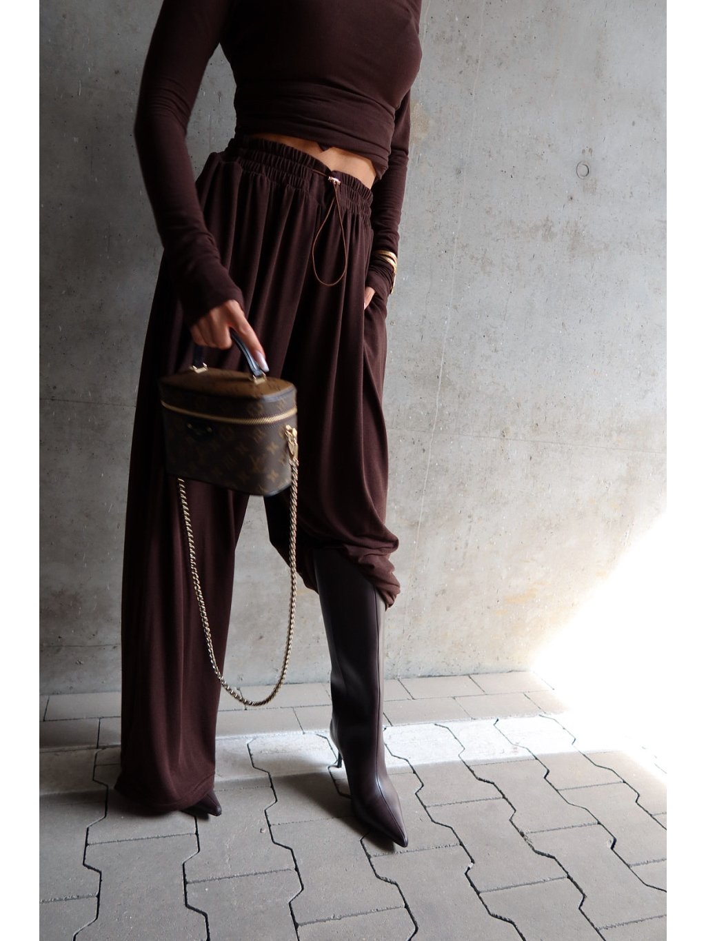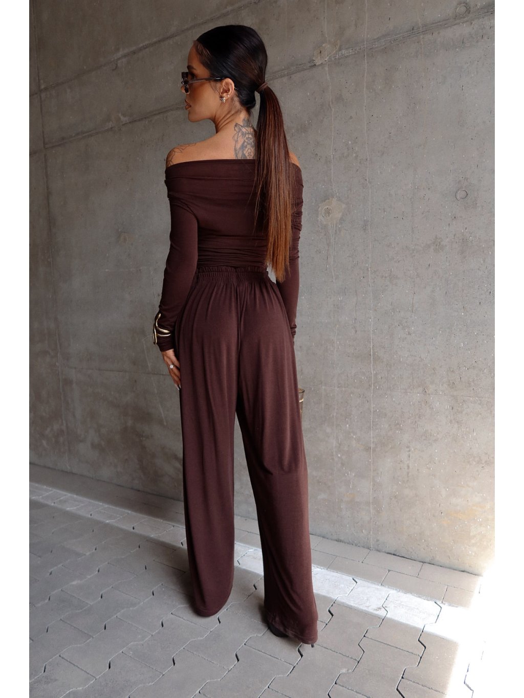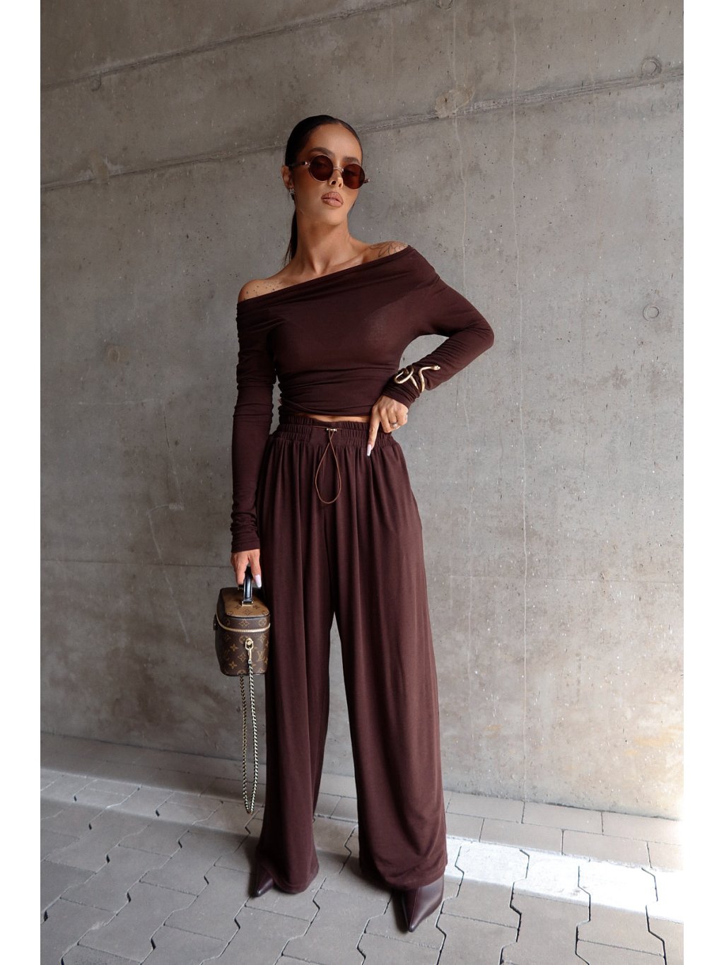 Široké nohavice vyrobené z extrémne mäkkého a splývavého svetra pleteniny, ktorá príjemne obopína telo. Model s veľmi voľným strihom – vďaka elastickému pásu a širokým nohaviciam bude dobre sedieť aj na XL postave. Vybavený bočnými vreckami a sťahovacou šnúrkou na nastavenie v páse. Pohodlné, štýlové a všestranné – ideálne na každodenné nosenie alebo cestovanie.