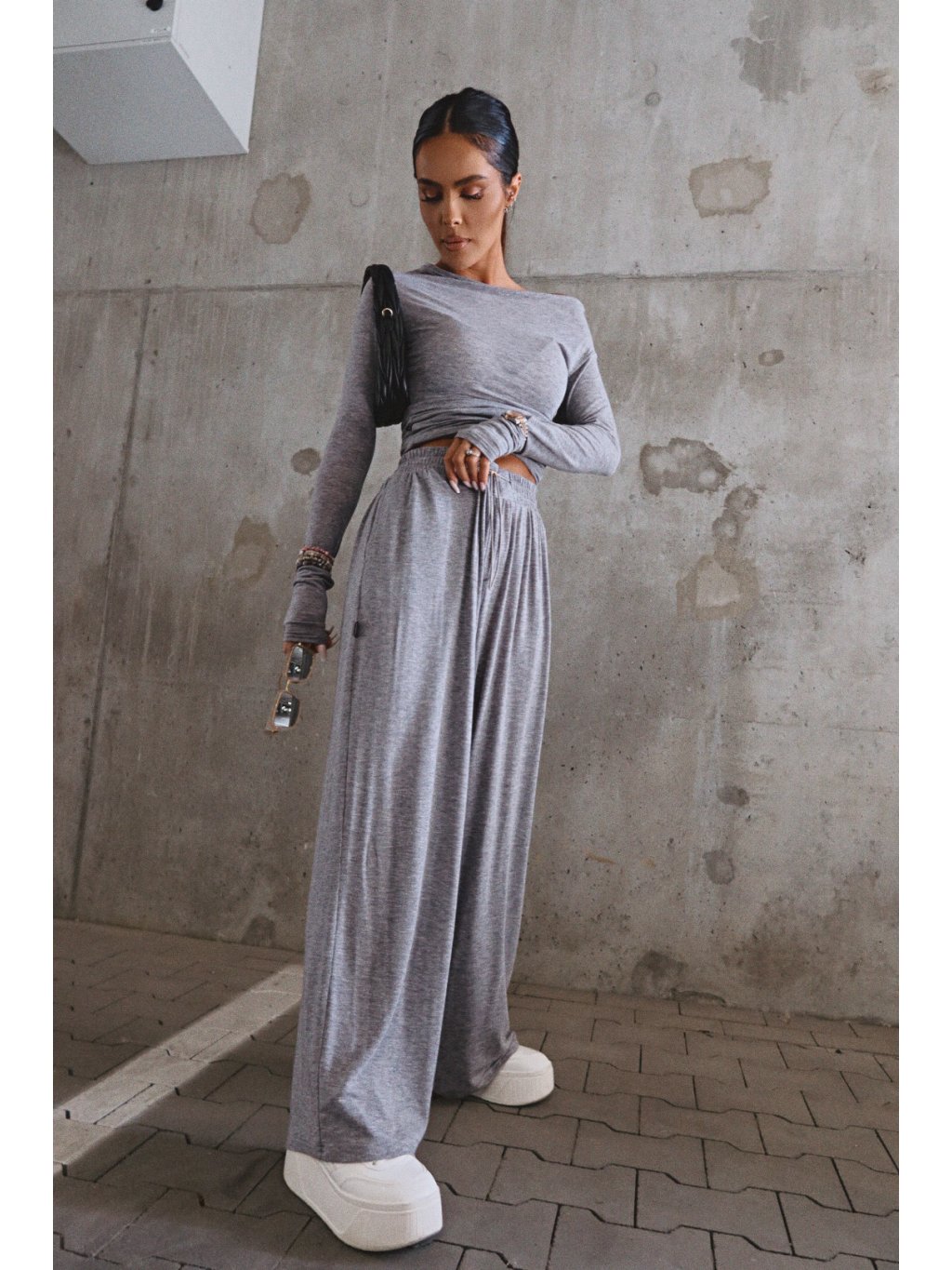 Široké nohavice vyrobené z extrémne mäkkého a splývavého svetra pleteniny, ktorá príjemne obopína telo. Model s veľmi voľným strihom – vďaka elastickému pásu a širokým nohaviciam bude dobre sedieť aj na XL postave. Vybavený bočnými vreckami a sťahovacou šnúrkou na nastavenie v páse. Pohodlné, štýlové a všestranné – ideálne na každodenné nosenie alebo cestovanie.