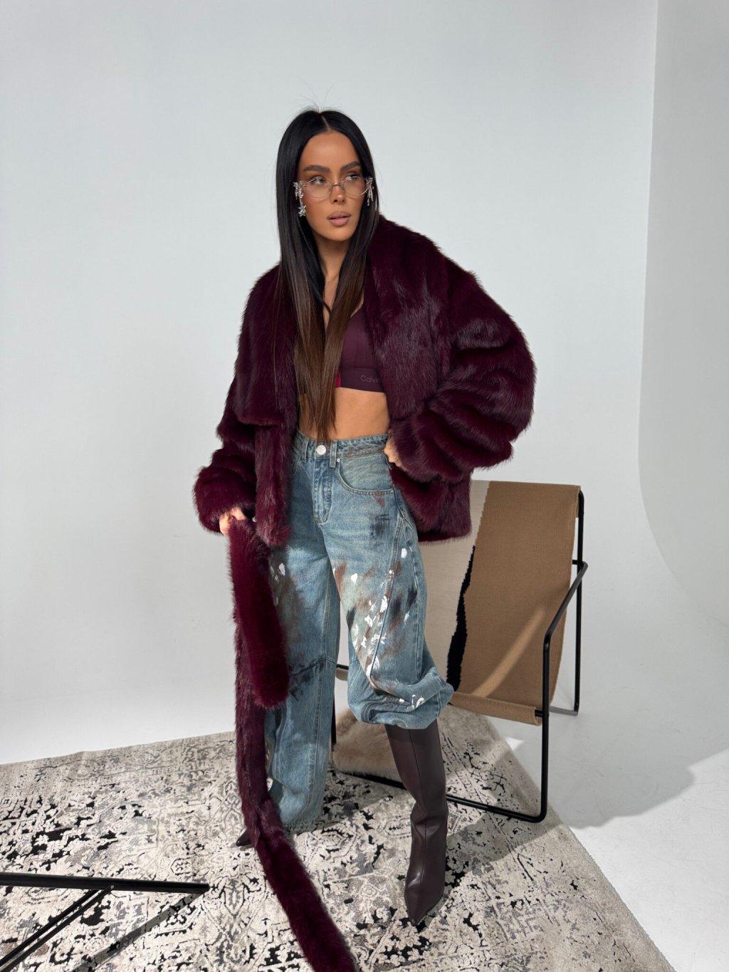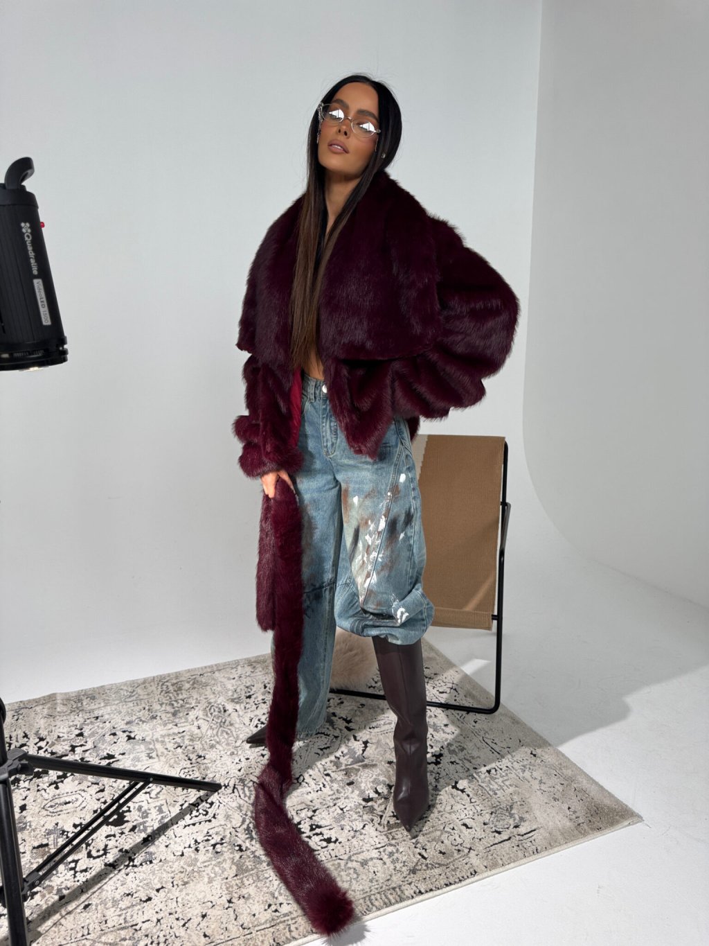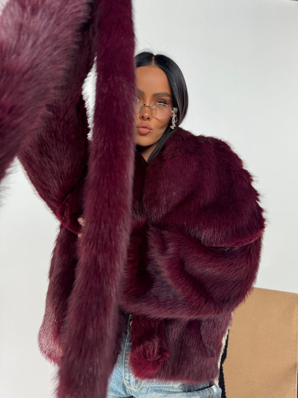 Jedinečný kožuch s luxusným vzhľadom a ženskou postavou. Mäsitá, hustá látka napodobňujúca prirodzenú srsť dodáva celému dielu eleganciu a zároveň účinne chráni pred chladom. Model s objemným golierom, mierne zníženou líniou ramien a opaskom v páse, ktorá krásne zvýrazňuje siluetu. Dĺžka po boky ho robí vhodným na nohavice aj šaty. Pohodlné, nasúvacie rukávy a premyslený strih zabezpečujú pohodlie nosenia a štýlový efekt bez námahy. MUST HAVE sezóny pre ženy, ktoré si cenia štýl, pohodlie a kvalitu spracovania.
