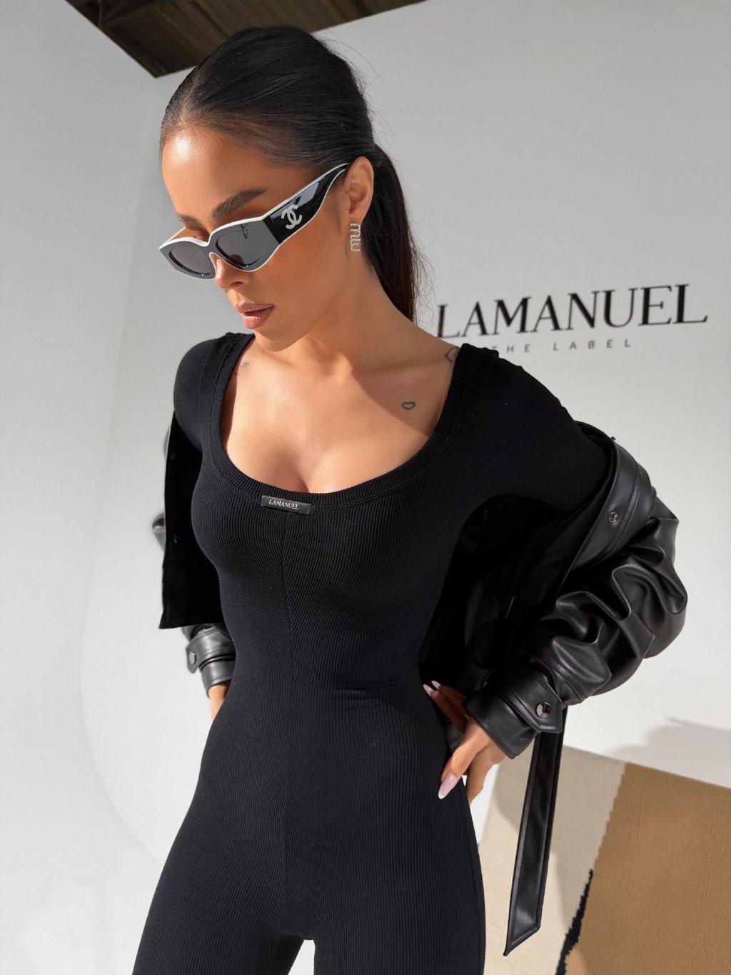 Priliehavý čierny overal s hlbokým výstrihom vpredu aj vzadu, ktorý zvýrazní krivky, predĺži siluetu a pôsobí sebavedomo a žensky bez zbytočných detailov.