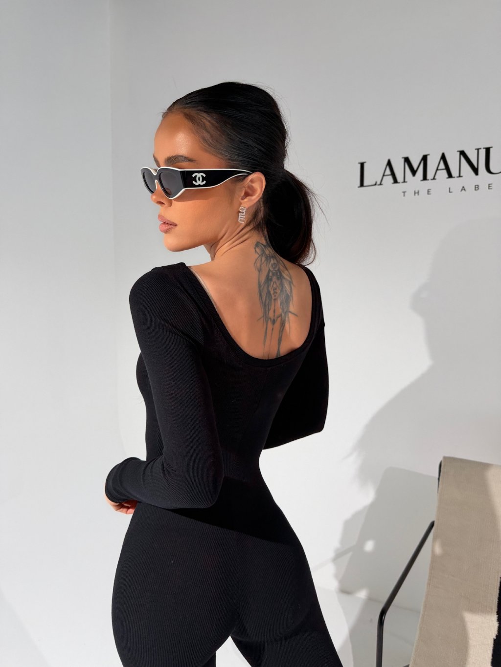 Hlboký výstrih vpredu aj vzadu dodáva modelu výrazný, ženský a sebavedomý charakter, bez toho aby pôsobil prvoplánovo. Čisté línie a minimalistický strih nechávajú vyniknúť siluetu a predlžujú postavu.