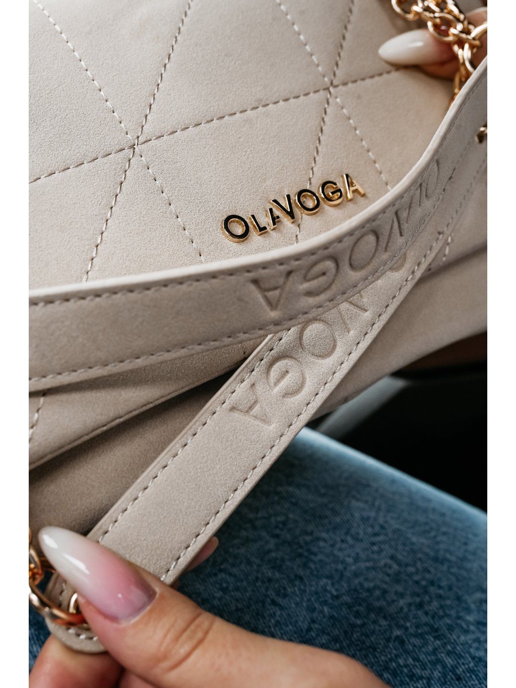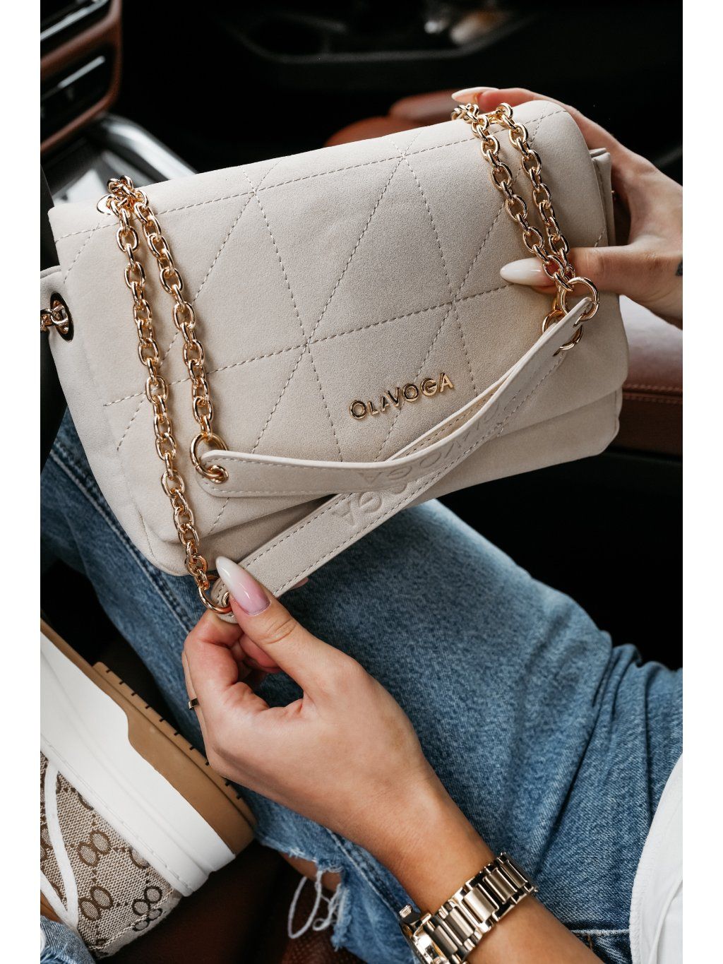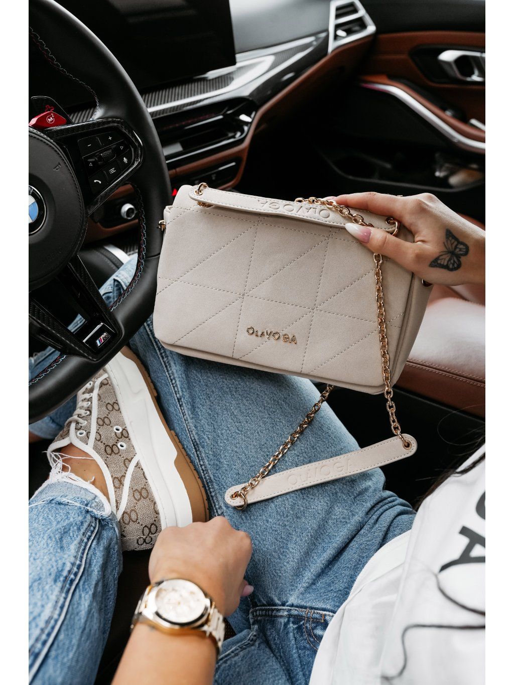 Kabelka má spevnený tvar, vďaka čomu si drží svoju formu a pôsobí upravene pri každom nosení. Zlaté kovové detaily a logo OLAVOGA dodávajú modelu luxusný charakter, zatiaľ čo kombinácia retiazky a pevného popruhu zabezpečuje pohodlné nosenie na ramene aj v ruke.
