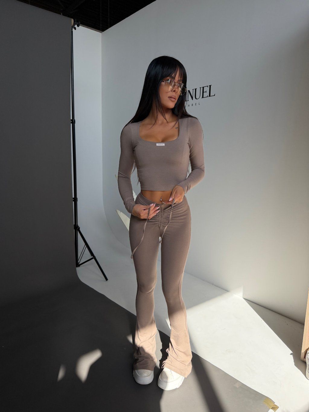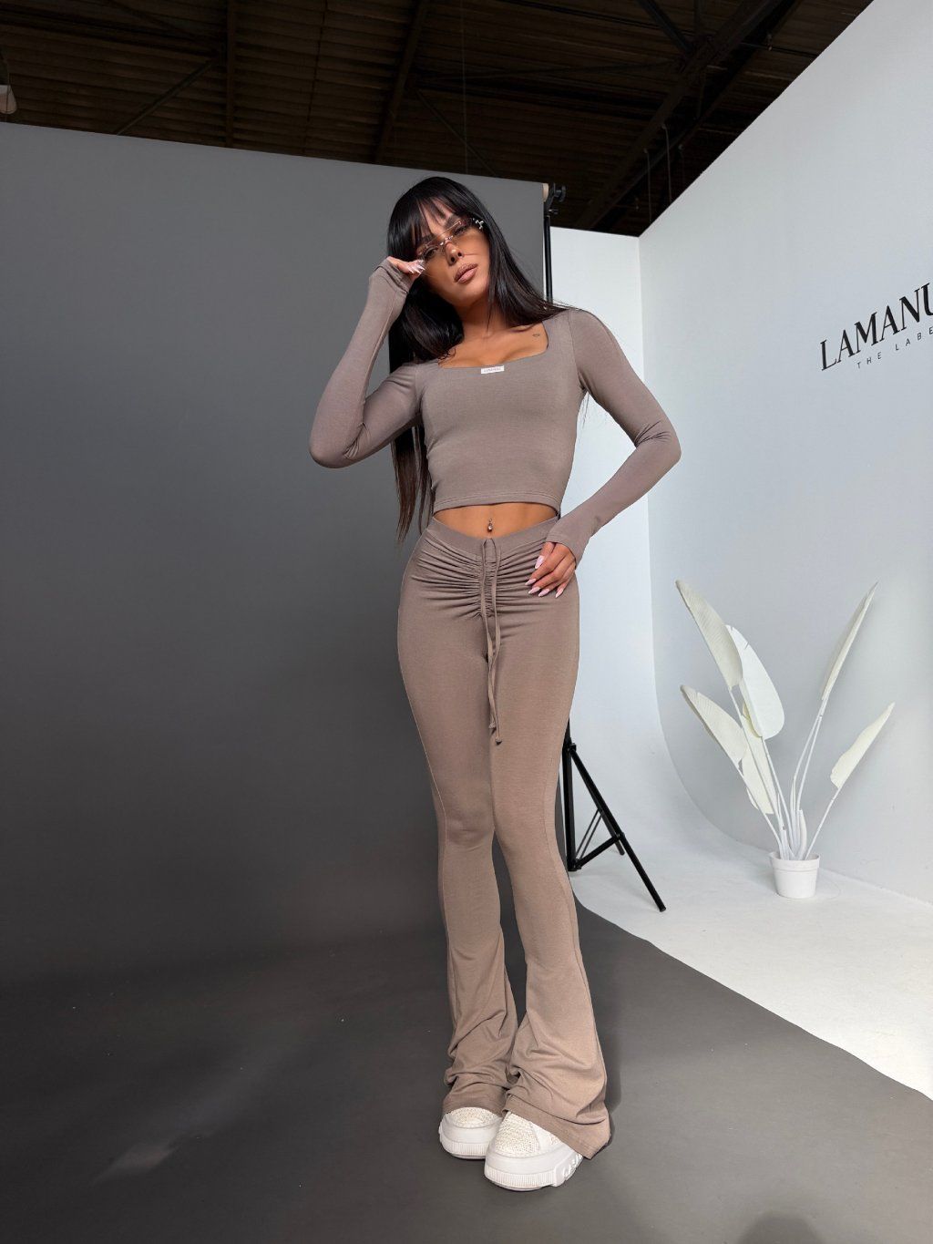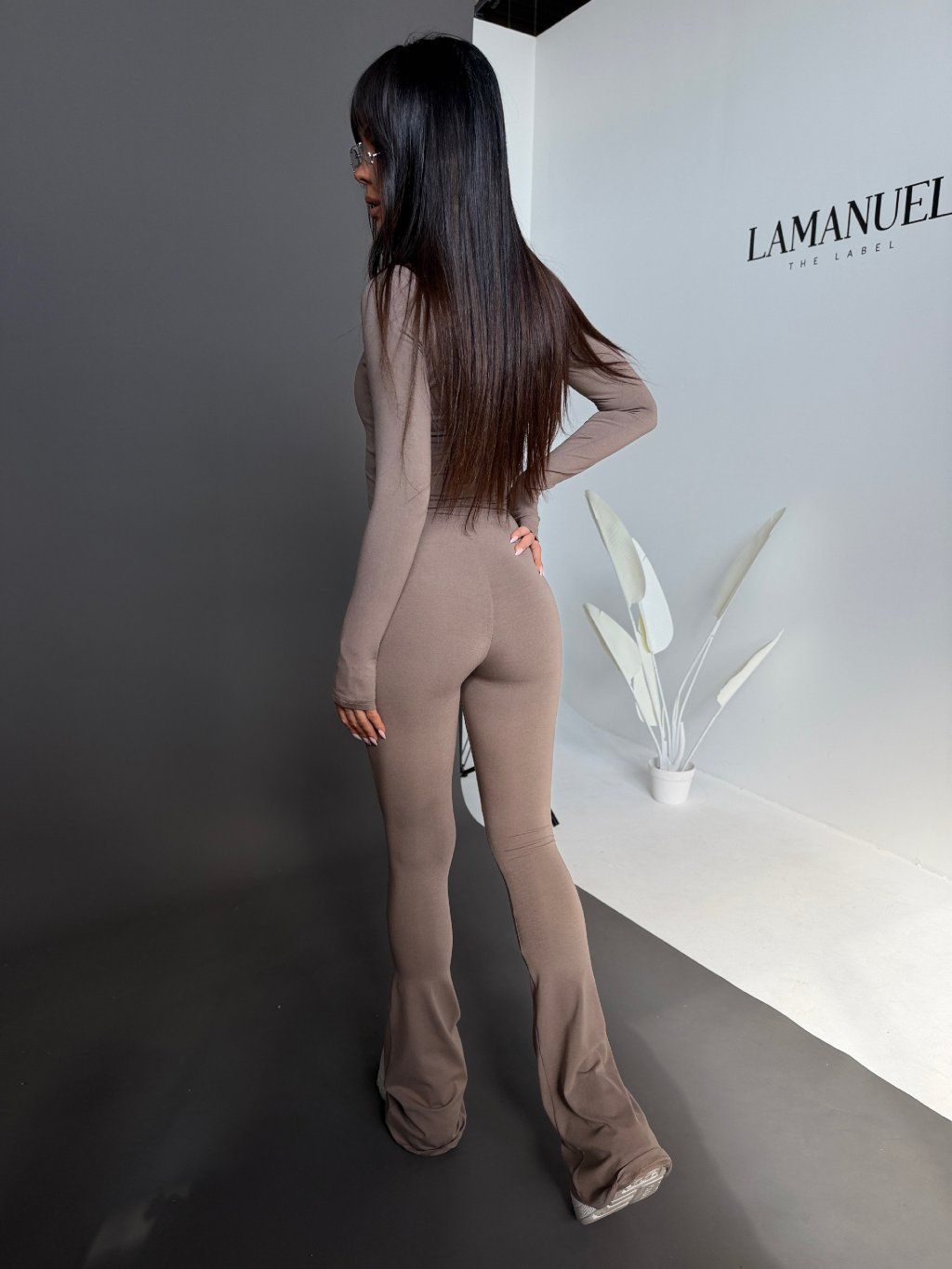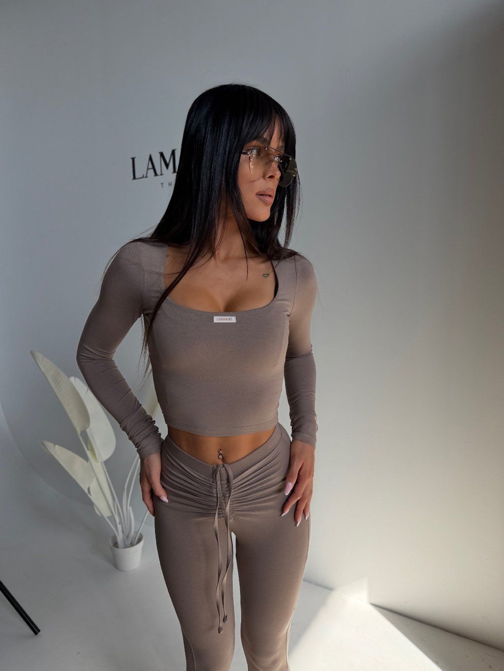 Top krásne obopne siluetu, zvýrazní dekolt a vďaka dlhým rukávom pôsobí elegantne a vyvážene. Legíny s priliehavým strihom kopírujú postavu, zatiaľ čo jemne rozšírené spodné línie dodávajú celému outfitu moderný a predlžujúci efekt.