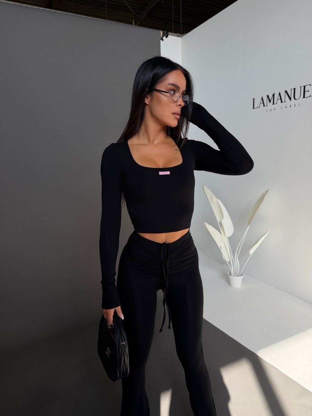 Top krásne obopne siluetu, zvýrazní dekolt a vďaka dlhým rukávom pôsobí elegantne a vyvážene. Legíny s priliehavým strihom kopírujú postavu, zatiaľ čo jemne rozšírené spodné línie dodávajú celému outfitu moderný a predlžujúci efekt.