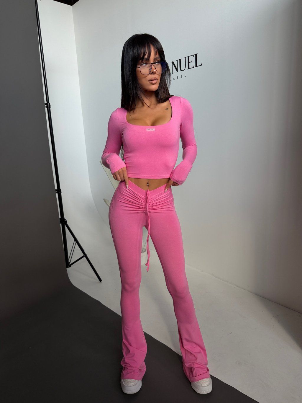 Top krásne obopne siluetu, zvýrazní dekolt a vďaka dlhým rukávom pôsobí elegantne a vyvážene. Legíny s priliehavým strihom kopírujú postavu, zatiaľ čo jemne rozšírené spodné línie dodávajú celému outfitu moderný a predlžujúci efekt.