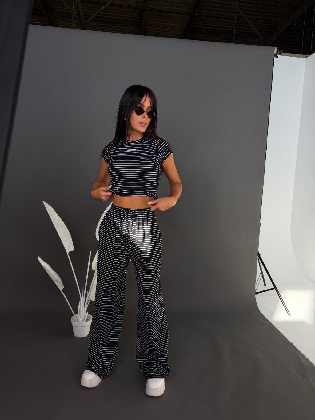 Top s klasickým strihom krásne sedí na postave a vytvára vyvážený kontrast k voľnejším nohaviciam. Celý komplet pôsobí minimalisticky, čisto a moderne – bez zbytočnej námahy.