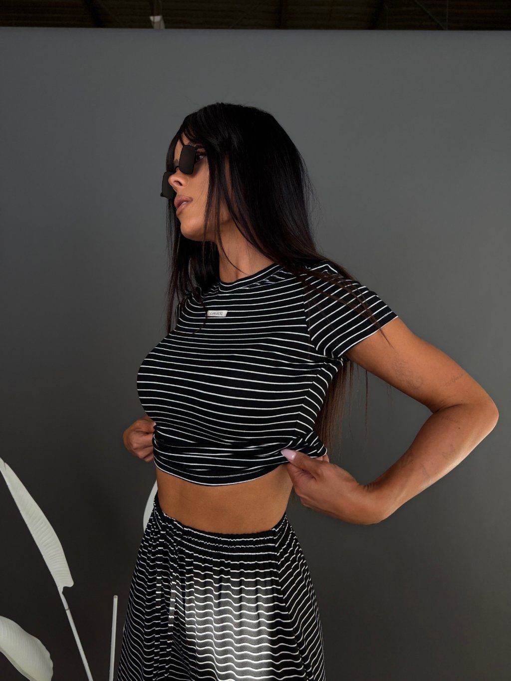 Dlhší top s krátkym rukávom sa ľahko kombinuje aj samostatne a nohavice s voľnejším strihom vytvárajú modernú siluetu, ktorá pôsobí ležérne a žensky zároveň.