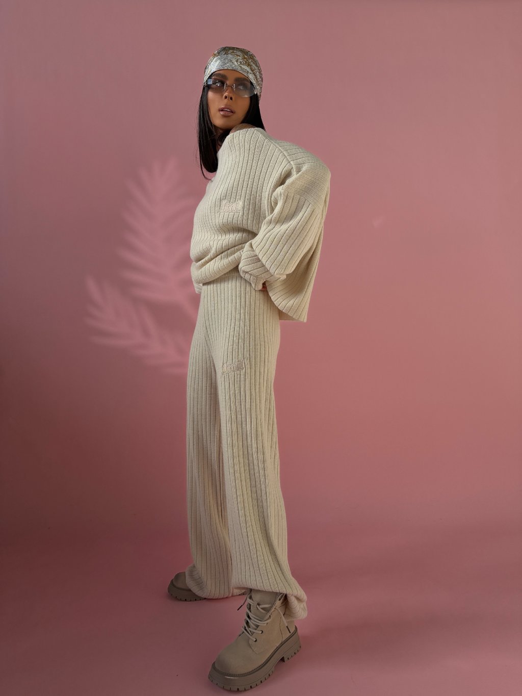 Voľnejší sveter s objemnými rukávmi vytvára moderný oversized efekt, zatiaľ čo nohavice s vysokým pásom a rovnou nohavicou opticky predlžujú postavu. Materiál je mäkký, pružný a veľmi príjemný na nosenie, takže komplet pôsobí pohodlne a zároveň štýlovo.