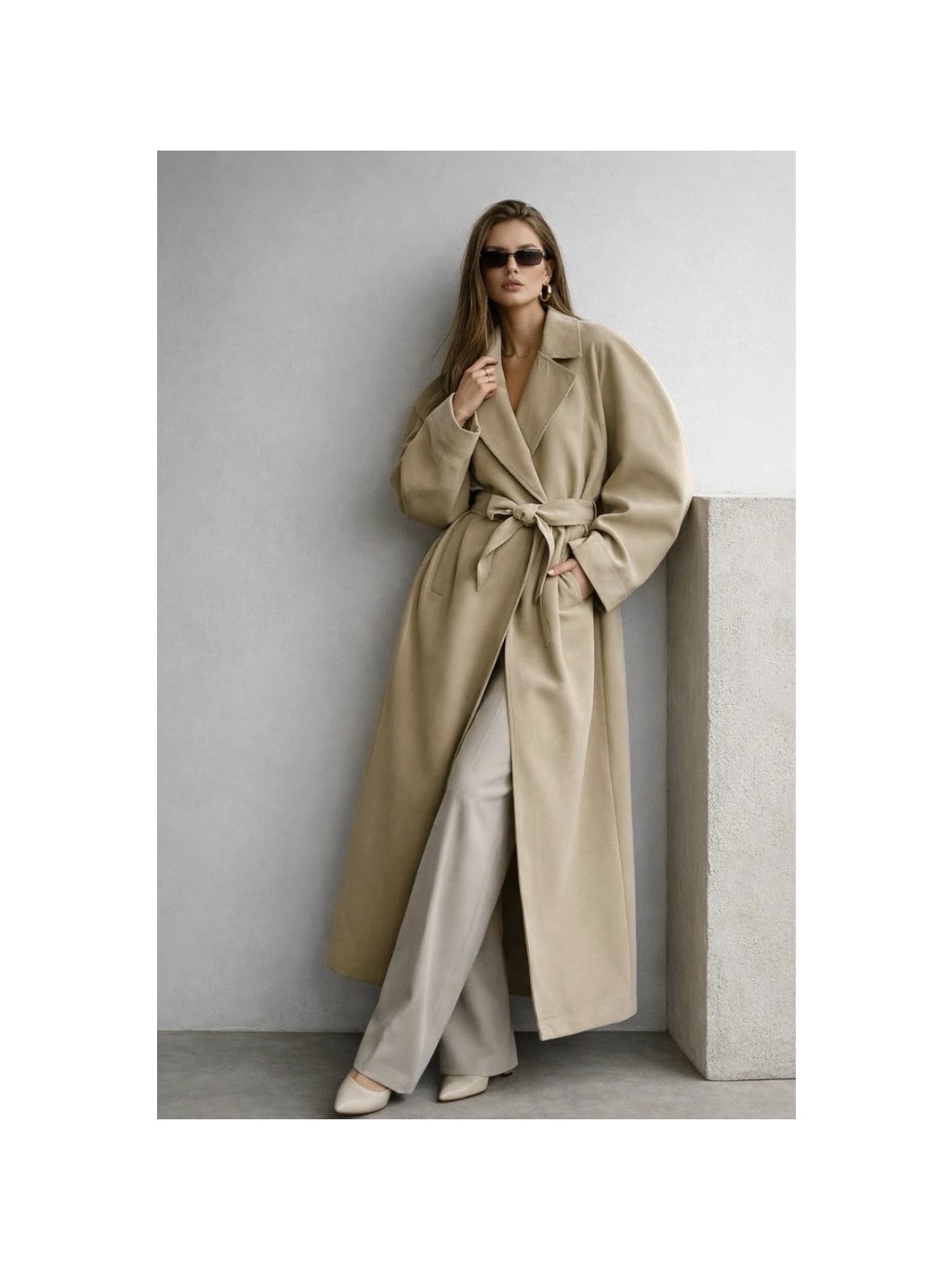 Kabát krásne drží tvar, v páse sa dá stiahnuť opaskom a tým zvýrazniť siluetu. pôsobí luxusne, ale nie prehnane - presne tak, aby si v ňom vyzerala upravene, sebavedomo a štýlovo v každej situácii.