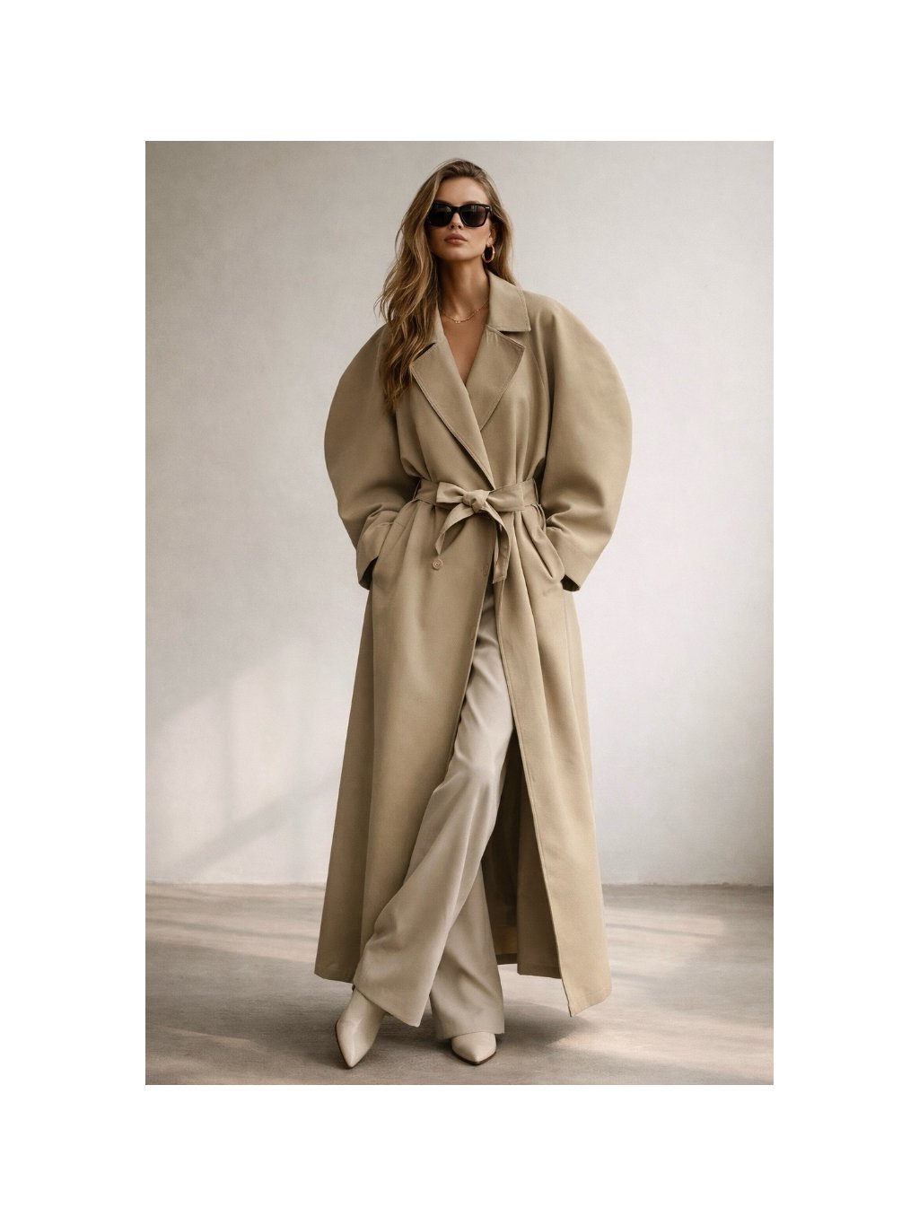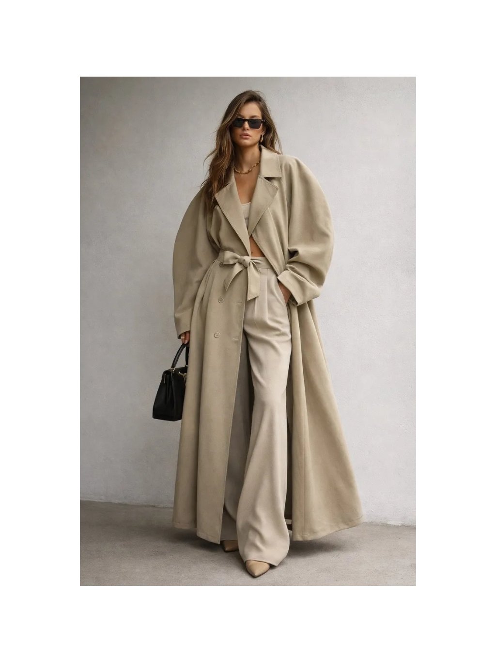 Luxusný oversize trenčkot s výraznými rukávmi a opaskom v páse, ktorý vytvára modernú a veľmi elegantnú siluetu. Ideálny pre ženy, ktoré chcú vyniknúť štýlovo a s noblesou.