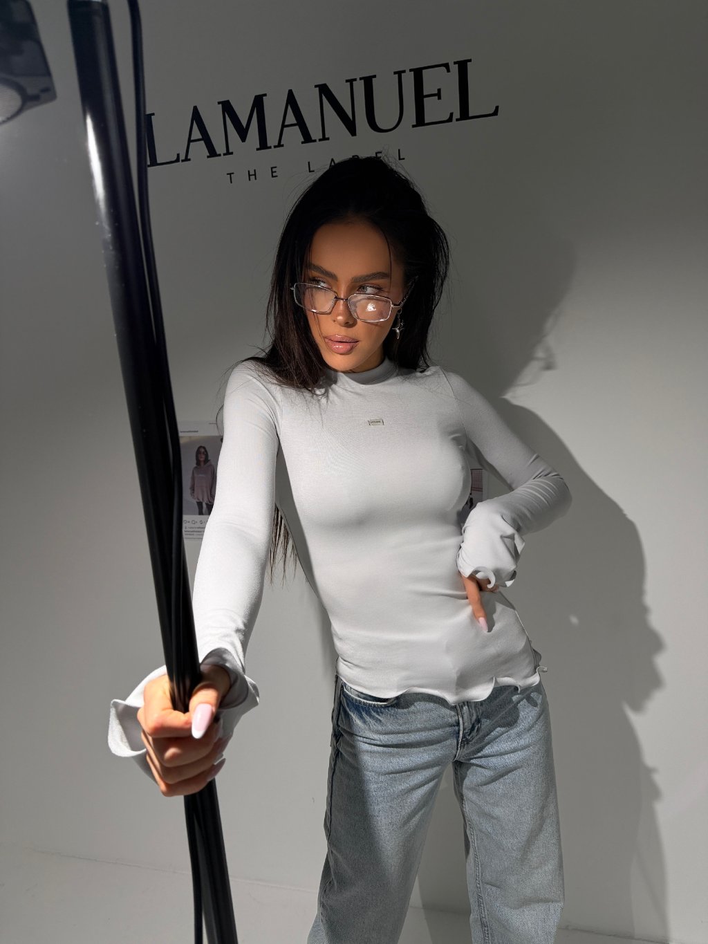 Minimalistický priliehavý top s jemne zvlneným lemom a predĺženými rukávmi.