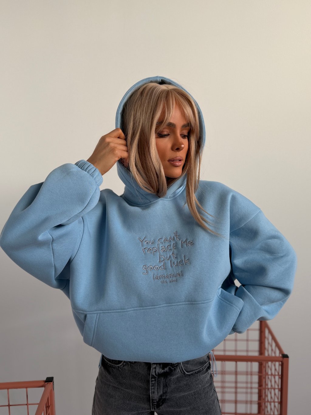 Oversize mikina BLOW UP s kapucňou a výšivkou - modrá oversize strih, kapucňa, nastaviteľný spodok