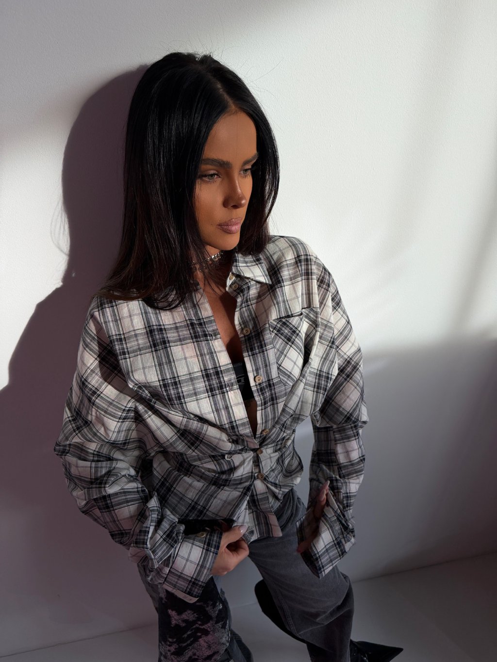 Luźniejszy krój, klasyczny kołnierzyk oraz kieszeń na piersi nadają modelowi swobodny charakter. Dzięki dodatkowym guzikom po bokach koszulę można zapiąć w talii, tworząc bardziej kobiecą sylwetkę, lub nosić ją luźno dla naturalnego, miejskiego stylu.